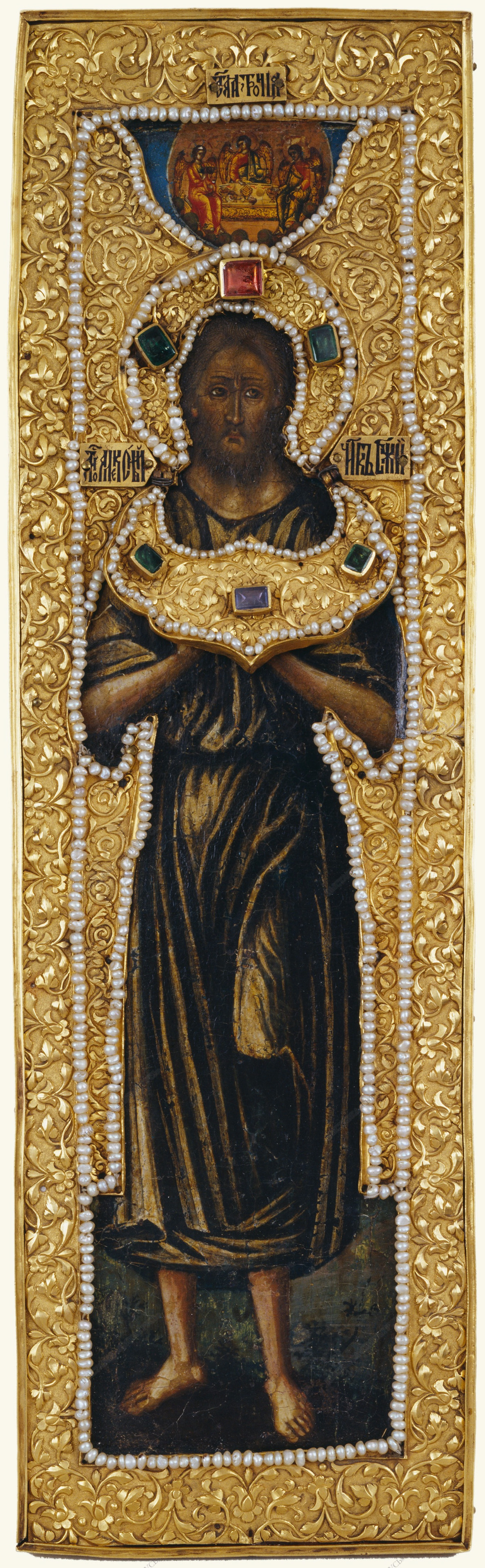1597 год Москва, Мастерские Московского Кремля Золото, изумруды, сапфиры, шпинели; ковка, чеканка, чернь, огранка, шлифовка 24 х 16 х 16 Поступил в 1920 году На поддоне в клеймах надпись вязью: СИЙ ПОТЫР В ДОМ СТЫЯ И ЖИВОНАЧАЛНЫЯ ТРОЦЫ И ВЕЛИКОМУ // ЧЮДОТВОРЦУ СЕРГИЮ ДАЛ СЛУГА И КОНЮШЕЙ И БОЯРИН // БОРИС ФЕДОРОВИЧЪ ГОДУНОВ С СВОЕЮ ЖЕНОЮ С МАРЕЮ // И З ДЕТМИ С СВОИМИ С ФЕДОРОМ ДА С ОКСИНЕЮ ЛЕТА 7105 Г. Вложен в Троице-Сергиев монастырь боярином Борисом Годуновым и членами его семьи в 1597 году. Находился в ризнице Троице-Сергиевой лавры СПМЗ инв. 136-ихо