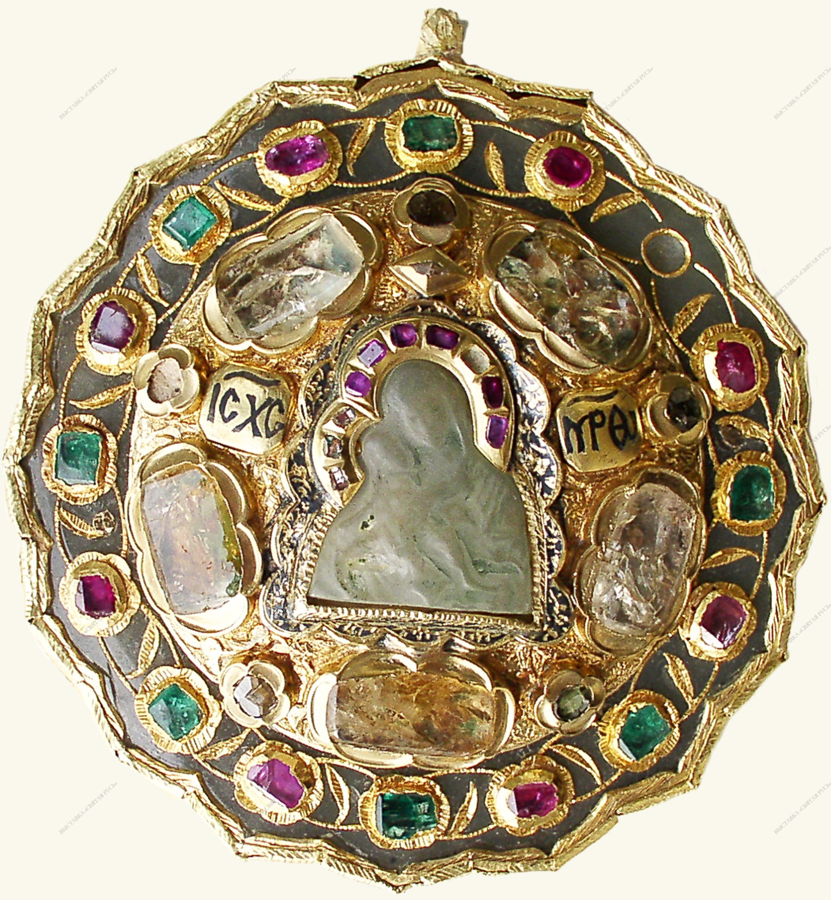 Камея – XVI век (?). Оправа – середина XVII века Камея – Христианский Восток. Оправа – Стамбул (?) Алмазы, рубины, сапфиры, изумруды, золото, оникс; эмаль, мастика; резьба, чеканка, насечка, гравировка, чернь Диаметр – 9 Поступила в 1930-е годы Находилась в захоронении патриарха Никона Реставрирована в 1979 в ВХНРЦ им. И.Э. Грабаря Ю.И. Кузнецовым Музей «Новый Иерусалим» инв. КП 6719, Б-1591, ЗВ-4