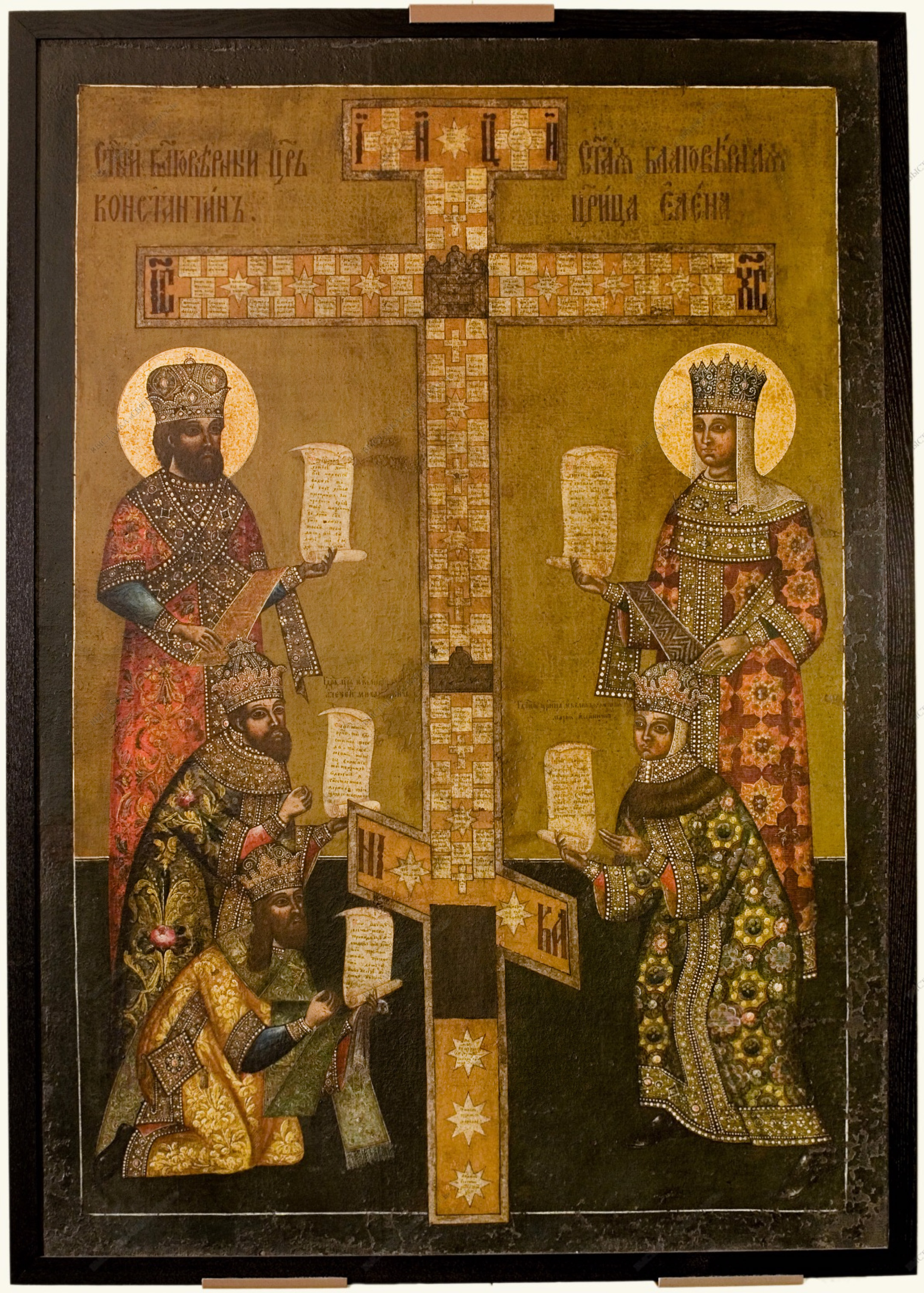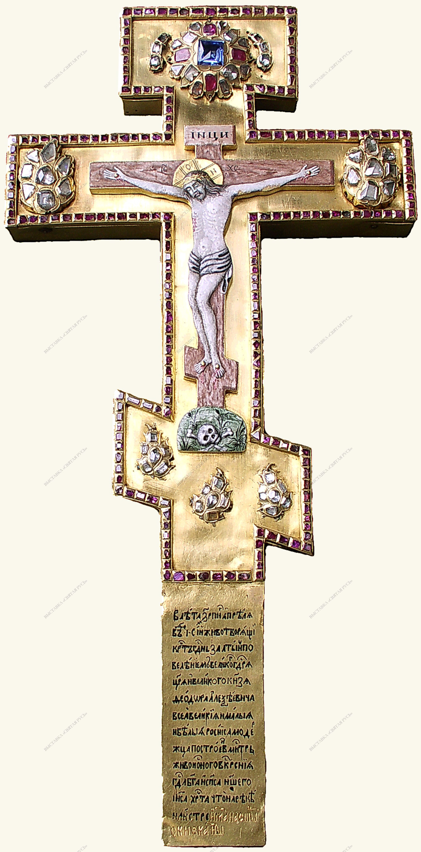 1680 год Москва Золото, дерево, металл, алмазы, рубины, сапфир; чеканка, гравировка, чернь, огранка, эмаль 42,9 х 21 х 3 Поступил в 1920 году На рукояти черневая надпись: В ЛЕТО 7188 АПРЕЛЯ В 10 ДЕНЬ СИЙ ЖИВОТВОРЯЩИЙ КРЕСТ ГОСПОДЕНЬ ЗЛАТЫЙ ПОВЕЛЕНИЕМ ВЕЛИКОГО ГОСУДАРЯ ЦАРЯ ВЕЛИКОГО КНЯЗЯ ЕДОРА АЛЕКСЕЕВИЧА ВСЕЯ ВЕЛИКИЯ МАЛЫЯ И БЕЛЫЯ РОССИИ САМОДЕРЖЦА, ПОСТРОЕН В МОНАСТЫРЕ ЖИВОНОСНОГО ВОСКРЕСЕНИЯ ГОСПОДА БОГА И СПАСА НАШЕГО ИИСУСА ХРИСТА, ЧТО НА РЕКЕ ИСТРЕ... Происходит из ризницы Воскресенского Новоиерусалимского монастыря. Вклад царя Федора Алексеевича Романова в 1680 году Музей «Новый Иерусалим» инв. КП 7328, Б-1116, ЗВ-59