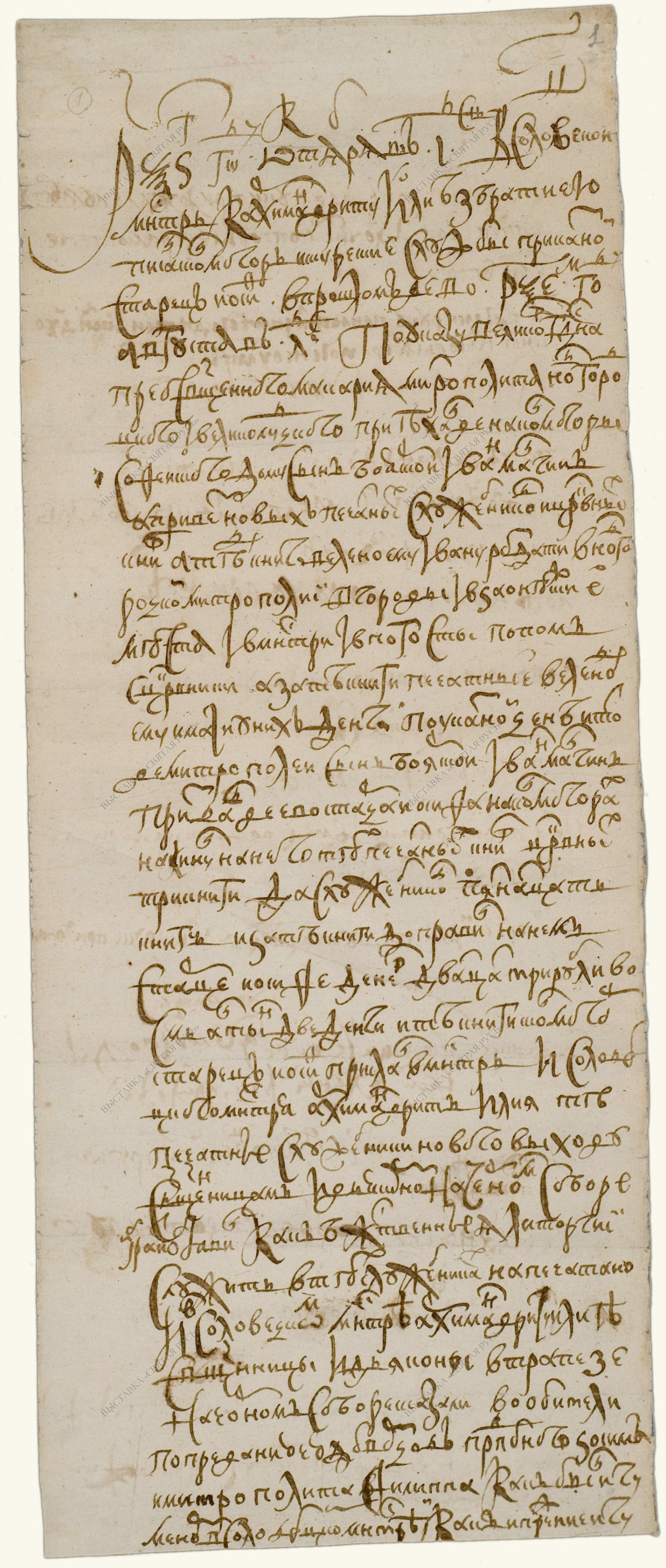 8 июня 1658 года 3 л. Бумага; чернила 45 х 16; 30 х 16; 27 х 16 Поступила в 1920 году Происходит из Синодальной патриаршей библиотеки, Москва Реставрирована в 1993 году в ГИМ ГИМ инв. 80370, ОР Син. свиток 1171