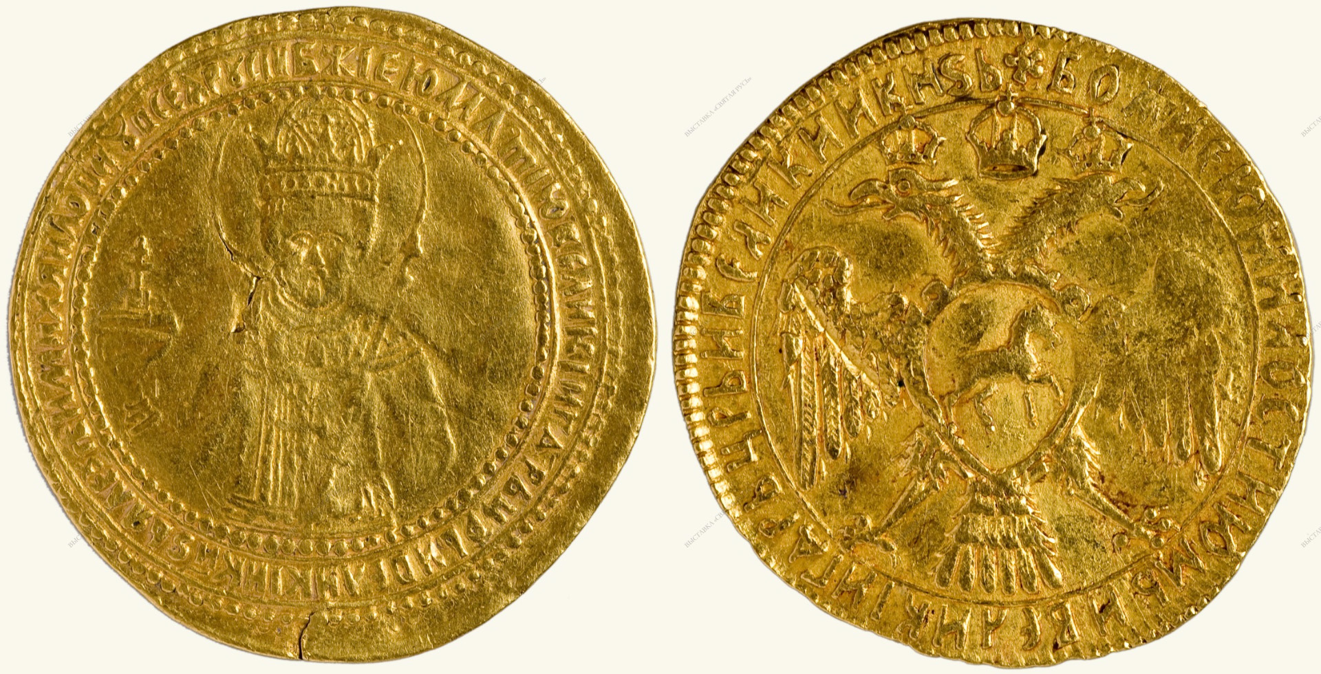 1650-е годы Москва. Царь Алексей Михайлович Золото; чеканка Диаметр – 3,1 Поступил в 1851 году из собрания Я.Я. Рейхеля ГЭ инв. ОН-Р-Аз 87