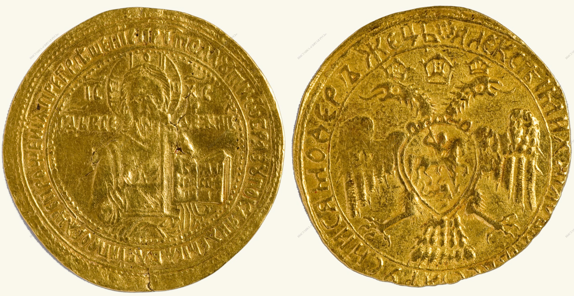 Русское подражание дукату Матвея Коровина (Венгрия, 1458–1490) Зима 1477-1478 года Великий князь Иван III и его соправитель Иван Иванович Молодой. Новгород Великий Уникум Золото; чеканка Диаметр – 2,3 Поступил в 1864 году из собрания Г. Минуса ГЭ инв. ОН-Р-Аз 19