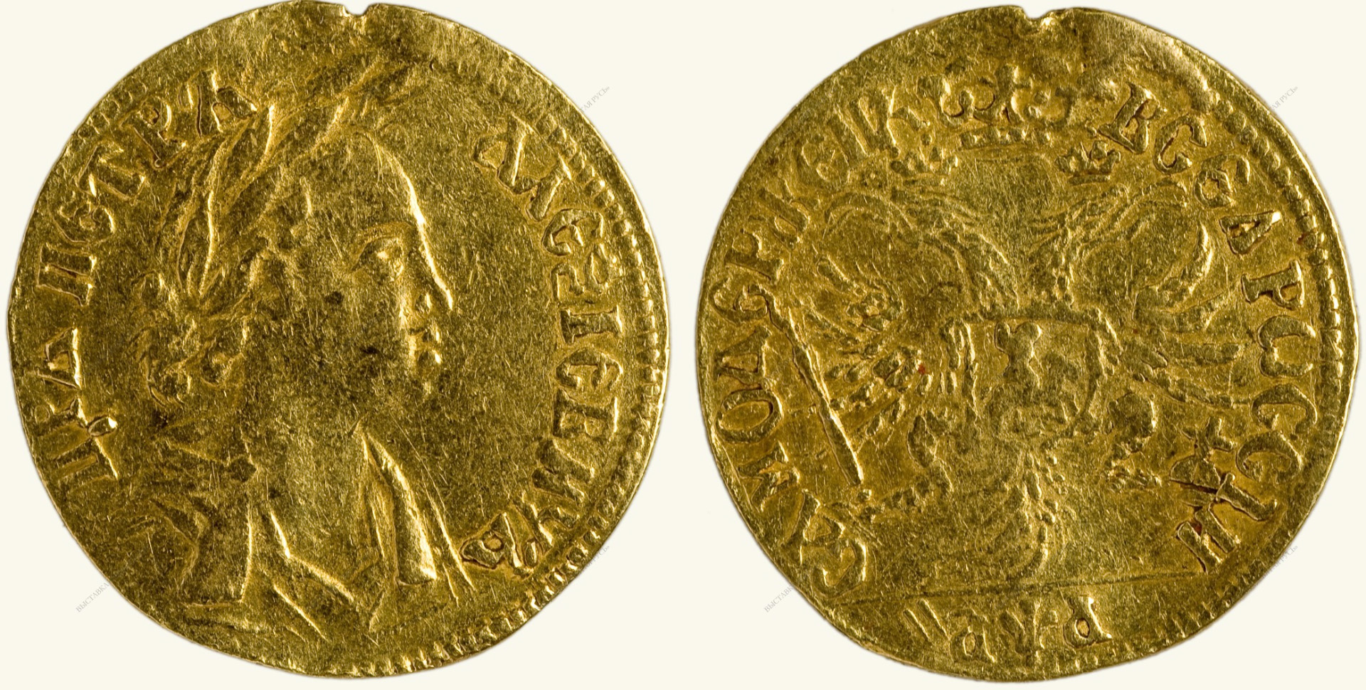 1701 год Москва. Царь Петр I Золото; чеканка Диаметр – 2,4 Поступил до 1917 года ГЭ инв. ОН-Р-Аз 176