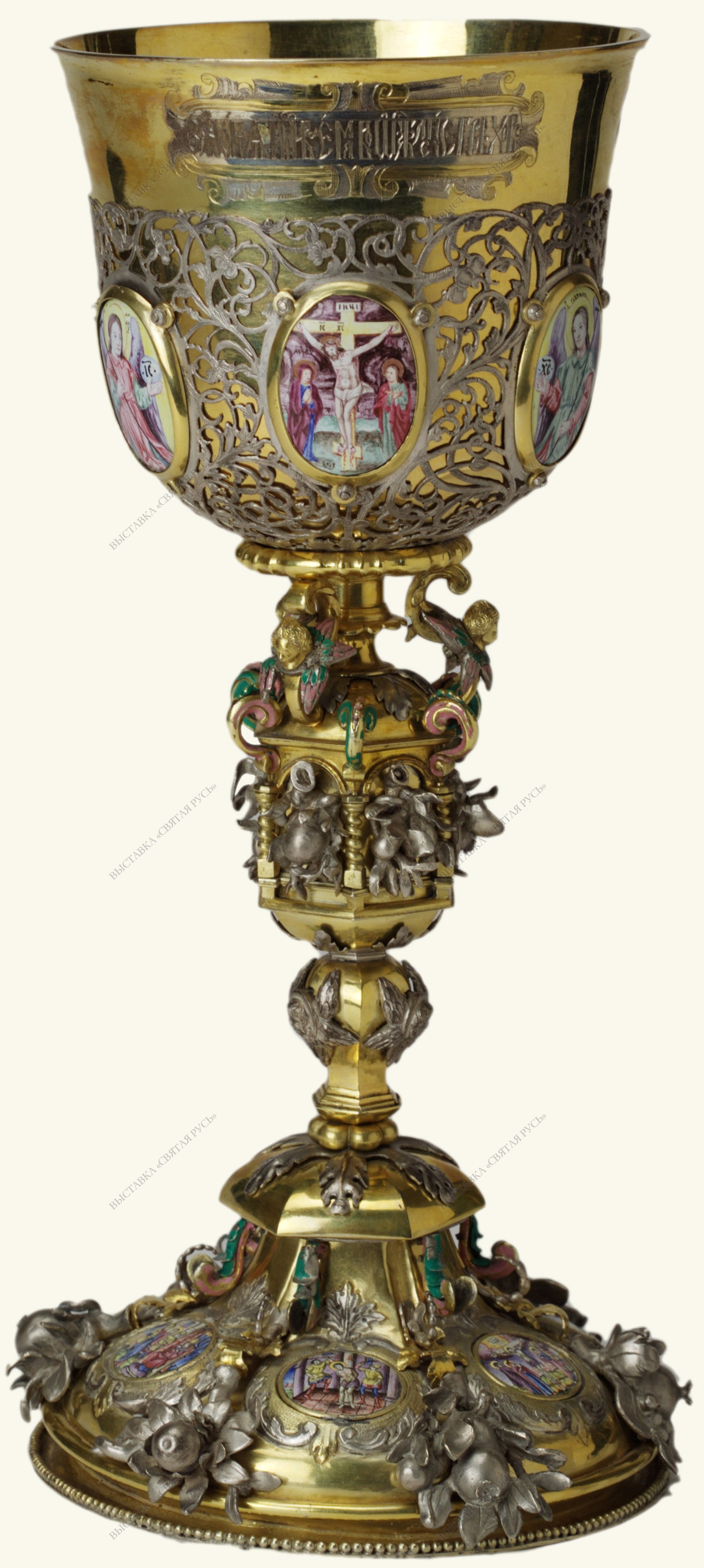 Неизвестный мастер-монограммист ZV 1704 год Москва Серебро; литье, резьба, золочение, эмаль, живопись 33,8 х 13,8 Поступил в 1935 году из Антирелигиозного музея искусств По краю испода поддона резано: 1704 Г. МЕСЯЦА АВГУСТА В ДЕНЬ 2 БЛАГОВЕРНАЯ ВЕЛИКАЯ ГОСУДАРЫНЯ ЦАРЕВНА И ВЕЛИКАЯ КНЯЖНА ЕКАТЕРИНА АЛЕКСЕЕВНА ВЫМЕНIЛА СИИ СВЯТЫЕ СОСУДЫ ВО ОБИТЕЛЬ ПРЕСВЯТЫЯ БОГОРОДИЦЫ ОДИГИТРИЯ СМОЛЕНСКИЯ В НОВОДЕВИЧИЙ МОНАСТЫРЬ. ВЕСУ В НИХ ШЕСТЬ ФУНТОВ. ЦЕНА СТО ОСМДЕСЯТ РУБ. Вклад царевны Екатерины Алексеевны (1658–1718) в Смоленский собор Новодевичьего монастыря ГИМ инв. 77177 ОК 9856