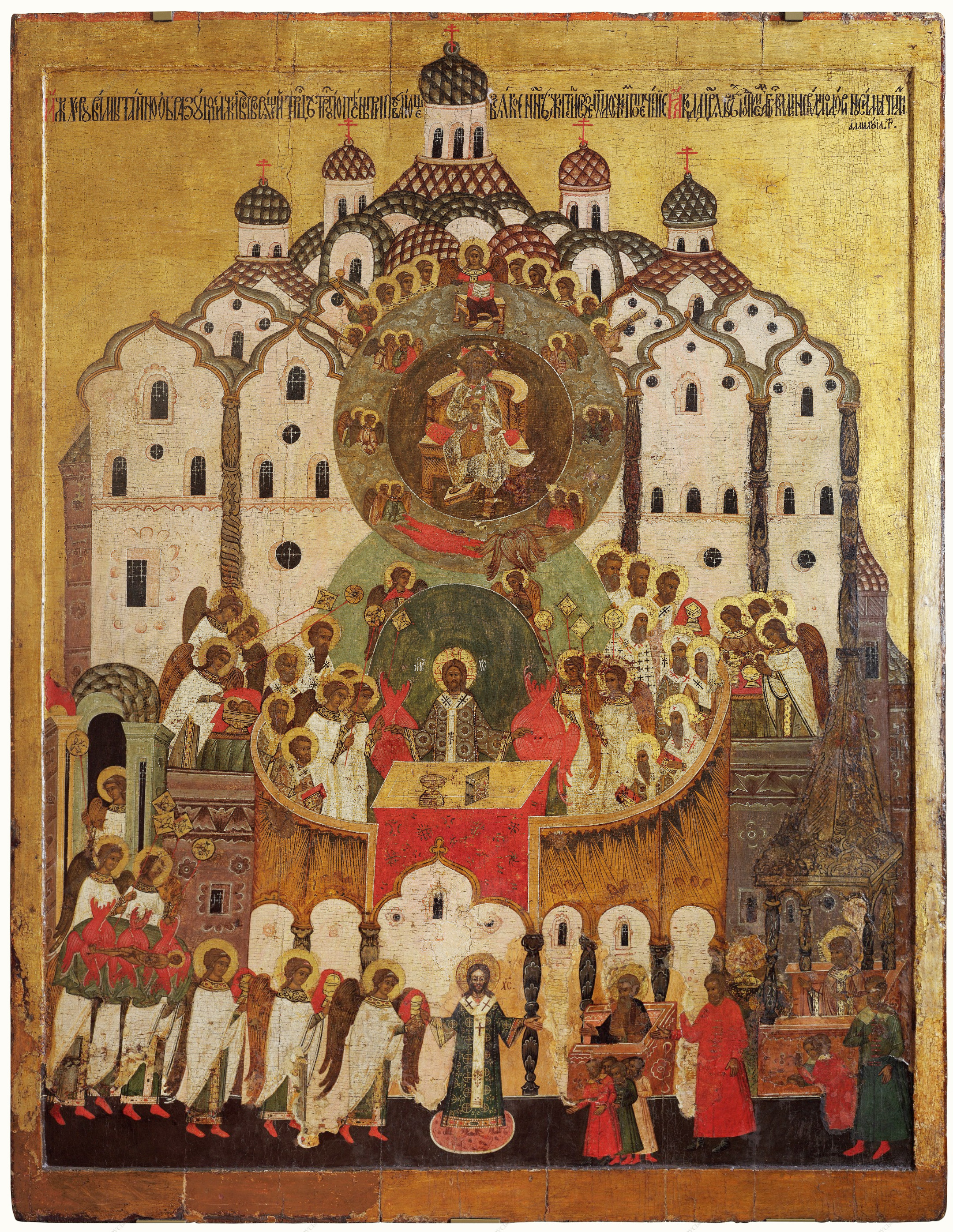 В последнем разделе выставки представлены иконостасы и иконы, богослужебная утварь и книги, драгоценные облачения священнослужителей. Среди литургических сосудов – яшмовый потир, исполненный в 1329 году по заказу новгородского архиепископа Моисея, тарель, вложенная в Архангельский собор Московского Кремля в память о царе Федоре Ивановиче, водосвятные чаши. Высочайшим совершенством отмечены торжественные одеяния митрополита Ионы Сысоевича, созданные в строгановских мастерских в 1665 году.