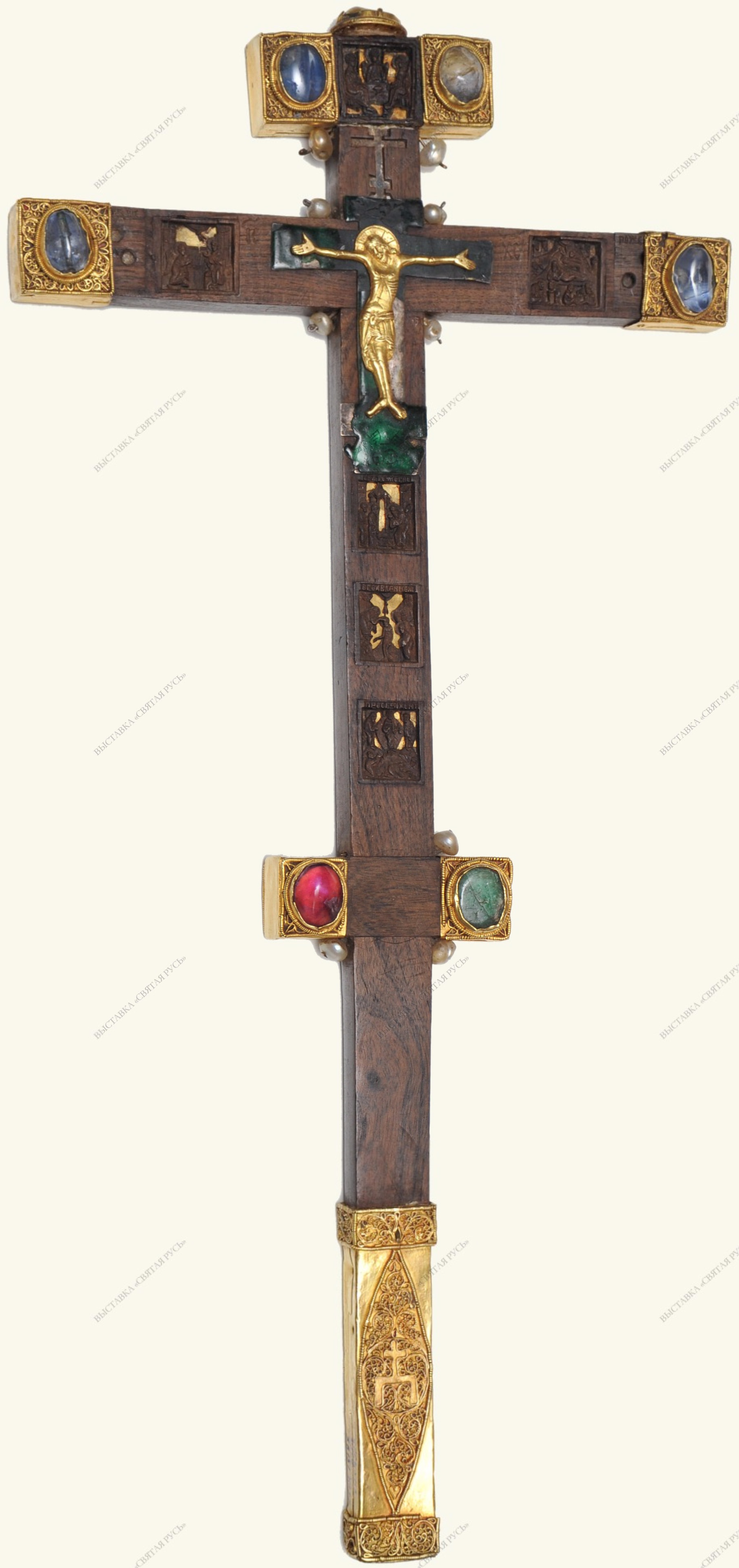 Дерево (орех), золото, серебро, сапфиры, изумруд, аметист, корунд, жемчуг, мастика; резьба по дереву, литье, чеканка, скань, шлифовка, эмаль