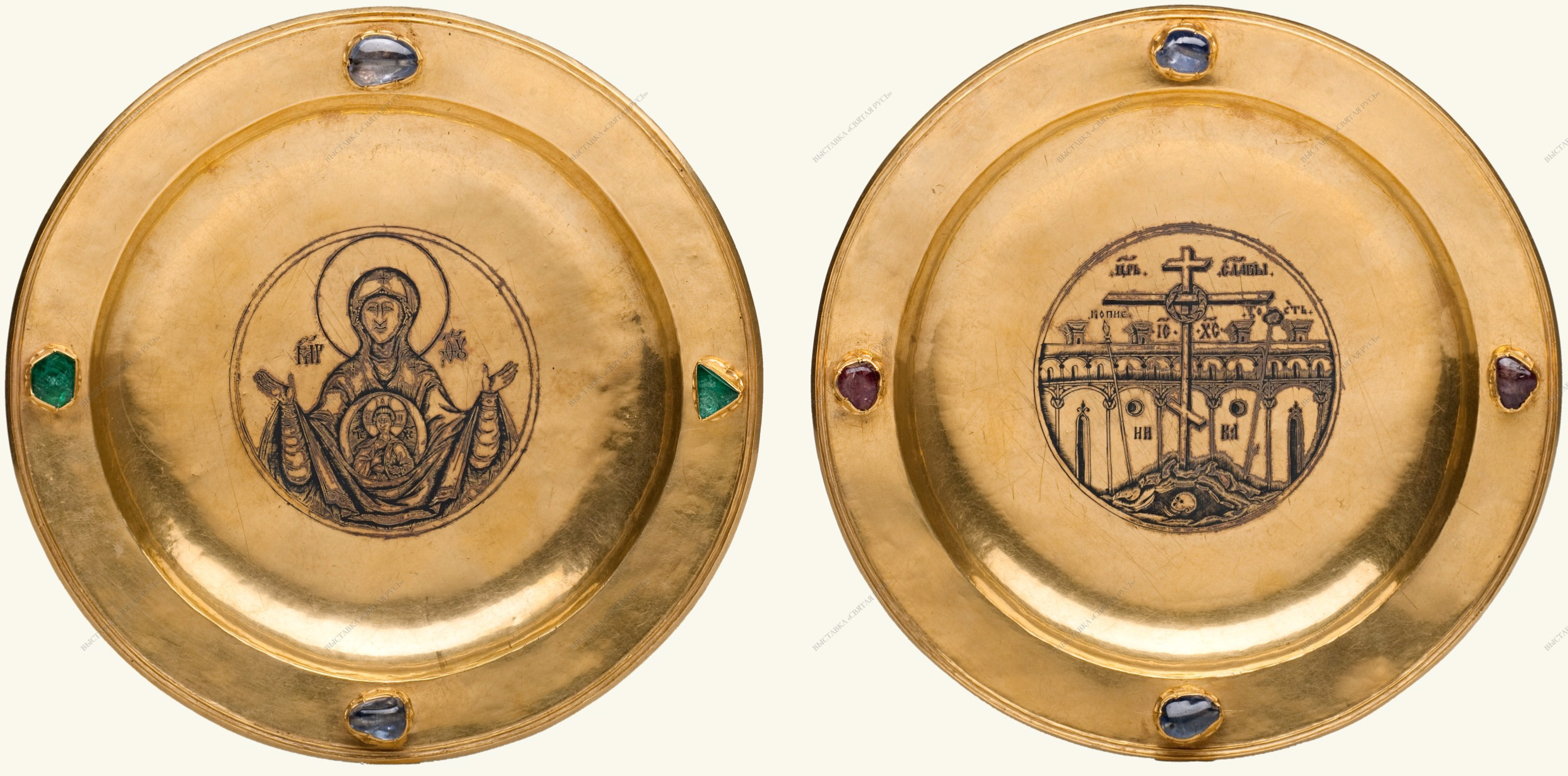 С оборотной стороны основания: ПОТИ‹Р› Ц‹Е›РКВИ С‹ВЯ›ТЫХ / ЖЕН МИРОНОСИЦ С ЕРОСЛАВЛЯ / ДВОРИЩА В ВИСУ / ДВА ФУНТА ВОСМЕ‹И›НАТЦАТ ЗОЛОТНИКОВ