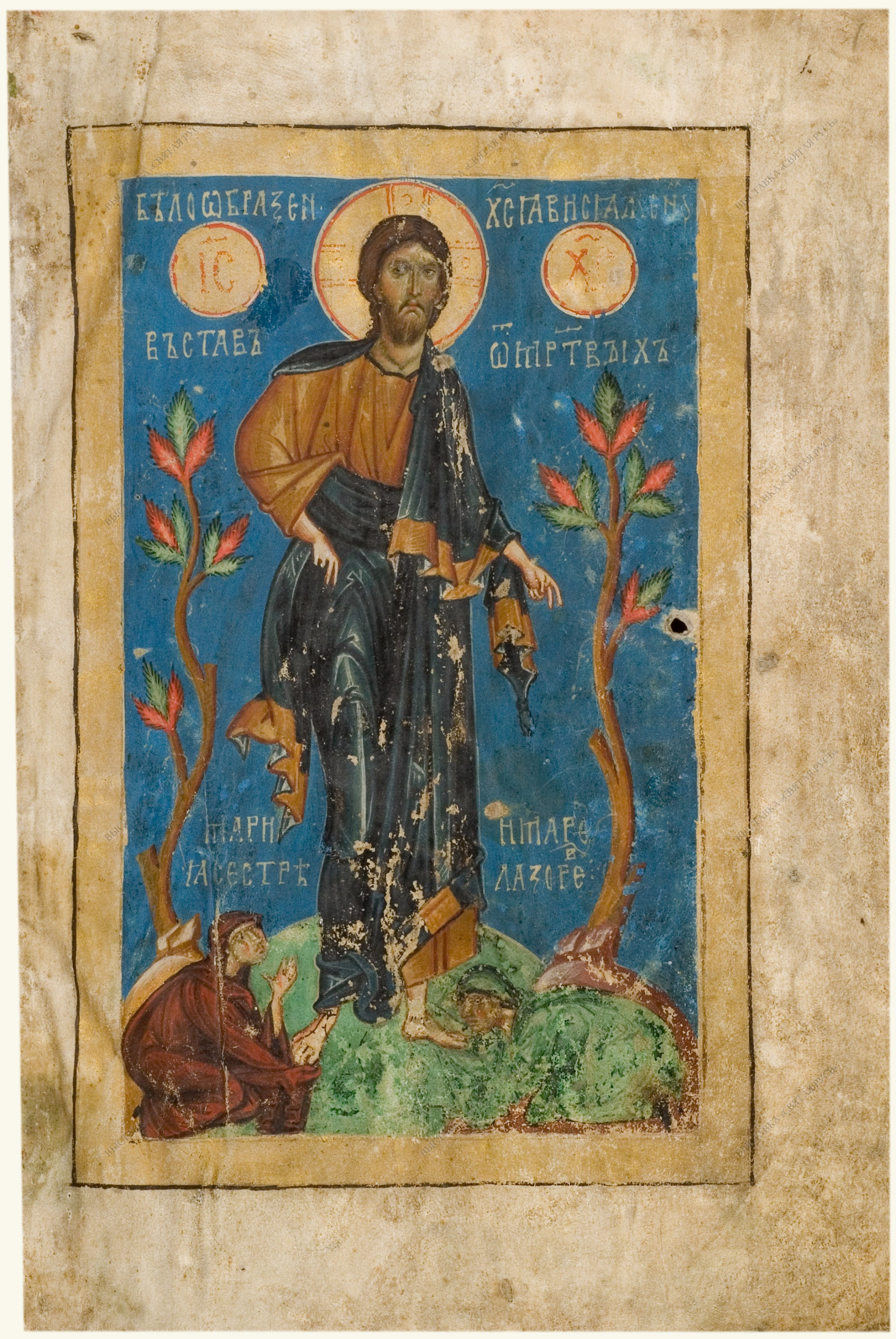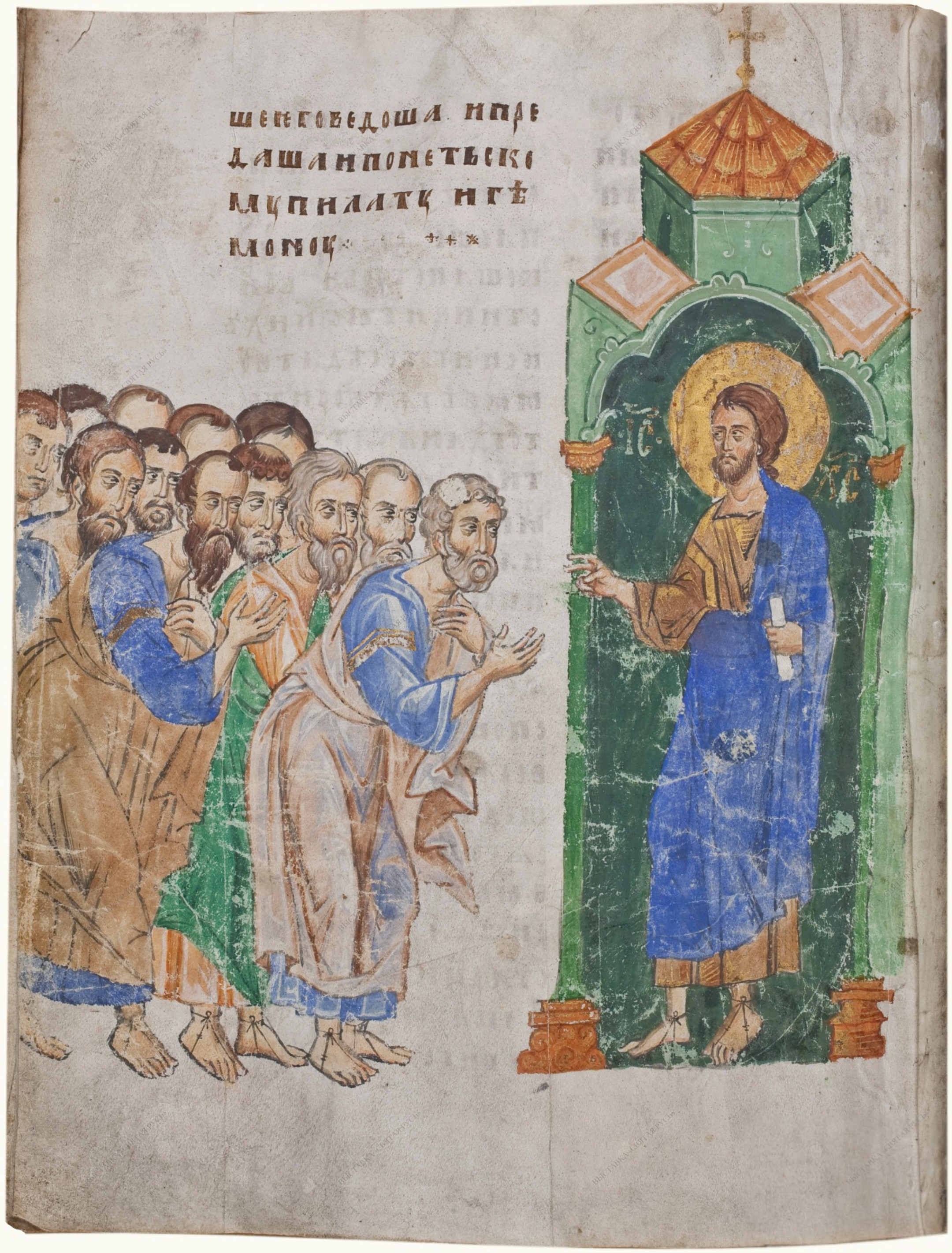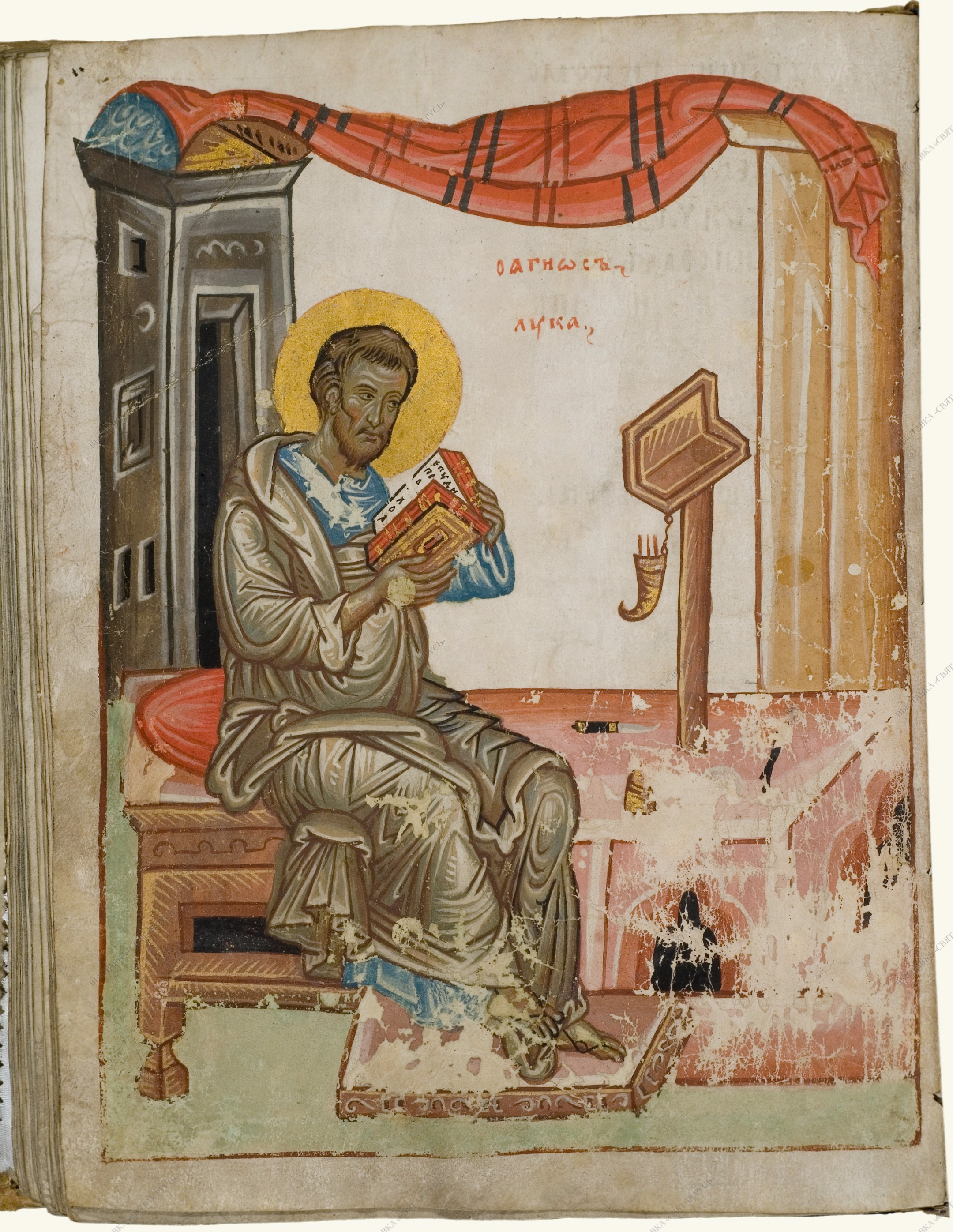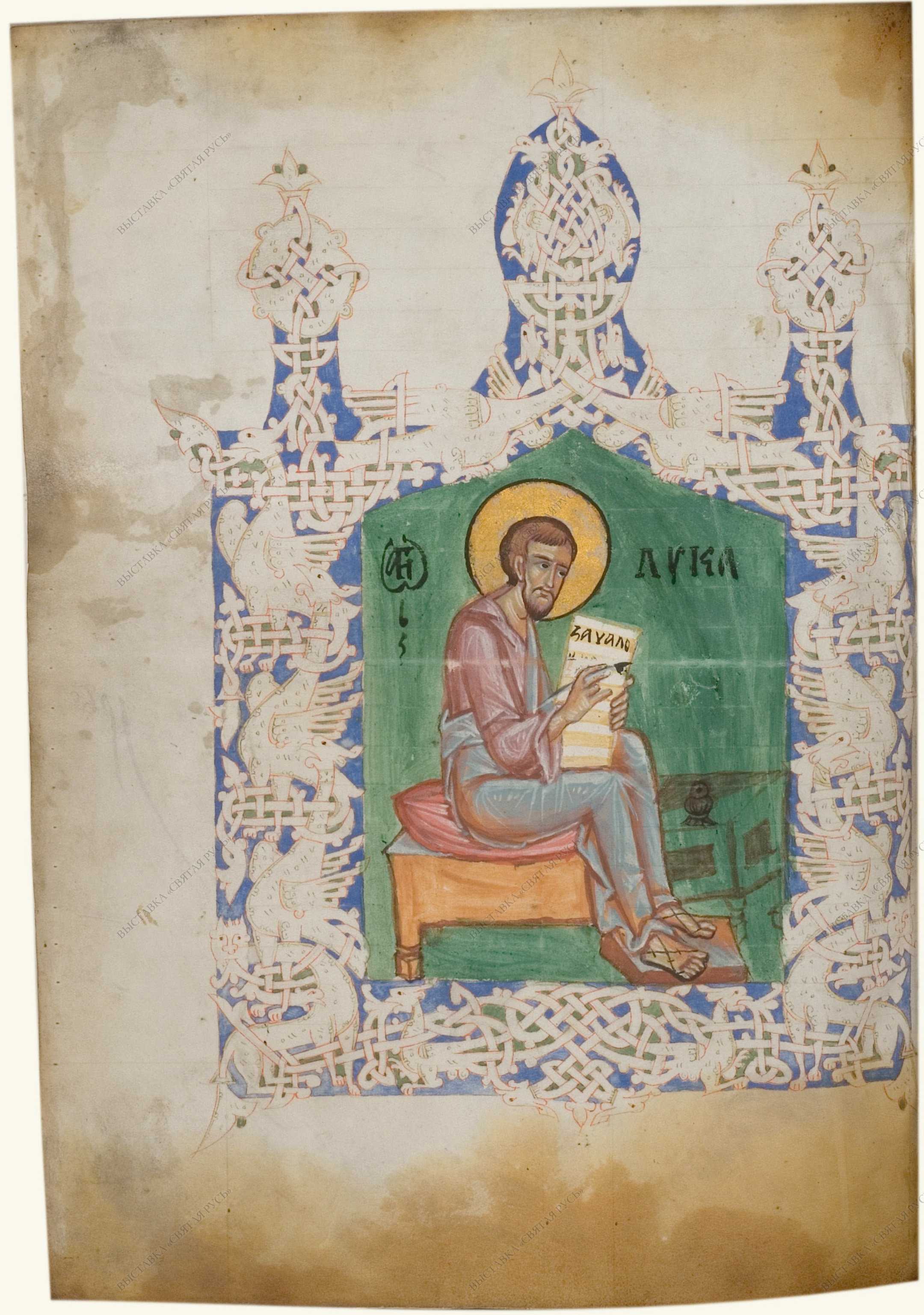 На л. 1 надпись: ォВ лето 6917 ‹1409› написано бысть Евангелие се к святому Николе в монастырь на Завеличье повелением раба Божия Феодора черньца... а писал многогрешный Лука диакон святые Троица...サ