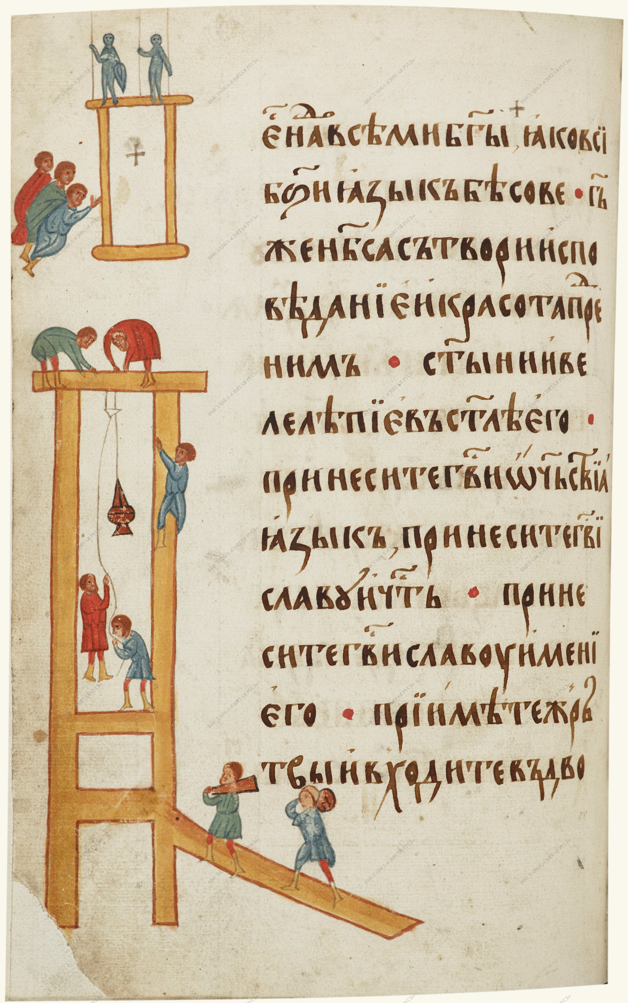ДI ‹14› МѢЦA СEМТБРЯ ДI ‹14› ДНЬ НА ВЗДВИЖЕНЬE ЧСТНОГО КРСТА СТВОРEНА БЫС ПОНАГИЯ СИ ПОВEЛѢНЬEМЪ ПРEСВЩНГО АРХИЕEПСКПА ВEЛИКОГО НОВАГРАДА ВЛЦИ EОУθИМИЯ ПРИ ВЕЛИКОМЪ КНЗѢ ВАСИЛЬѢ ВАСИЛЬЕВИЧ ВСЕЯ РОУСИ ПРИ КНЗѢ ЮРЬѢ ЛОУГВЕНЬЕВИЧ ПРИ ПОСАДНИКѢ ВЕЛИКОГ НОВАГОГОРОД БОРИСѢ ЮРЬEВИЧ ПРИ ТЫСЯЦКОМ ДМИТРEѢ ВАСИЛЬЕВИЧ А МАСТЕРЪ ИВАНЪ АРИПЪ