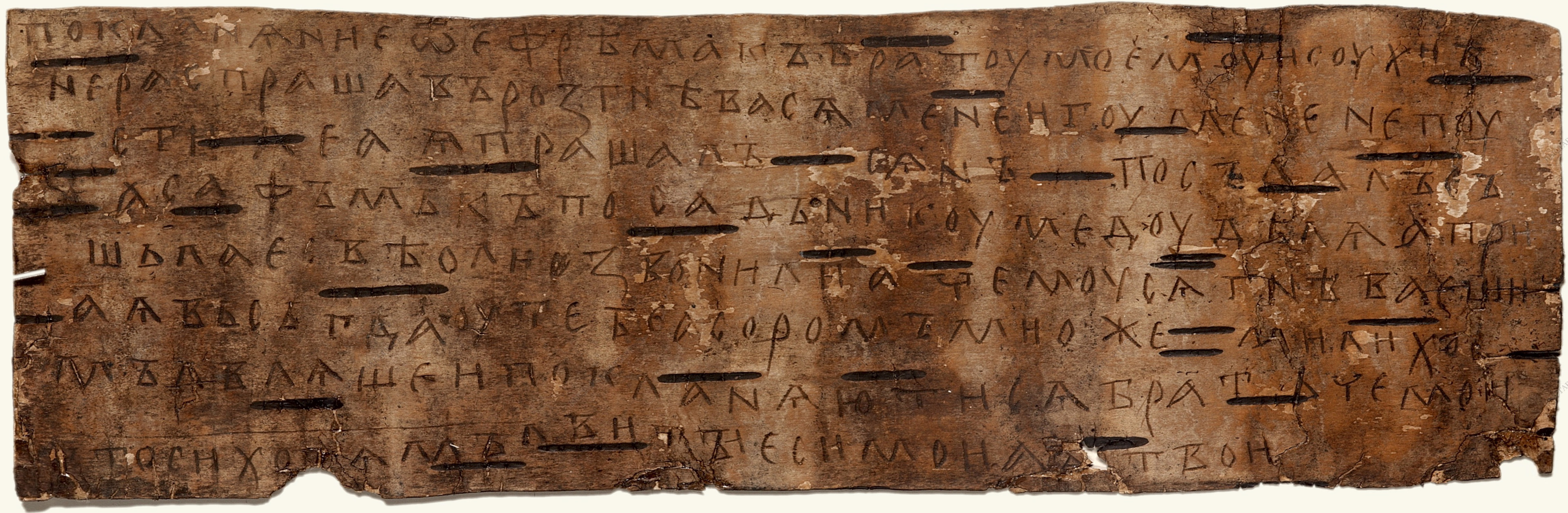 Надпись: ПОКЛАNЯNИЕ ωТ ЕФРѢМА КЪ БРАТОУ МОЕМОУ ИСОУХИѢ / NЕ РАСПРАШАВЪ РОЗГNѢВАСЯ МЕНЕ ИГОУМЕNЕ NЕ ПОУ/СТИЛЕ А Я ПРАШАЛЪСЯ NЪ ПОСЪЛАЛЪ СЪ / АСАФЪМЬ КЪ ПОСАДЬNИКОУ МЕДОУ ДѢЛА А ПРИ/ШЬЛА ЕСВѢ ОЛИ ЗВОNИЛИ А ЧЕМОУ СЯ ГNѢВАЕШИ / А Я ВЬСЬГДА ОУ ТЕБЕ А СОРОМЪ МИ ОЖЕ МИ ЛИХО / МЪЛВЛЯШЕ И ПОКЛАNЯЮ ТИ СЯ БРАТЬЧЕ МОИ / ТО СИ ХОТЯ МЪЛВИТЫ ЕСИ МОИ А Я ТВОИ