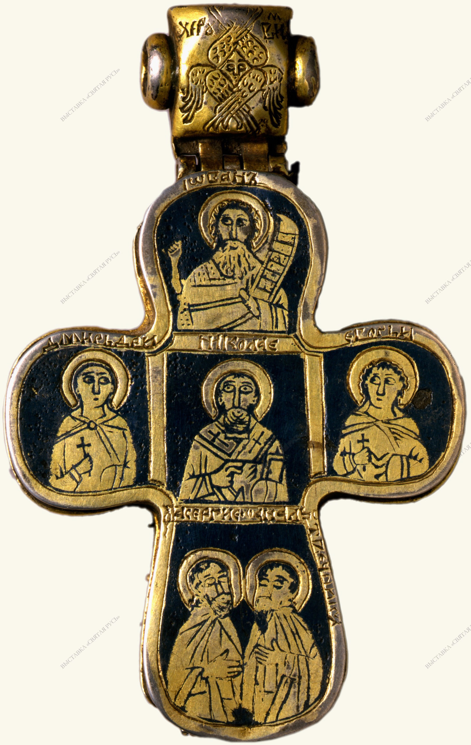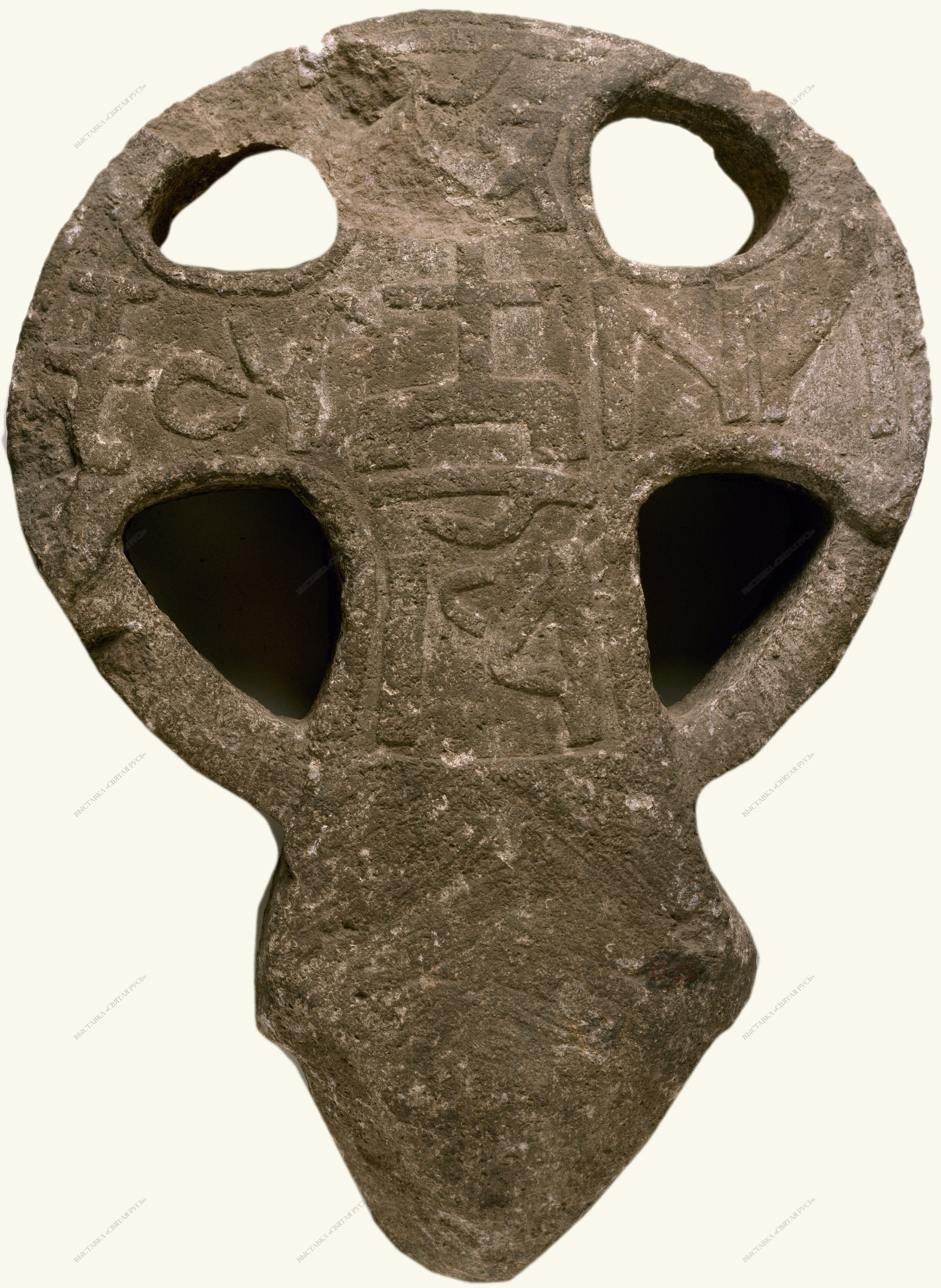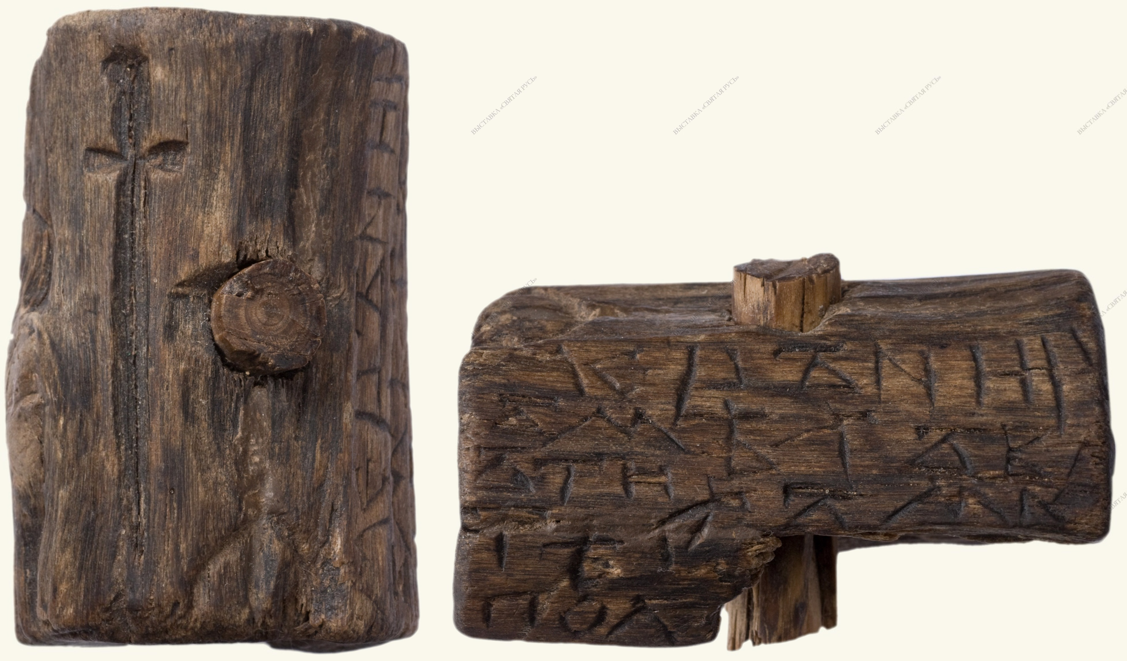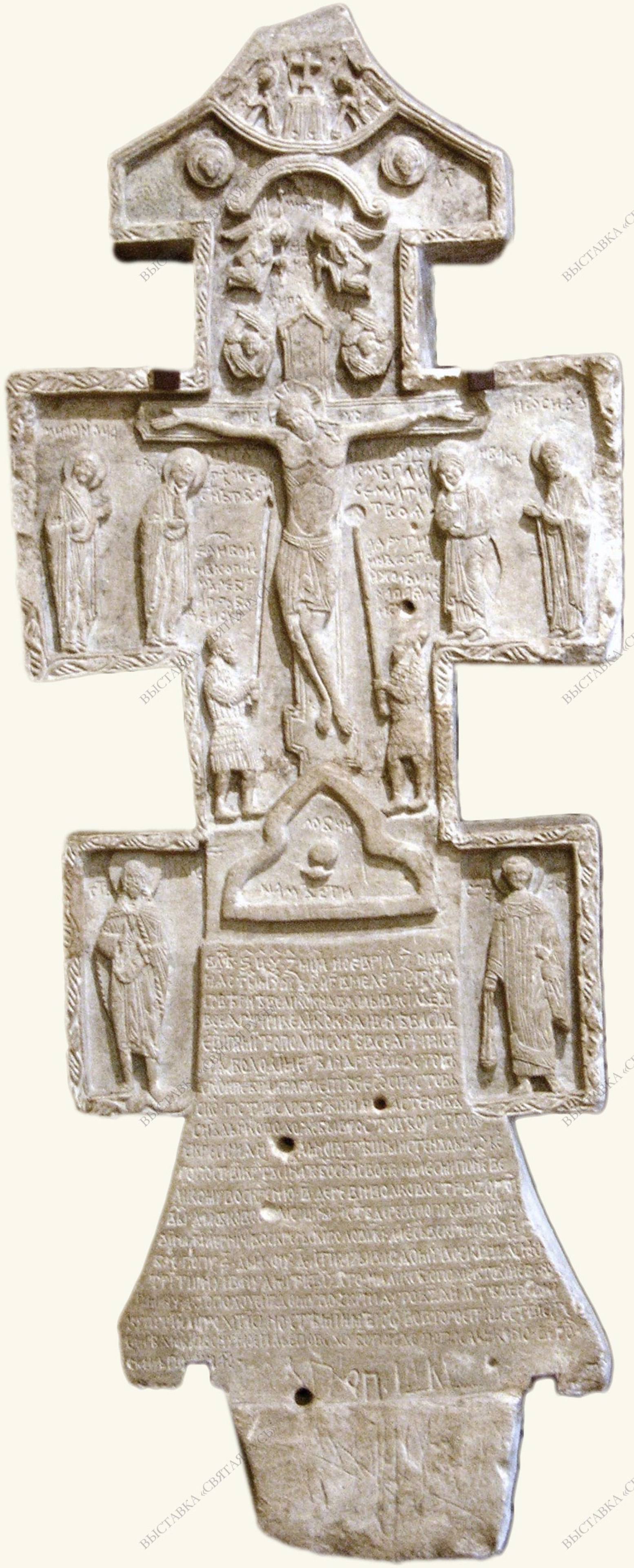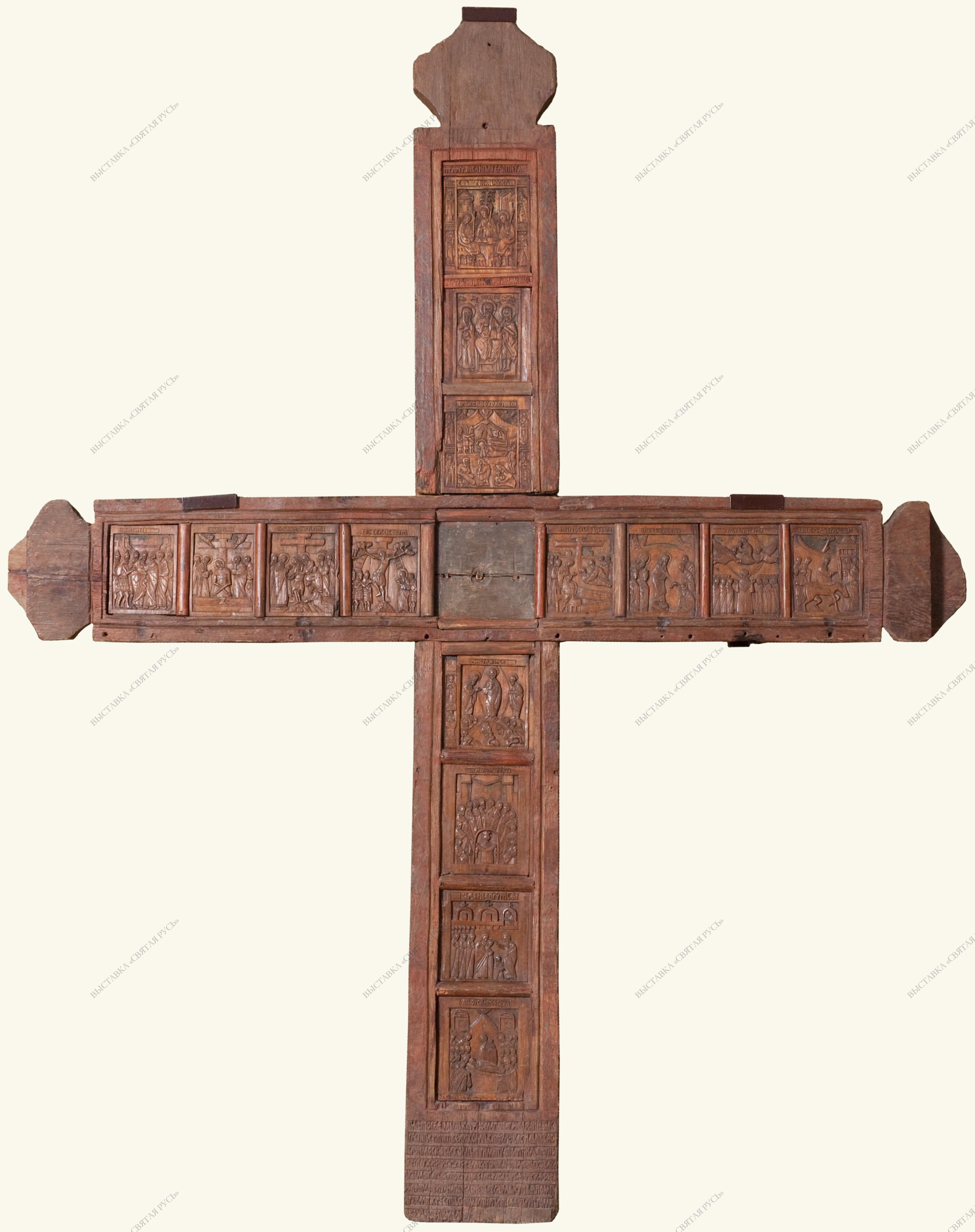 В нижней части креста резная надпись: В ЛЕТО СЕДМЬ ТЫСЯЩНОЕ М <1532> ПЯТАГО РЕЗАНЪ БЬ К//РЕСТЪ СИИ ПРИ ВЕЛИКОМЪ КНЯЗЪ ВАСИЛЬИ ИВА‹Н›О//ВИЧИ МОСКОВЬСКОМЪ И ПРИ МИТРОПОЛИТИ ДАНИ‹ИЛЕ› // И ПРИ АРХИЕПИСКУПЕ ВЕ‹ЛИ›КОГО НОВАГОРОДА И ПЬСКОВА ‹ВЛА›//Д‹Ы›КЫ МАКАРЬИ А ПОВЕЛЕНЬЕМЪ РАБА Б‹О›ЖЬЯ НИКИΘОРА //ОАФИМОВИЧА НА ПОКЛОНЕНЬЕ ВСѢЕМ КР‹ИС›ТЬЯНОМЪ //А РЕЗАЛЪ КРЕСТЪ СЕЙ МАСТЕРЪ СТЕФАНЪ СНЪ РОМА‹Н›// ОВЕЧЬ И СВОИМИ Д‹...›
