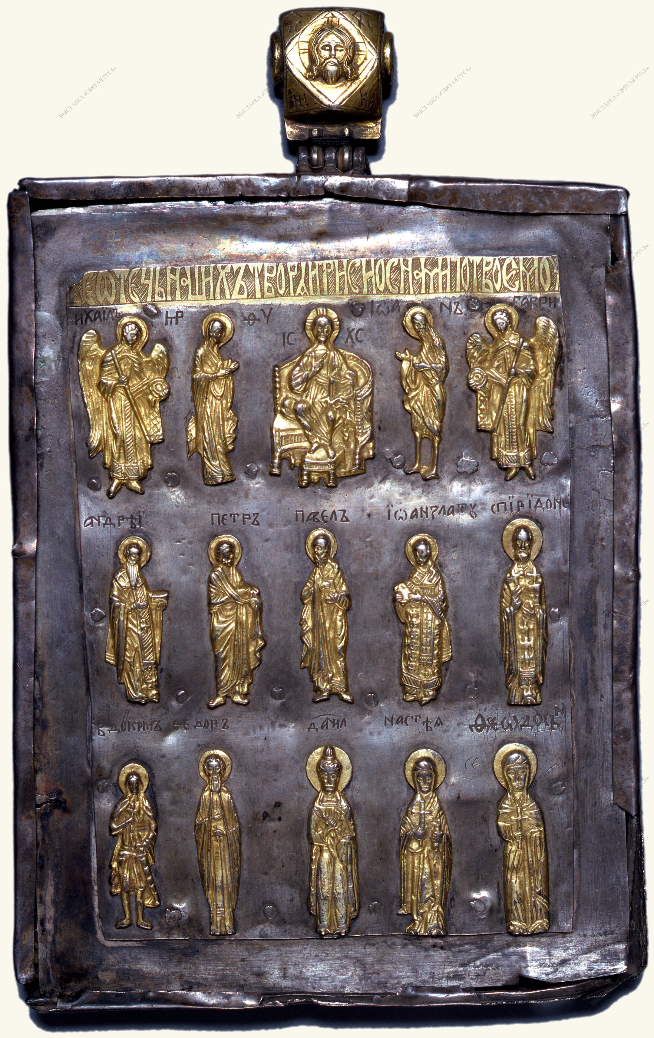 Дерево, серебро, камка; темпера, чеканка, золочение, ткачество