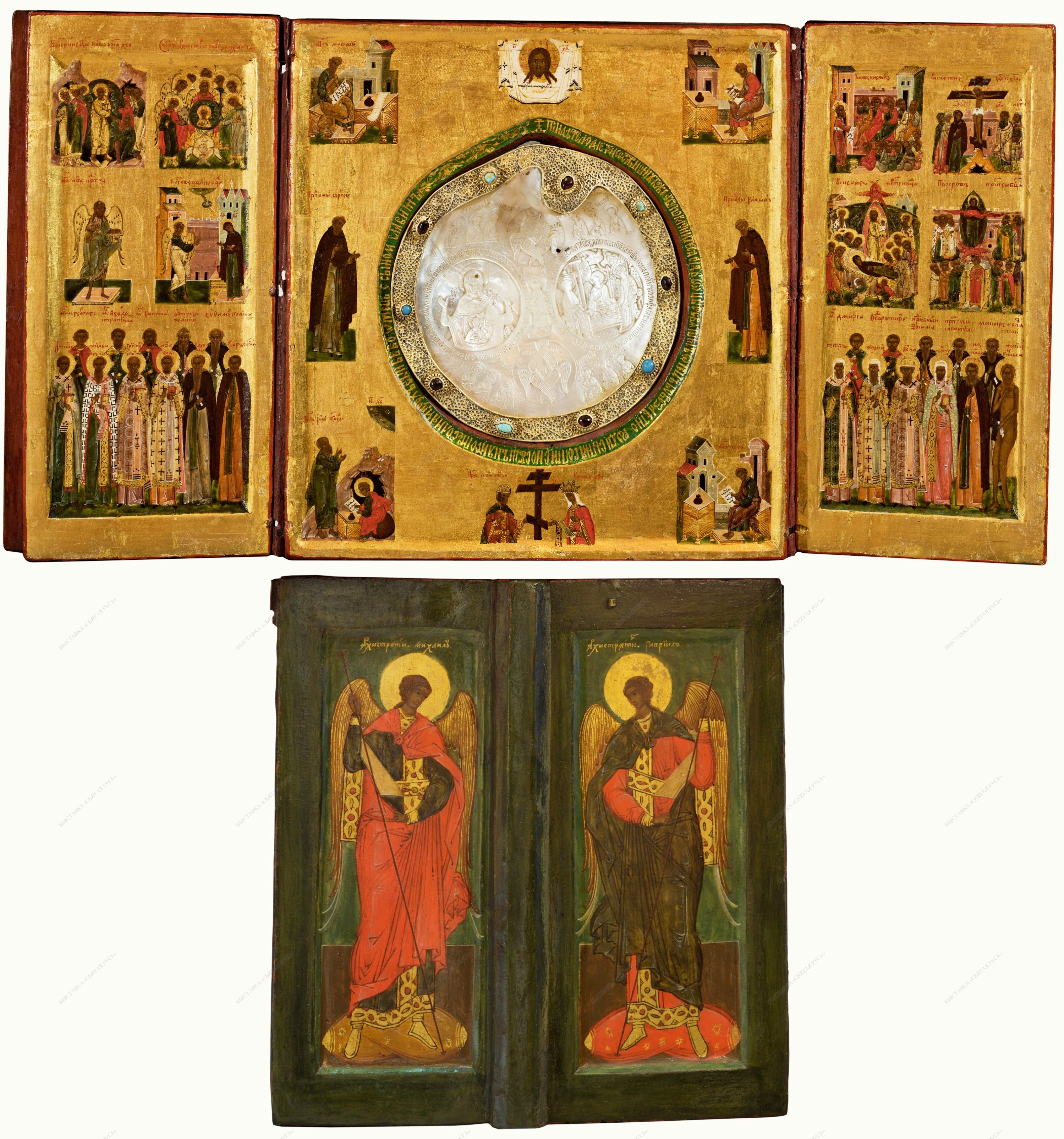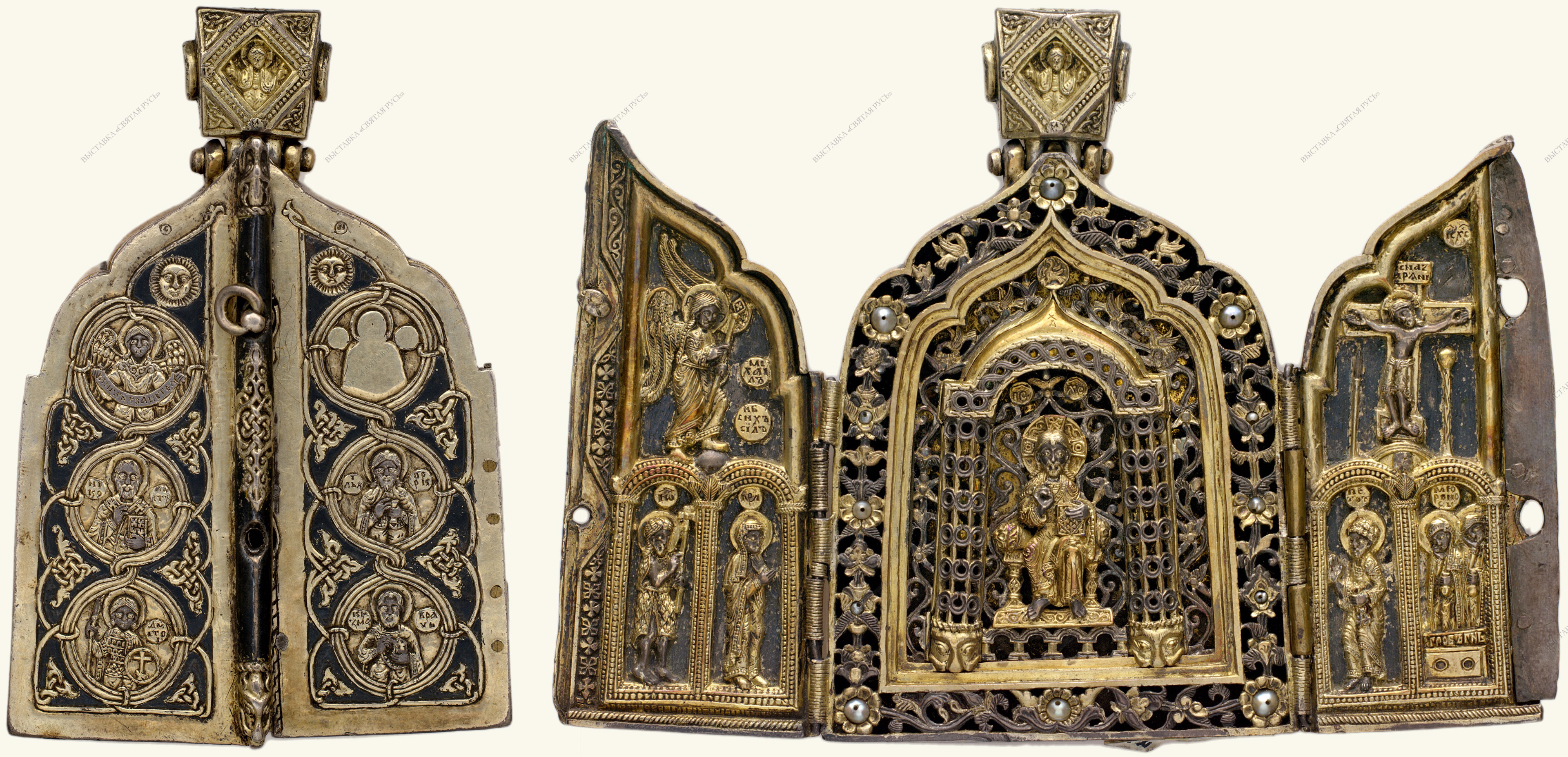 Дерево, серебро, перламутр, альмандины, бирюза, стекло, металл, кожа; темпера, резьба, скань, золочение