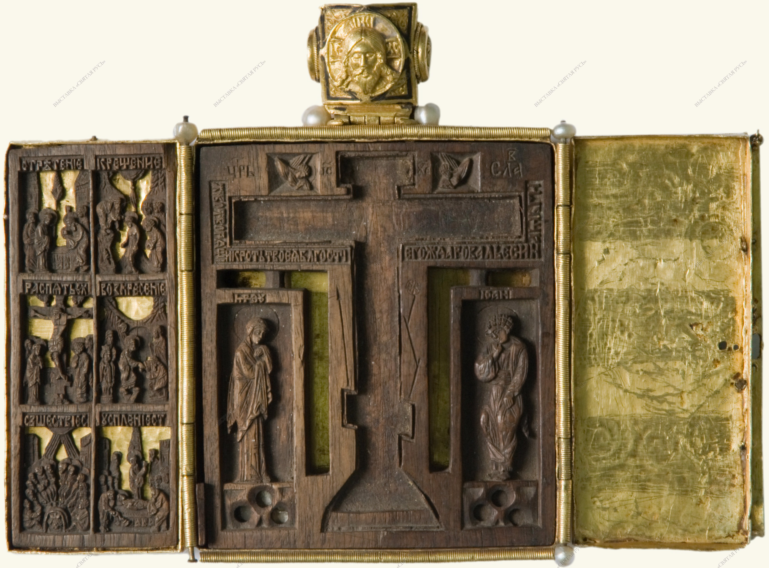Дерево (орех), золото, жемчуг, мастика; литье, резьба, скань, чернь, эмаль