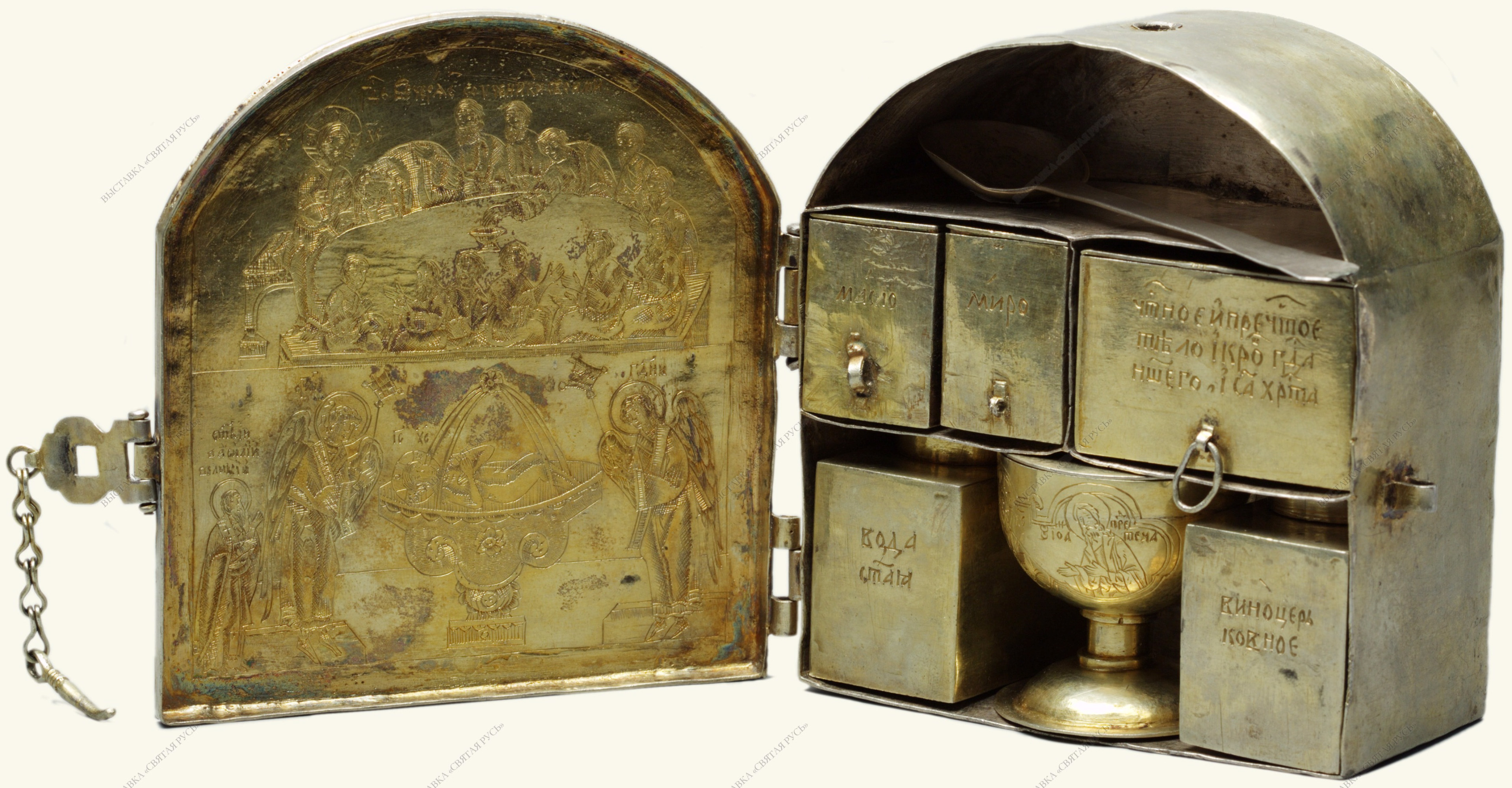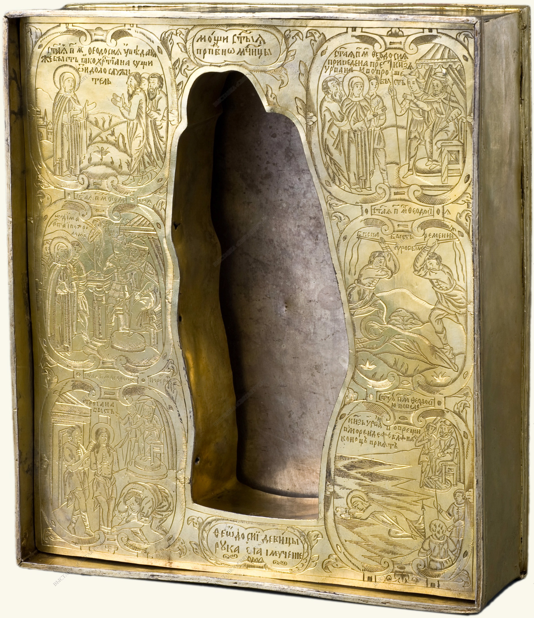 По боковым обрезам ковчега датирующая надпись с именем мастера и заказчика игумена Вассиана Рыло