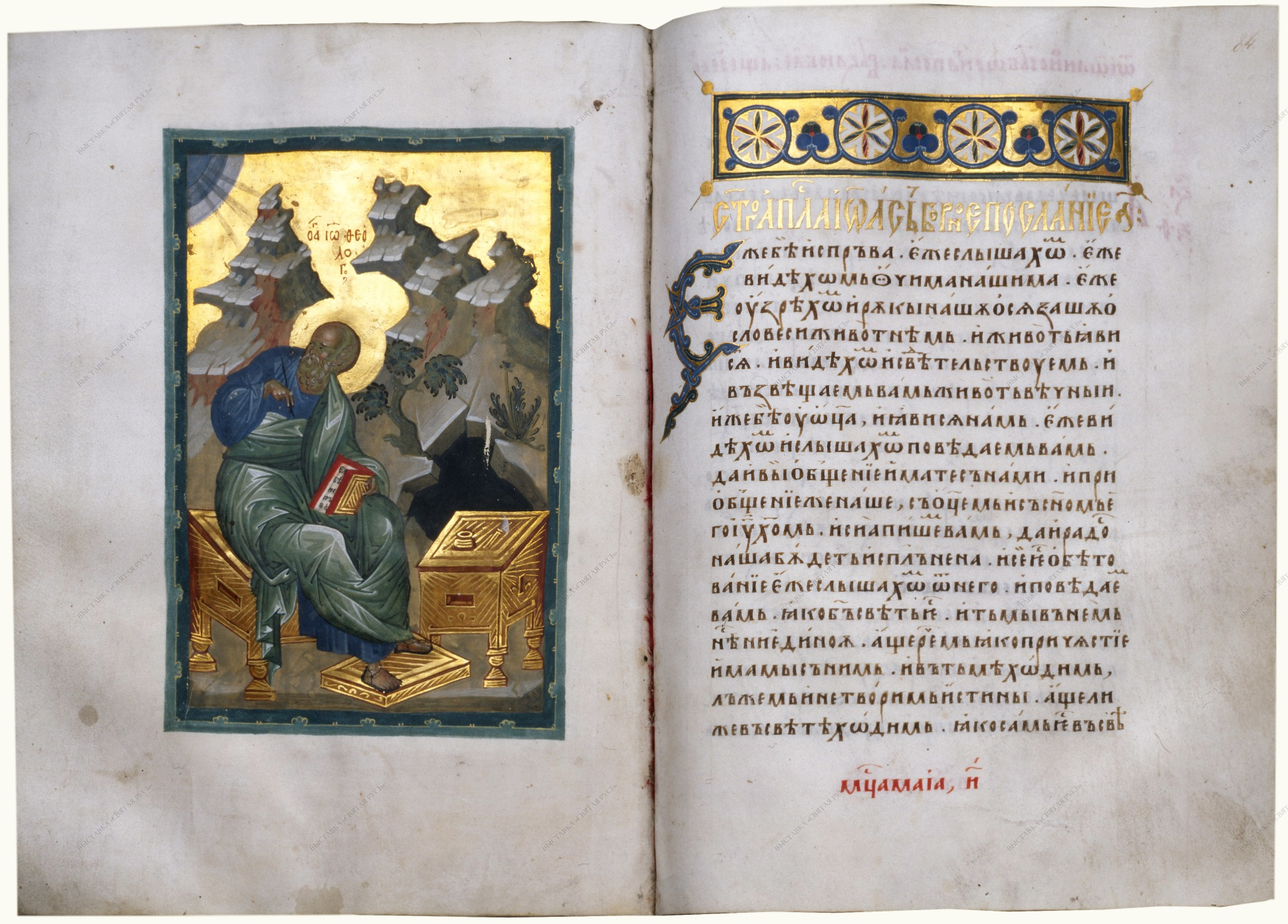 Писцы Мелентий и Прокоша 1340 год Москва 216 л. Пергамен; чернила, киноварь, темпера; переплет XIX века – кожа 31,2 х 24,8 Поступило в 1932 году На л. 216–216 об. запись писцов: В лето 6000 ‹...› написано бысть сие Евангелие в граде Москве на Двину к святей Богородици, ‹...› повелением рабом Божиим Ананиею. О семь бо князи великом Иване ‹...› А писали многогрешнии дьяци Мелентии да Прокоша, благословите их, а не клените Происходит из Антониево-Сийского монастыря на Двине. Обнаружено в 1829 году П.М. Строевым, в 1903 – передано в Древлехранилище Архангельского епархиального комитета, в 1927 – в архив Историко-археографической комиссии (Ленинград) БРАН инв. Археогр. ком. 189