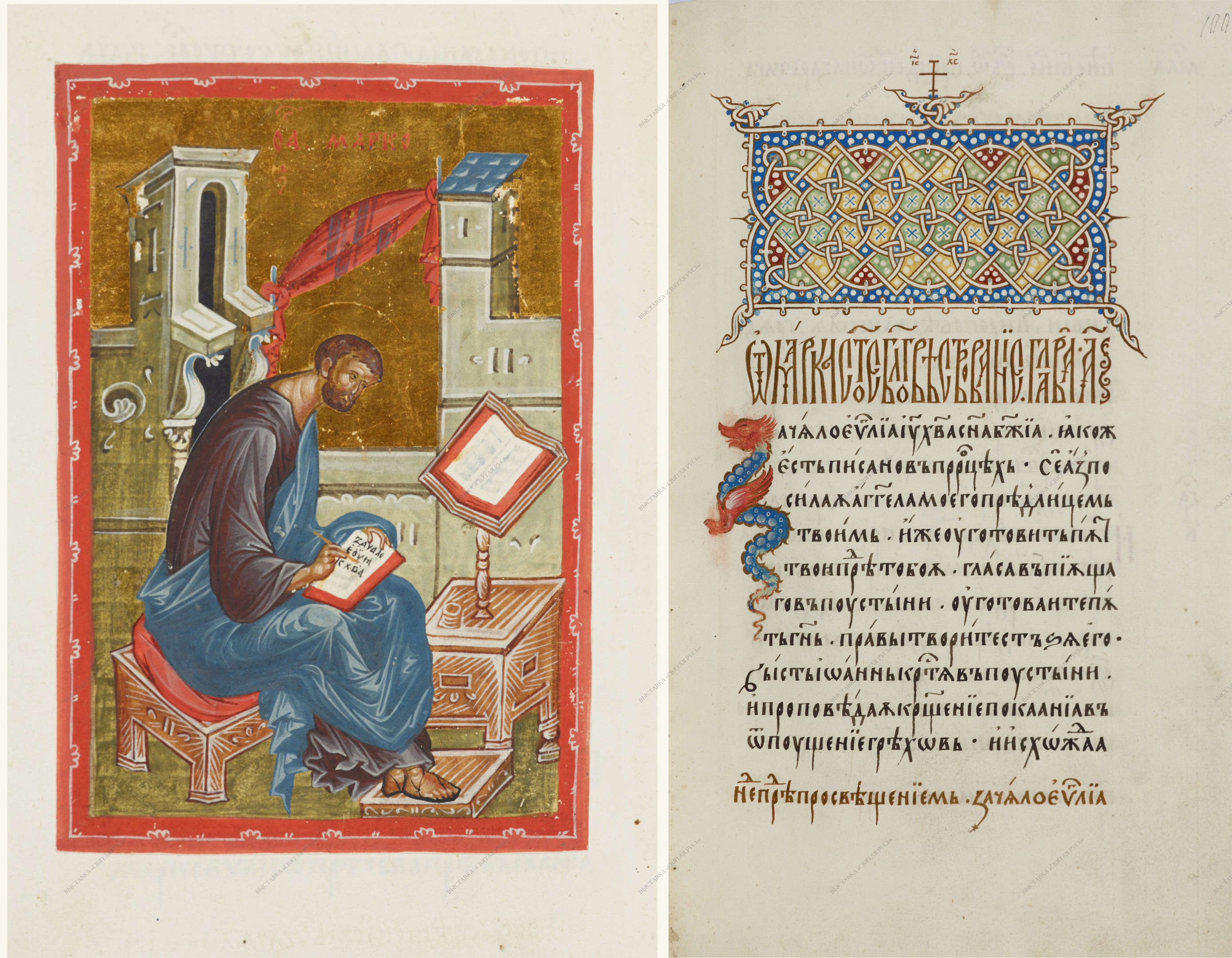 1409 год Псков 219 л. Пергамен; чернила, темпера, киноварь; переплет – дерево, кожа, металл; литье 33 х 26 Поступило в 1920 году На л. 1 надпись: ォВ лето 6917 ‹1409› написано бысть Евангелие се к святому Николе в монастырь на Завеличье повелением раба Божия Феодора черньца... а писал многогрешный Лука диакон святые Троица...サ В XVII веке находилось в Патриаршей, затем в Синодальной библиотеке в Москве ГИМ инв. 80370, ОР Син. 71