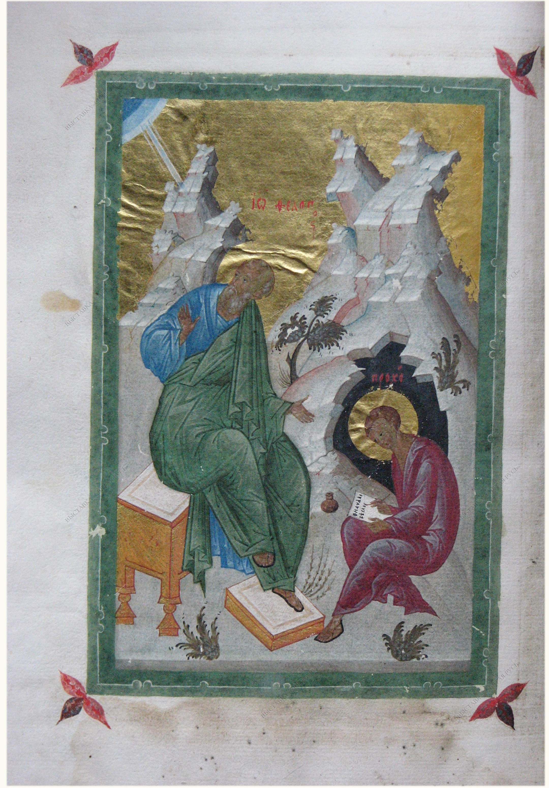 Начало XV века Москва Пергамен; чернила, темпера, киноварь, золото; переплет – дерево, кожа, металл; литье 28,5 х 21,5 х 8 Поступило в 1921 году Происходит из Спасо-Андроникова монастыря. В середине XIX века было передано в Епархиальную библиотеку Реставрировано в 2000–2009 годах в ВХНРЦ им. И.Э. Грабаря ГИМ инв. 76013, ОР Епарх. 436