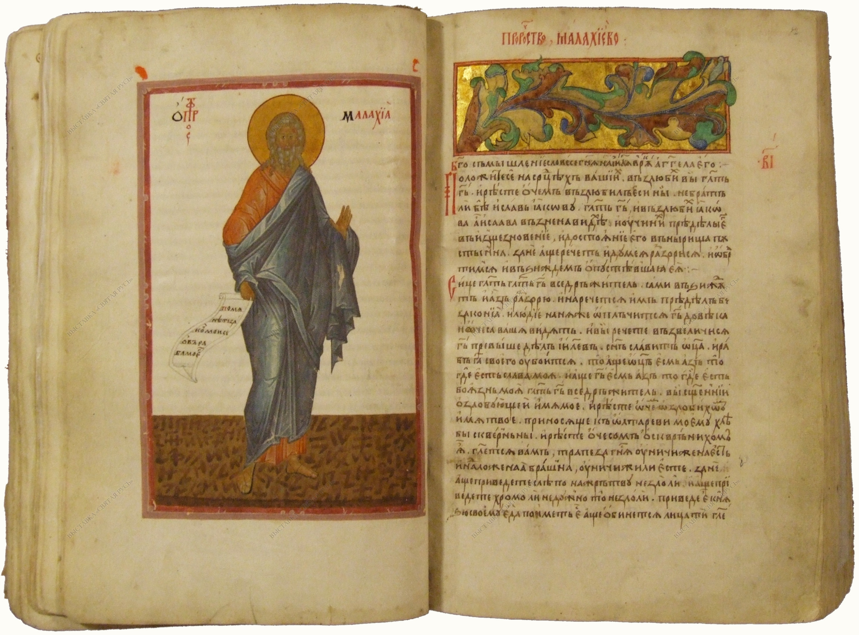 1489 год Москва 360 л. Бумага; чернила, киноварь, темпера, золото 31,5 х 20,5 х 9,5 Поступила в 1920-х годах На л. 2 запись: «В лѣто SЦЧИ ‹6998=1489› декабря КЕ ‹25› написаны сiа бжственныа прорческиа книгы въ преименитом и славнѣм градѣ Москвѣ Василию Мамыревоу диаку» Находилась в библиотеке МДА РГБ инв. Ф. 173/I, инв. 20