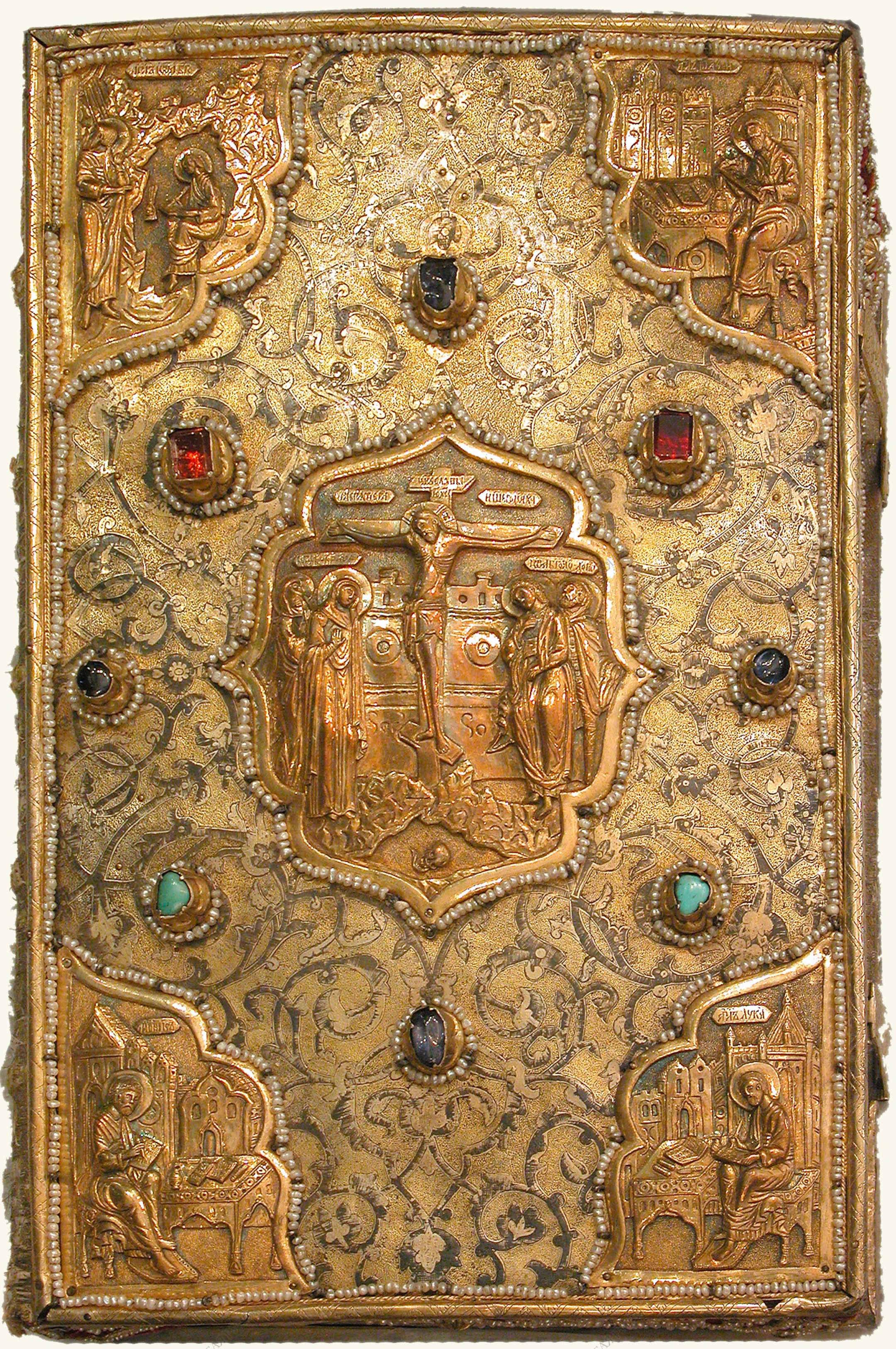 XVI век. Оклад – 1613 год Москва (?) Бумага; чернила, темпера; переплет – дерево, серебро, ткань, сапфиры, бирюза, жемчуг, стекло; чеканка, чернь, резьба, канфарение, золочение 45 х 28,5 Поступило в 1920-е годы Происходит из Соловецкого монастыря, вклад князя Димитрия Михайловича ММК инв. Кн-198