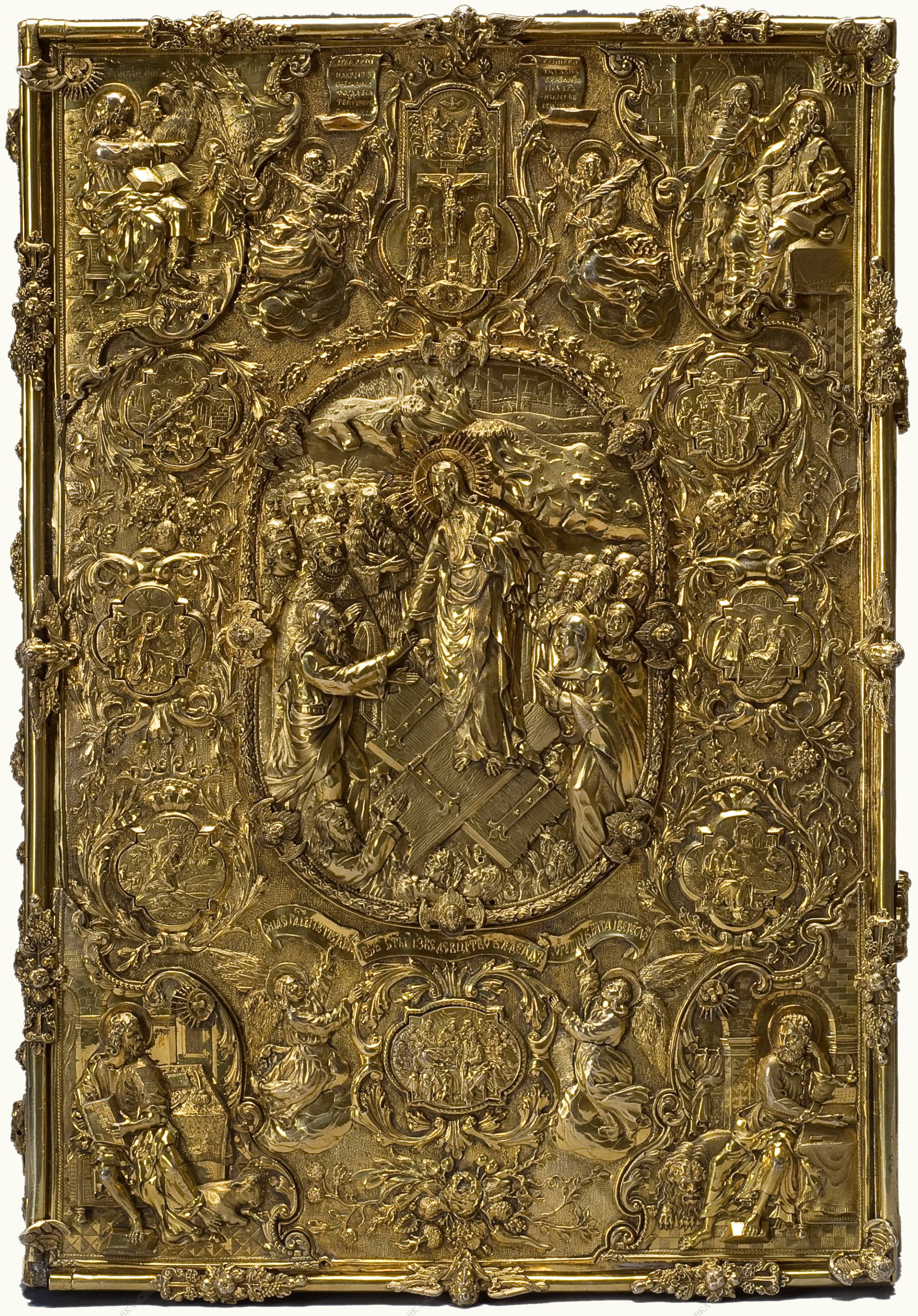 Печать – 1698 год. Оклад – 1723 год Москва Серебро, дерево, бумага, ткань; литье, резьба, чеканка, золочение 56,5 х 39 Поступило в 1935 году из Антирелигиозного музея искусств Происходит из Донского монастыря в Москве ГИМ инв. 77299 ОК 10659