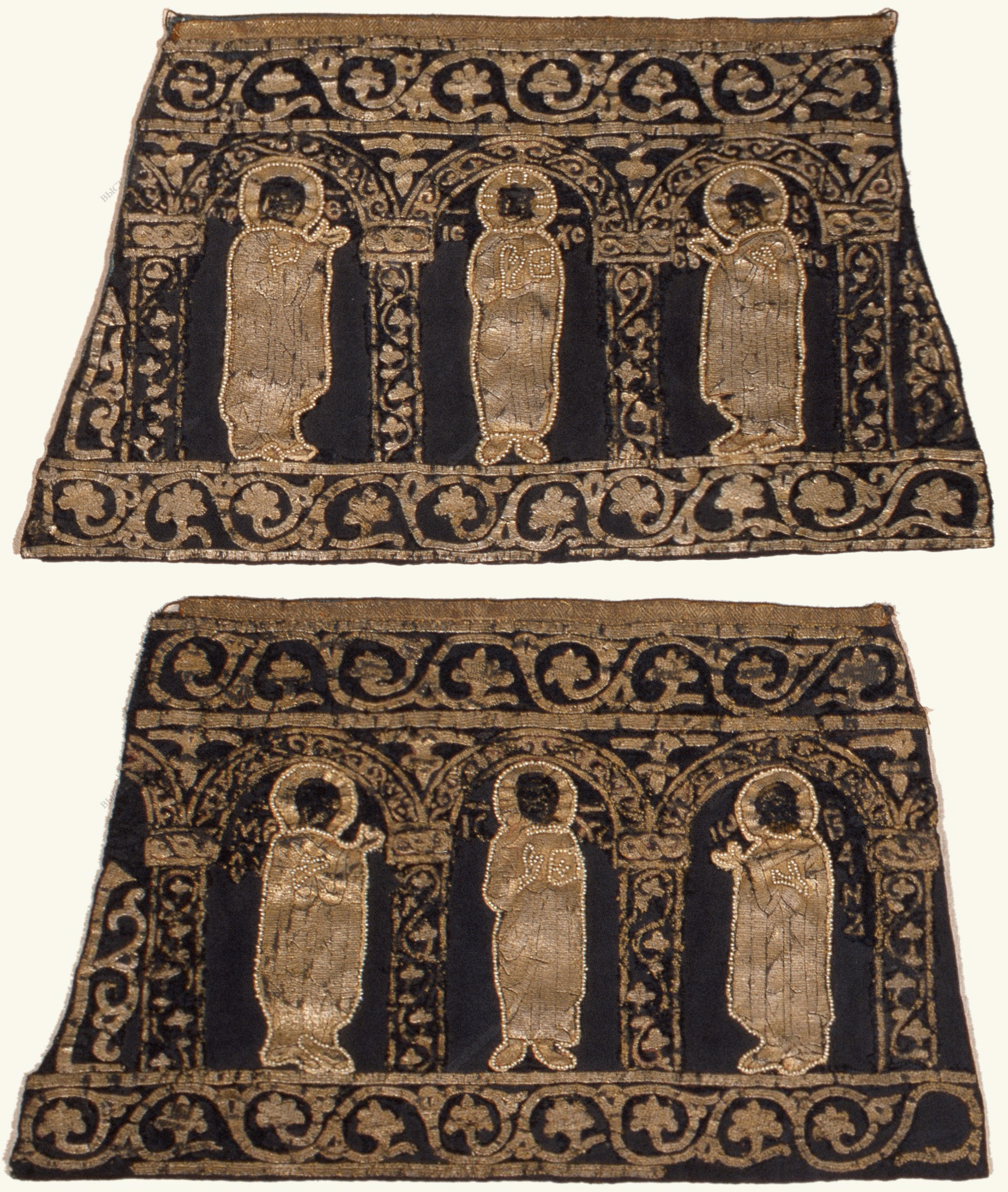Конец XII века Новгород Шелковая ткань, золотные, серебряные и шелковые нити, жемчуг; шитье 28 х 45; 27 х 45,5 Поступили в 1925 году Происходят из Хутынского монастыря в Великом Новгороде Реставрированы в 1933–1939 годах в ГИМ НГОМЗ инв. КП 1624/1,2, ДРТ 44/1,2