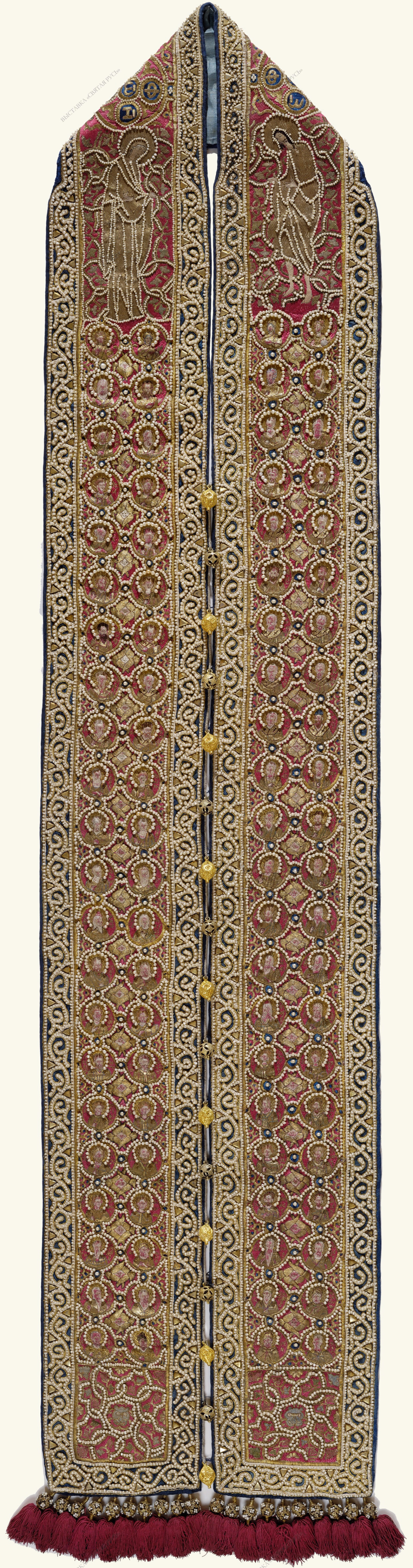XIV – начало XV века. Дополнения – XV–XVII век. Византия. Дополнения - Москва Атлас, камка, шелковые, серебряные и золотные волоченые нити, жемчуг, серебро, золото; ткачество, шитье лицевое и орнаментальное, низание, скань Длина – 157,7 (с кистями); ширина – 34,5–35 Поступила в 1920 году Находилась в Патриаршей ризнице Московского Кремля Реставрирована в ММК Л.А. Барбиновой ММК инв. Тк-6