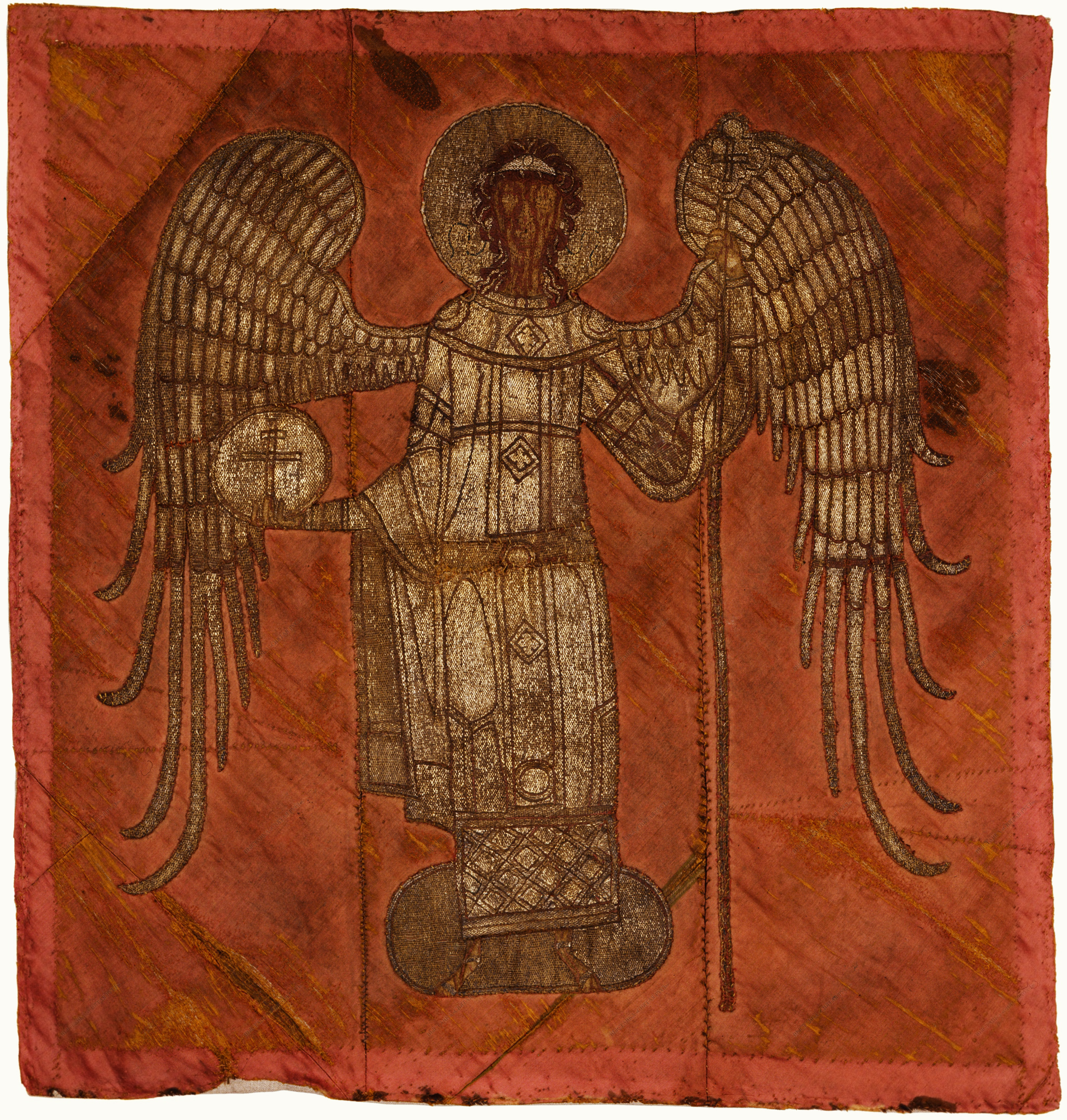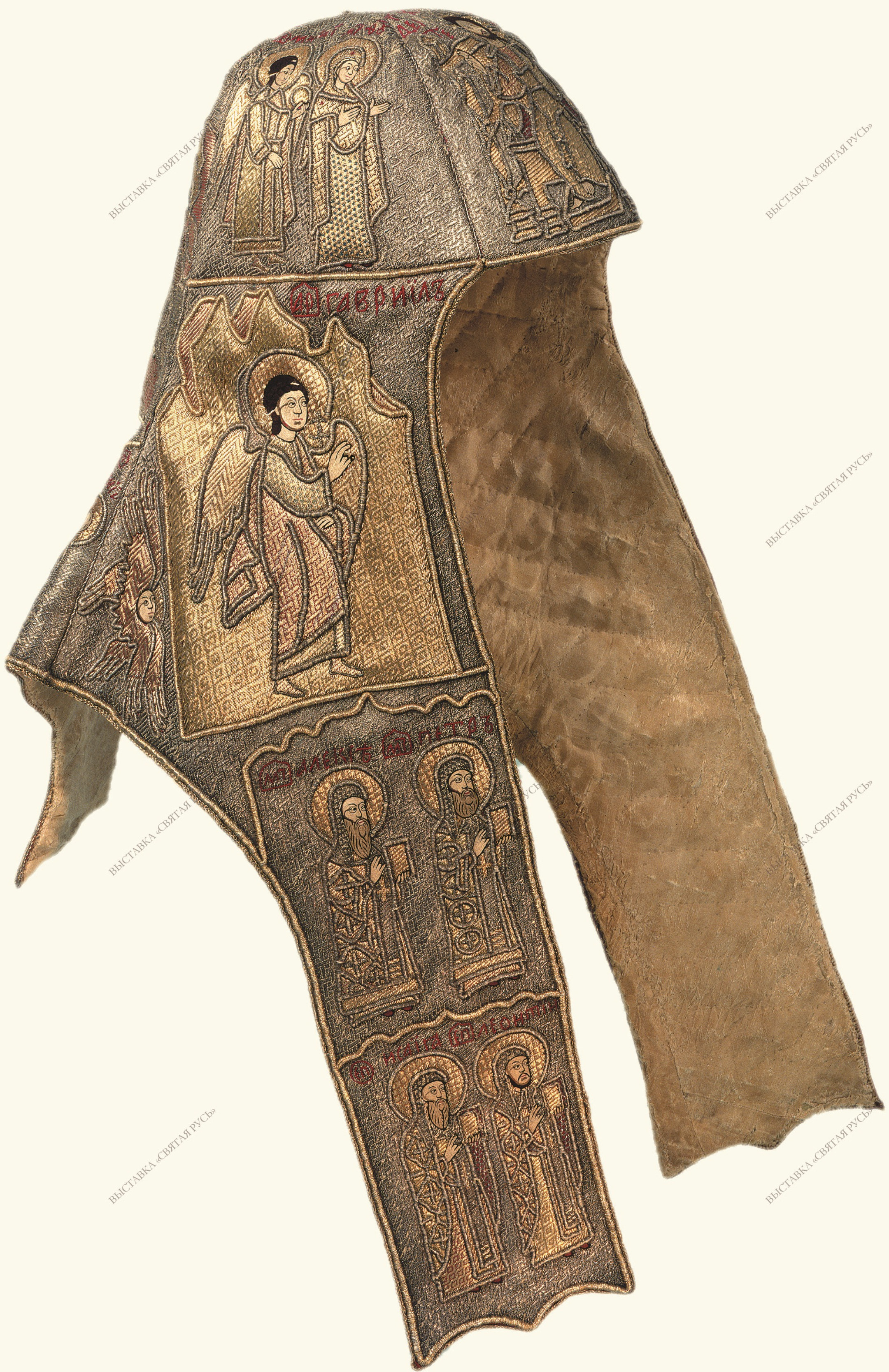 1665 год Сольвычегодск, Мастерская Анны Ивановны Строгановой Тафта, холст, шелковые, золотные и серебряные нити; шитье; подкладка – камка, вата 63 х 20; ширина воскрылий – 12,5 Поступил в 1923 году Вклад Д.А. и Г.Д. Строгановых в ростовский Успенский собор Реставрирован в 1985 году в ВХНРЦ им. И.Э. Грабаря В.К. Кривоносовой под руководством Т.А. Горошко ГМЗРК инв. Т-3224