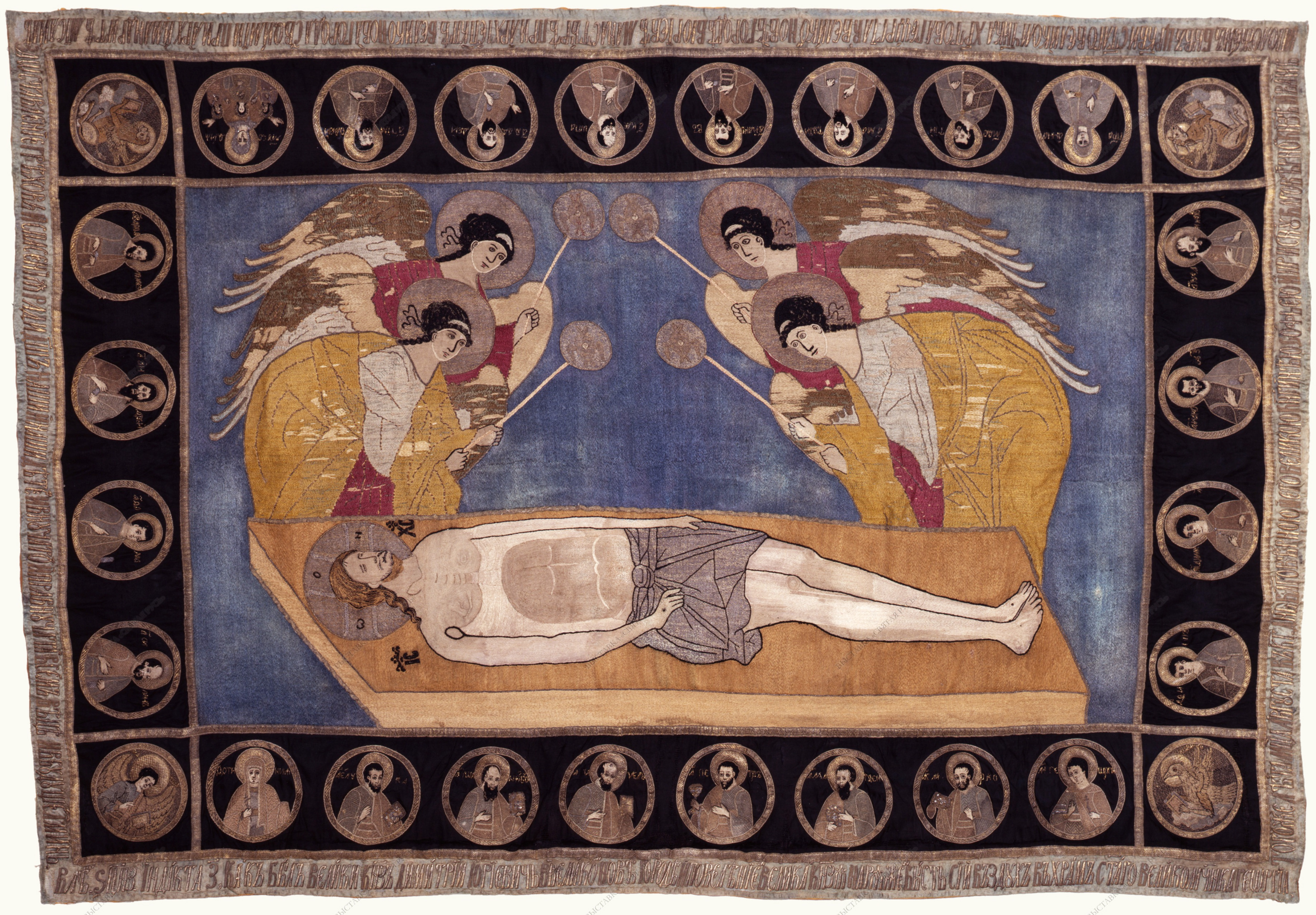 1678 год. Атлас – XVII век Москва Атлас – Италия Камка, штоф, нити золотные и шелковые, изумруды, жемчуг; ткачество, шитье 135 х 189 Поступила в 1919 году Надпись: Лета ‹7186=1678› мая въ И ‹8› днь во обитель архистратига Михаила в Чудов мнт‹р›ь при архимандрите Павле и келери Аваламе Палицине i ‹п›ри казначее старце Акиле з братиею дал сию плащаницу вкладу гость Иван Гурь‹е›въ ради вечного помяновения зятя своего го‹с›тя Федора Шорина и жены его а своей дщери Параскеви и их детей Ивана Матроны Василия Происходит из Чудова монастыря Московского Кремля ММК инв. Тк-2956