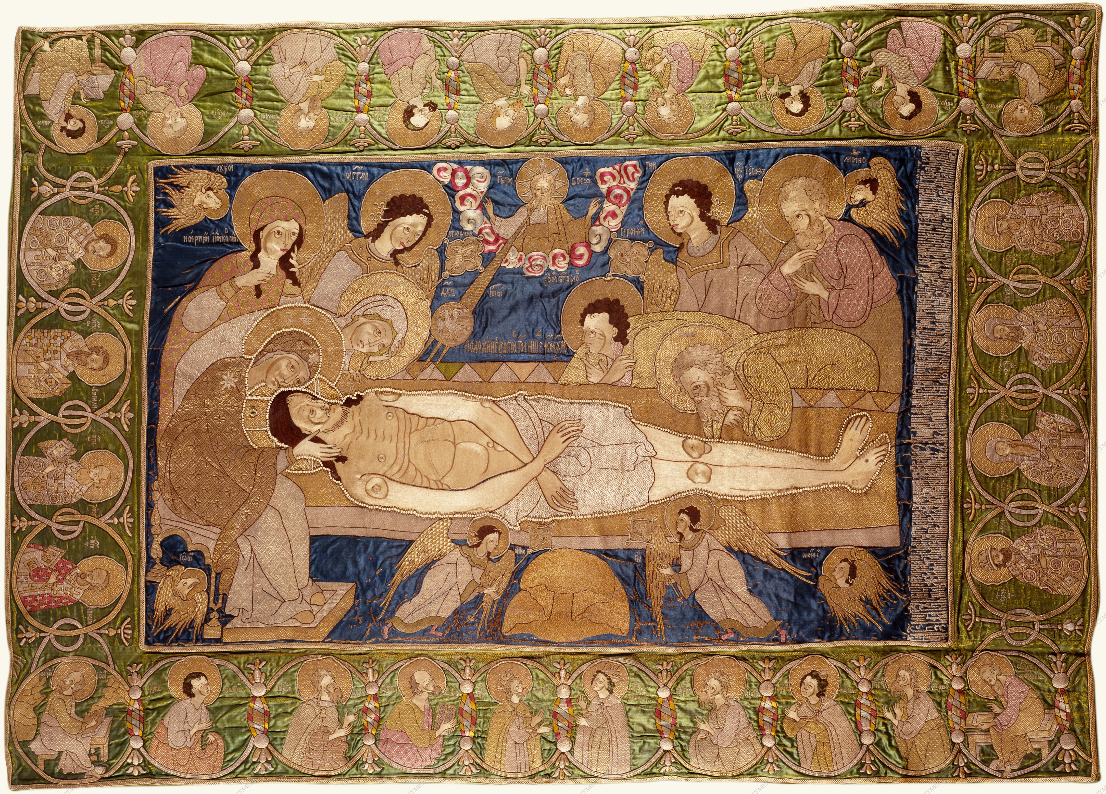 1444 год Москва (?) Шелковая ткань, золотные, серебряные и шелковые нити; шитье 124,5 х 183 Поступила в 1925 году Происходит из Юрьева монастыря в Великом Новгороде НГОМЗ инв. КП 2133, ДРТ 20