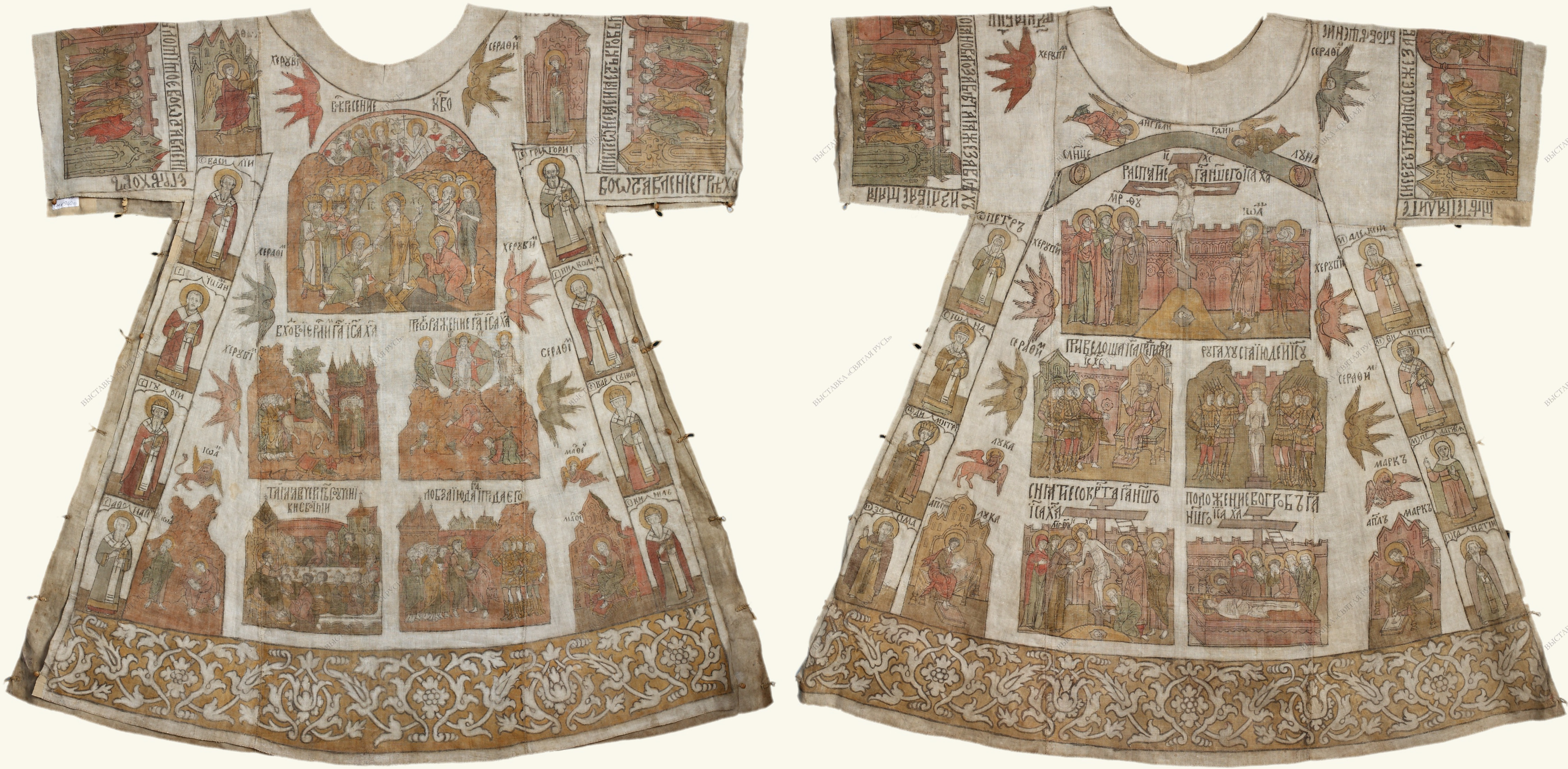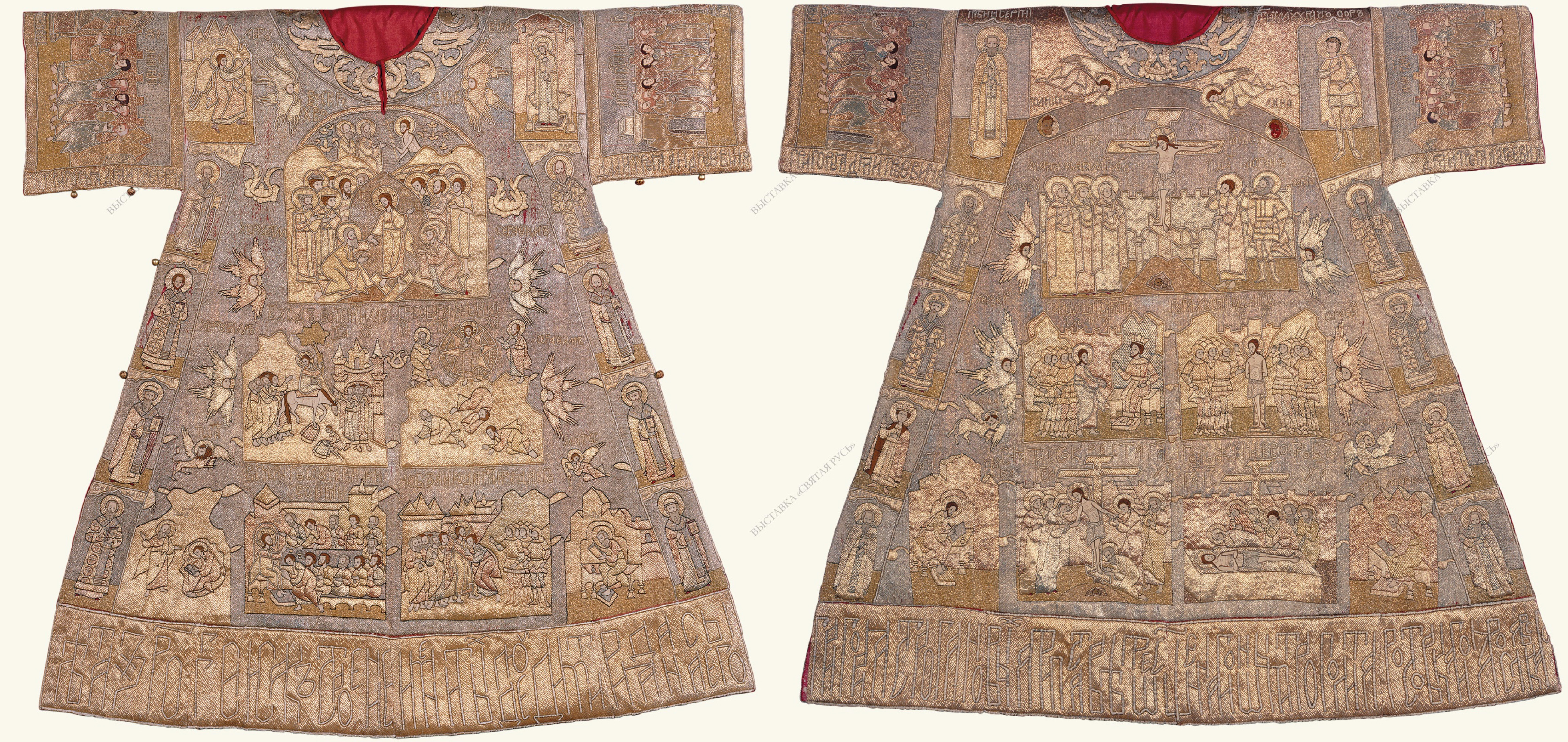 1665 год Строгановские мастерские Атлас, штоф, шелковые, золотные и серебряные нити, серебро, металл; ткачество, шитье 125 х 127 По подолу надпись, оканчивающаяся на задней стороне: ЛѢТА ЗРОГ ‹7173 = 1664/65› Г‹ОДА› СИИ САКЪ СТРОЕНИЕ ИМЕНИТЫХ ЛЮДЕИ ДИМИТРИЯ ДА СЫНА ЕГО / ГРИГОРИЯ СТРОГАНОВЫХ А ПРИ ПАСТВѢ ПРЕωС‹ВЯ›ЩЕННАГО ИωНЫ МИТРОПОЛИТА РОСТО‹ћКАГО И ЯРОСЛАВСКАГО. На зарукавьях (на каждом): ДМИТРЕЯ АНДРЕЕВИЧА / ГРИГОРЬЯ ДМИТРИЕВИЧА / СТРОГОНОВЫ Происходит из Ярославского архиерейского дома ЯГИАХМЗ инв. ЯМЗ-5432