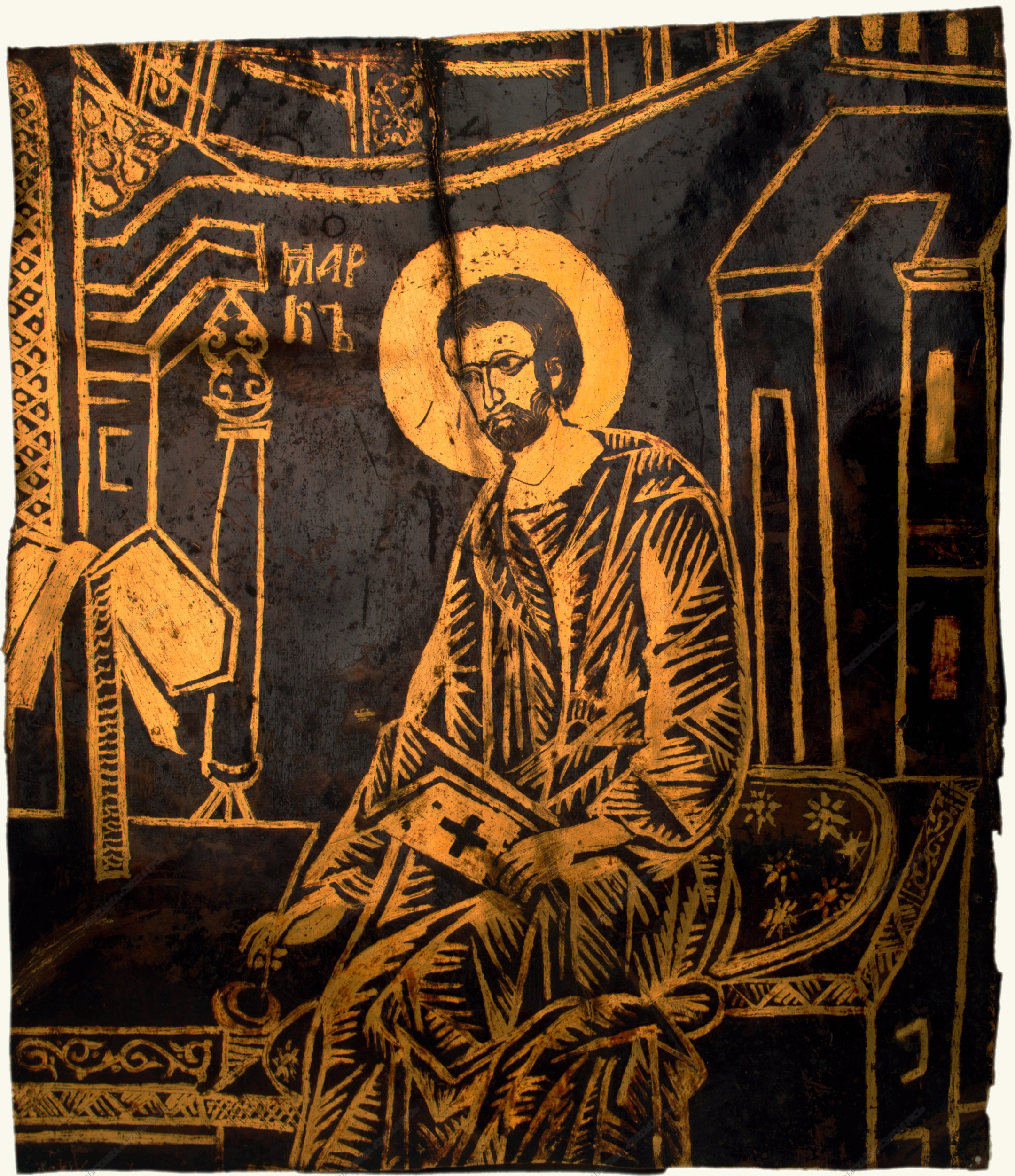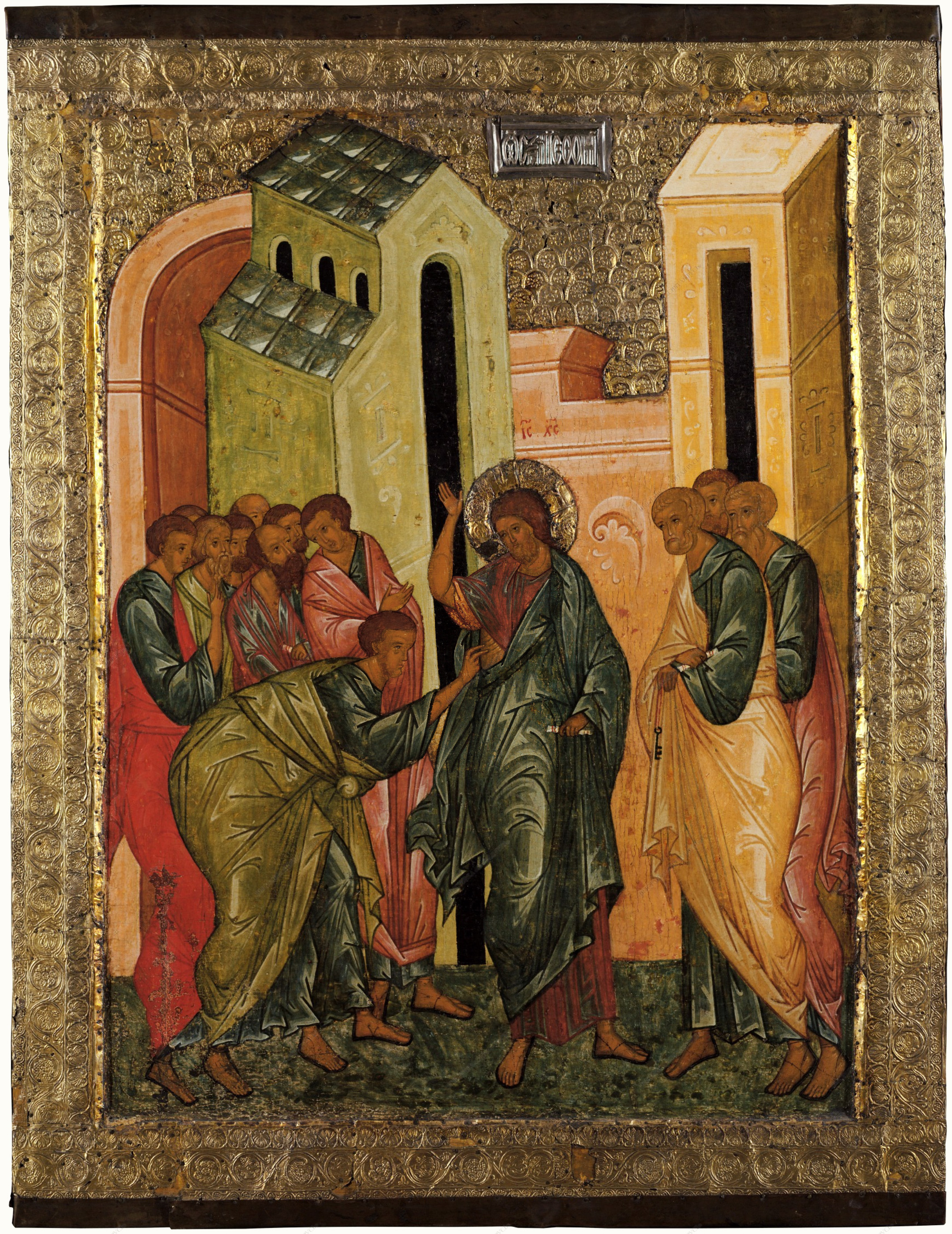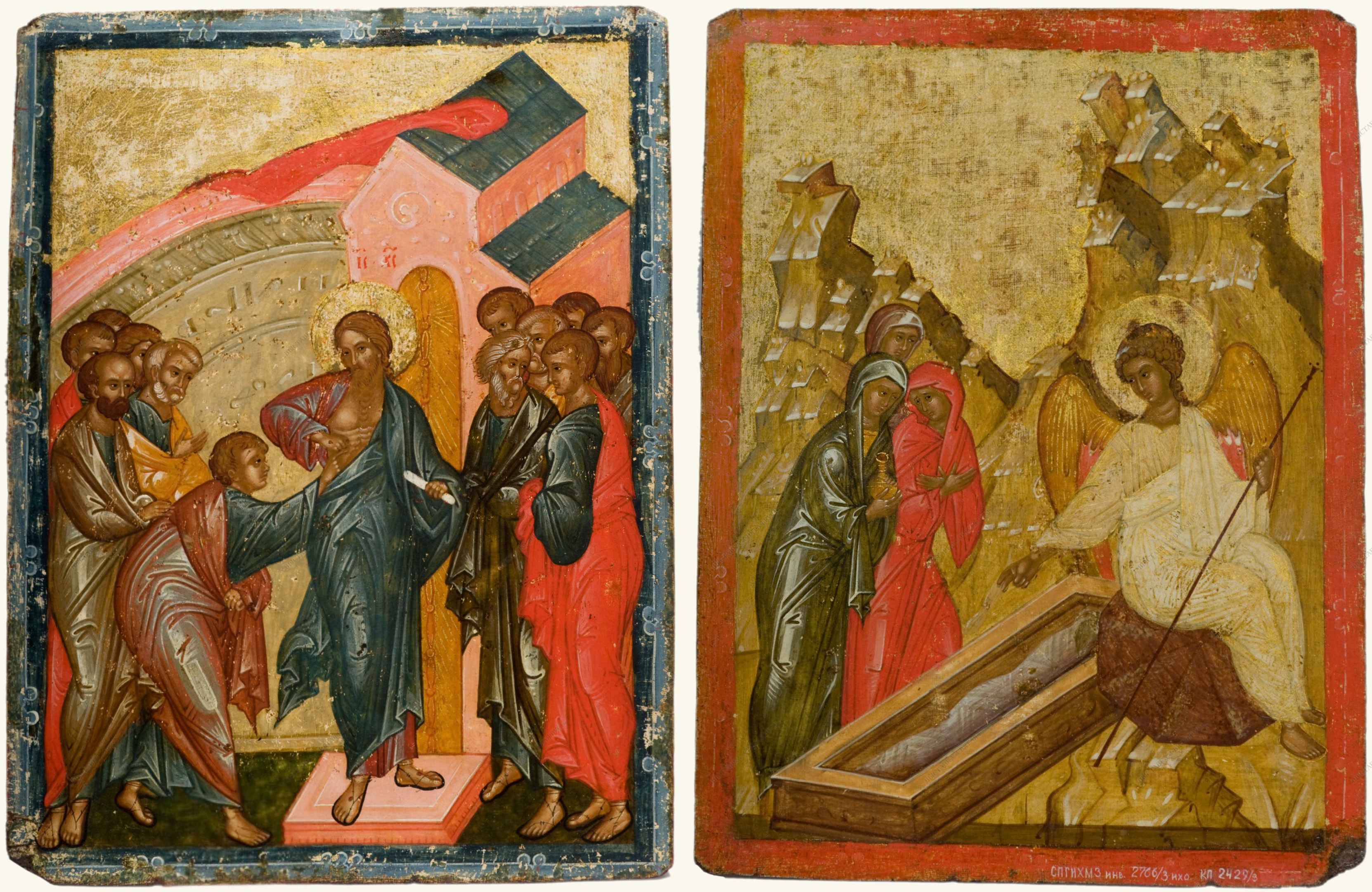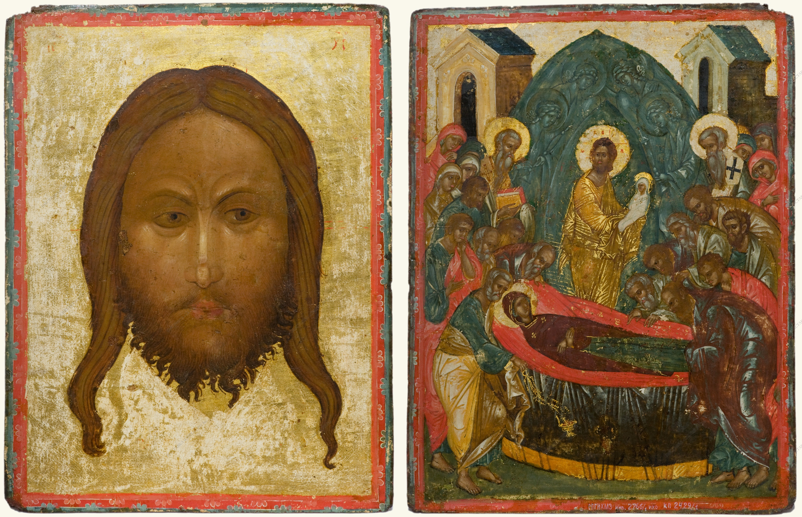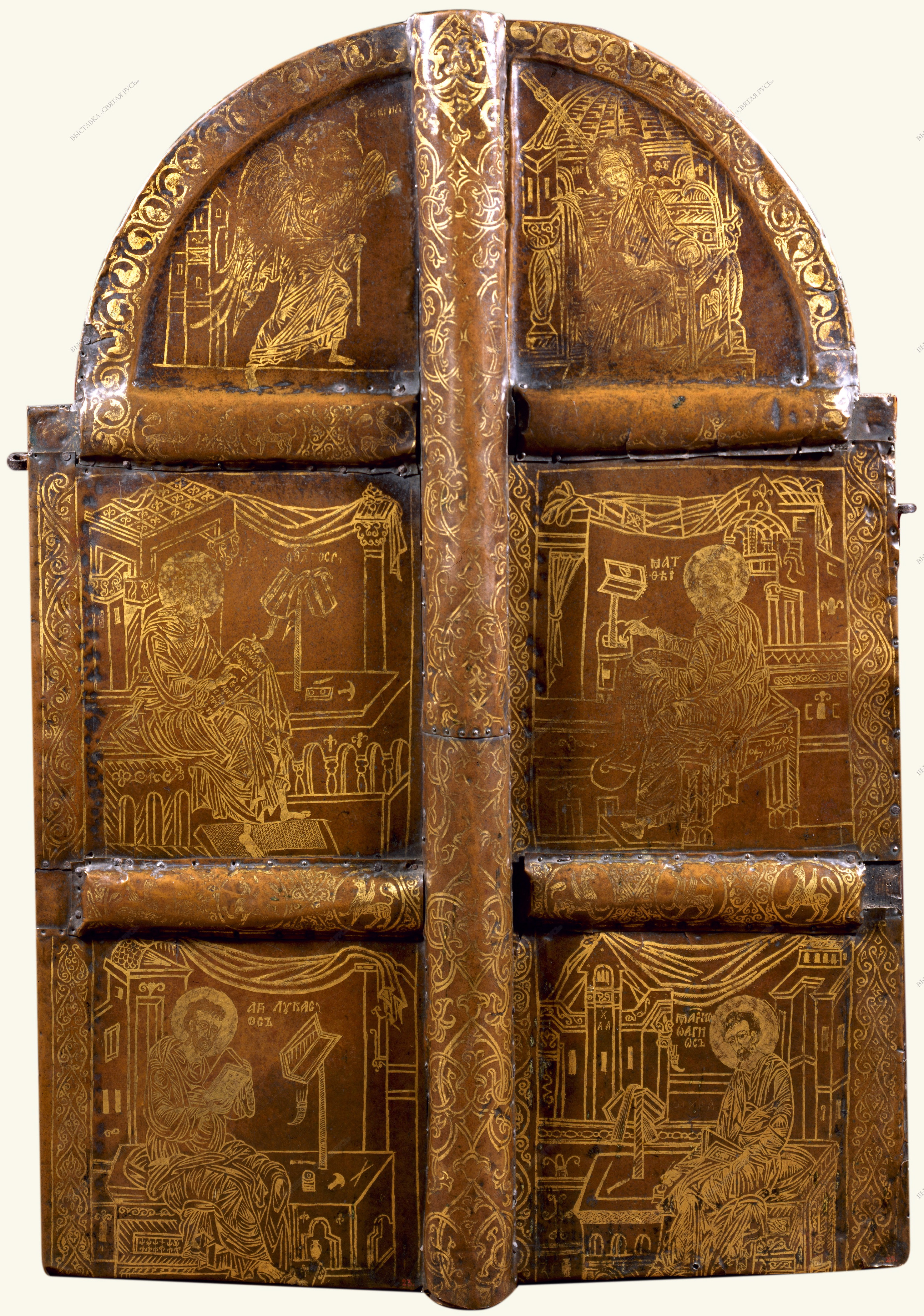 1330–1350-е годы Новгород Дерево, красная медь; золотая наводка 136 х 93 Поступили в 1913 году Происходят из Софийского собора в Великом Новгороде; затем находились в собрании Н.П. Лихачева, Санкт-Петербург ГРМ инв. ДРМ-3383