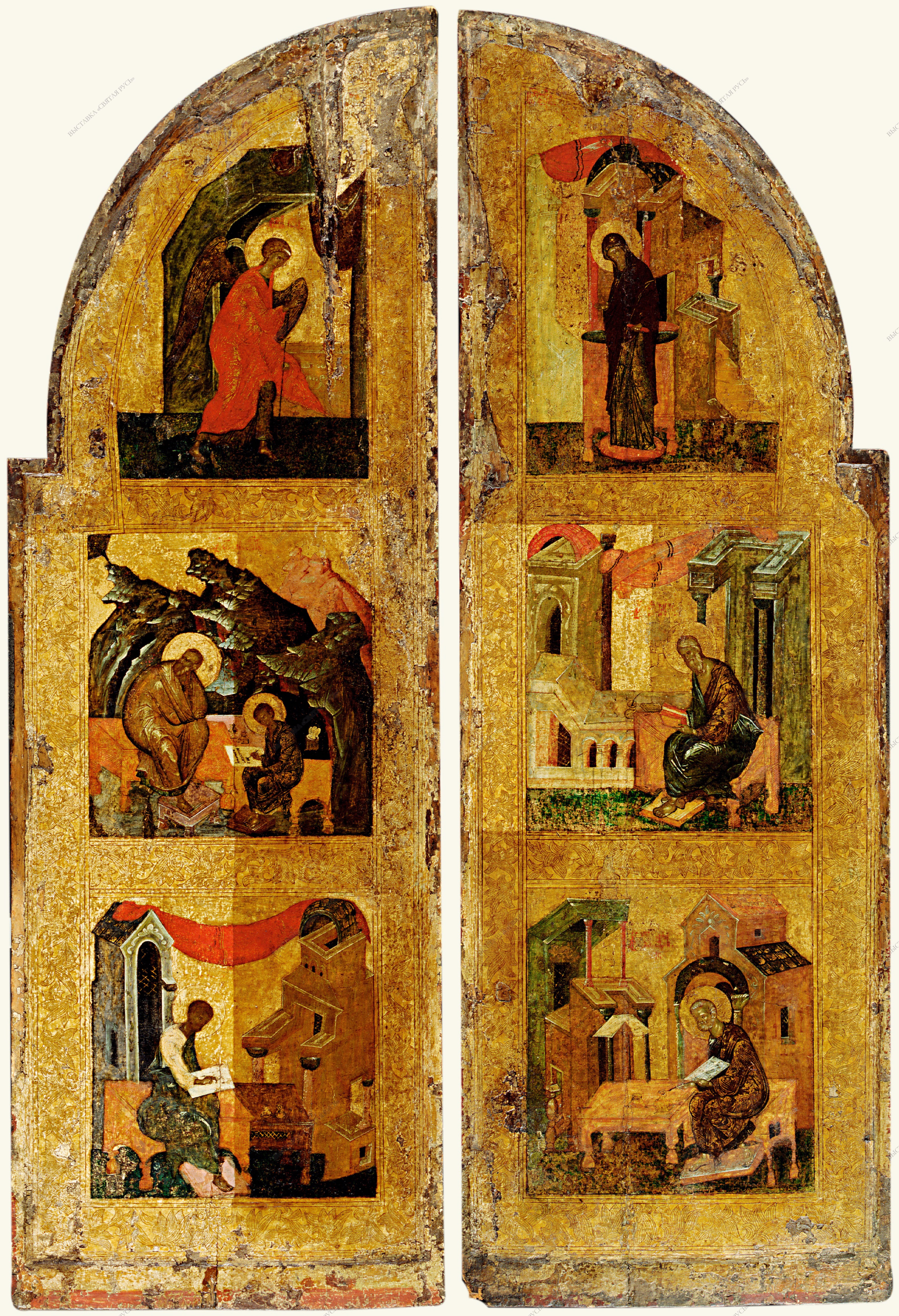 Первая четверть XV века Балканы (?) Дерево; темпера 158 х 51,5 (левая); 158 х 52,5 (правая) Поступили в 1929 году из Музея иконописи и живописи И.С. Остроухова Находились в собрании И.С. Остроухова Реставрированы до поступления в музей; повторно в 1989–1990 годах в ГТГ А.П. Бурмакиным ГТГ инв. 12024а, 12024б