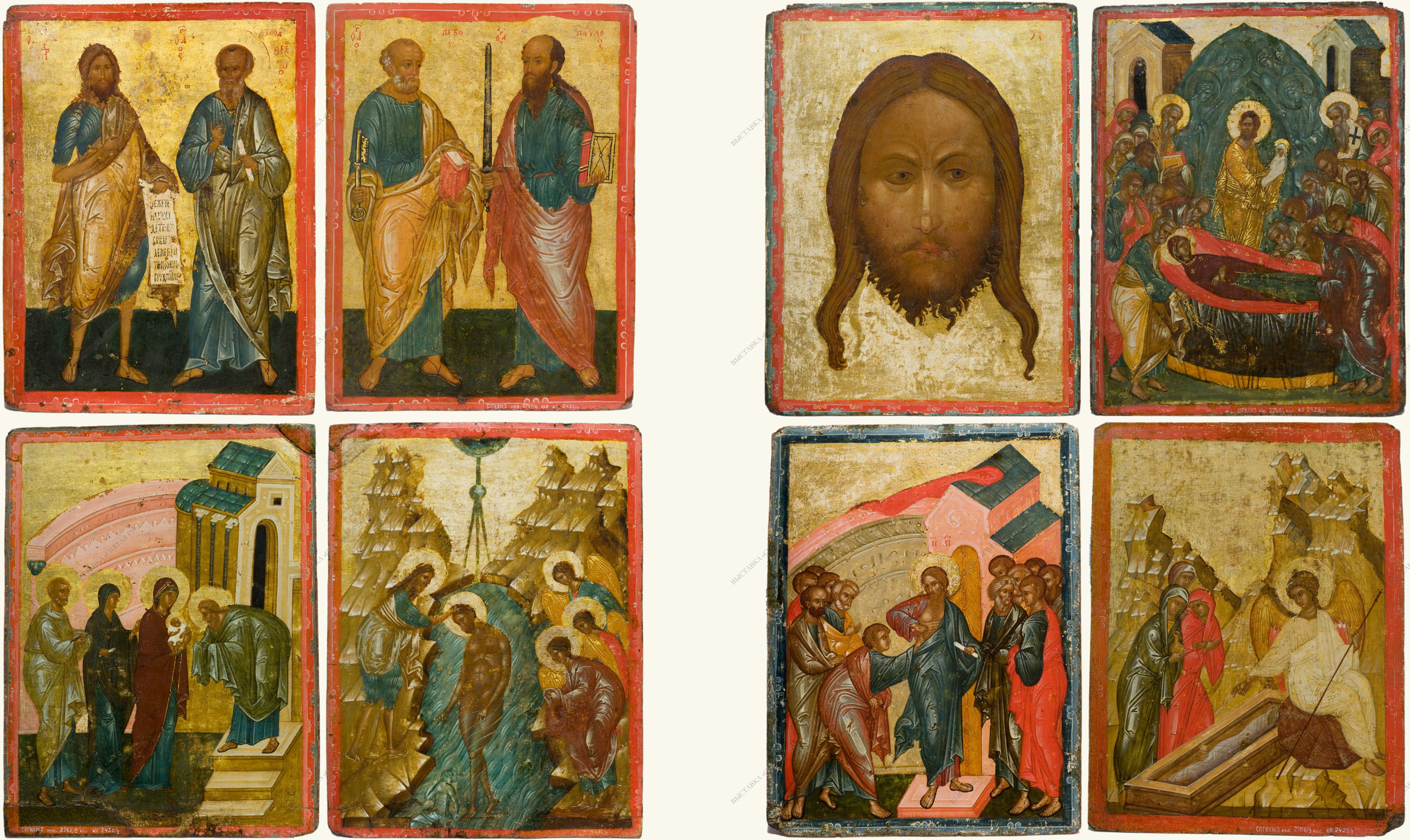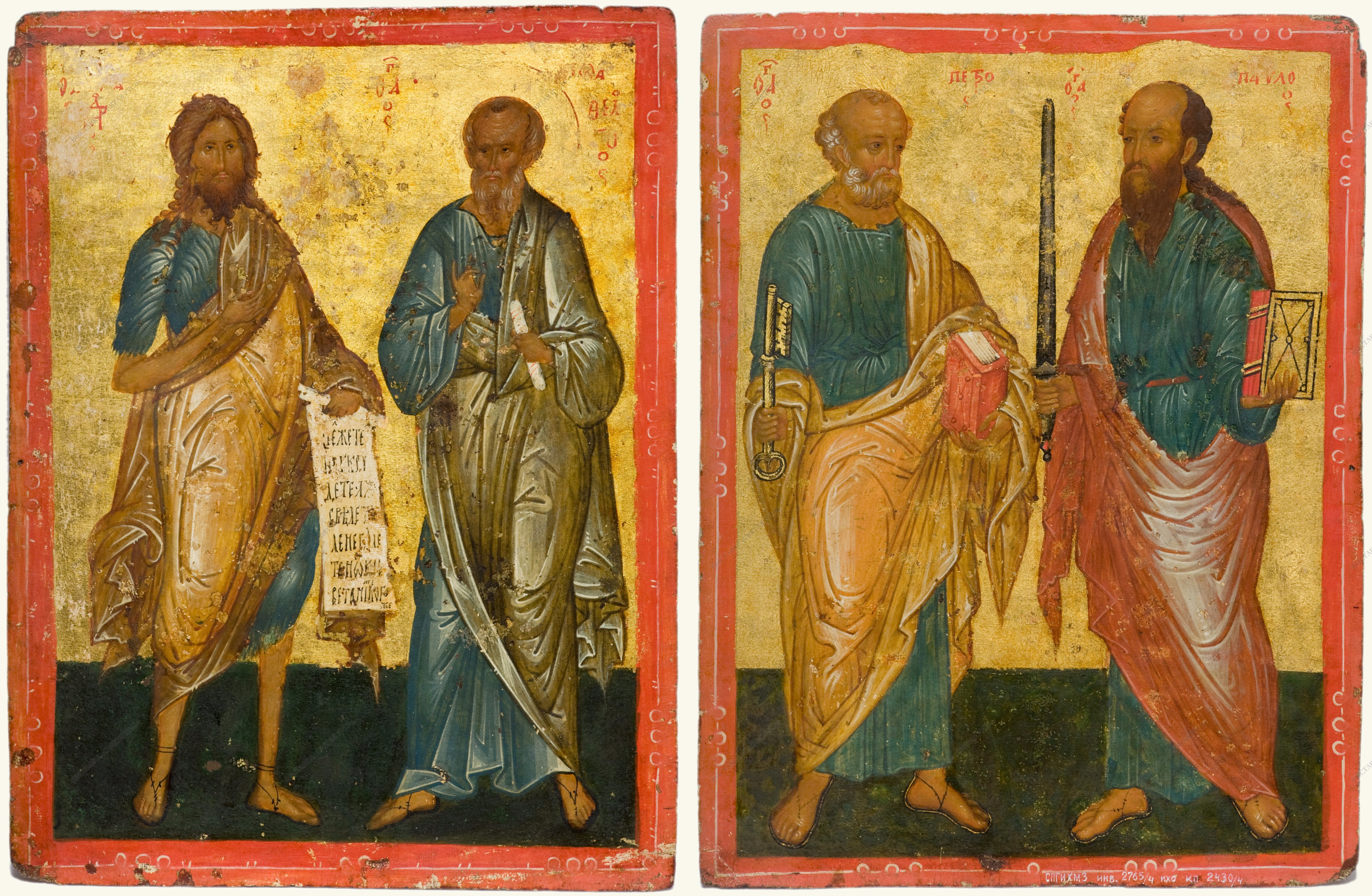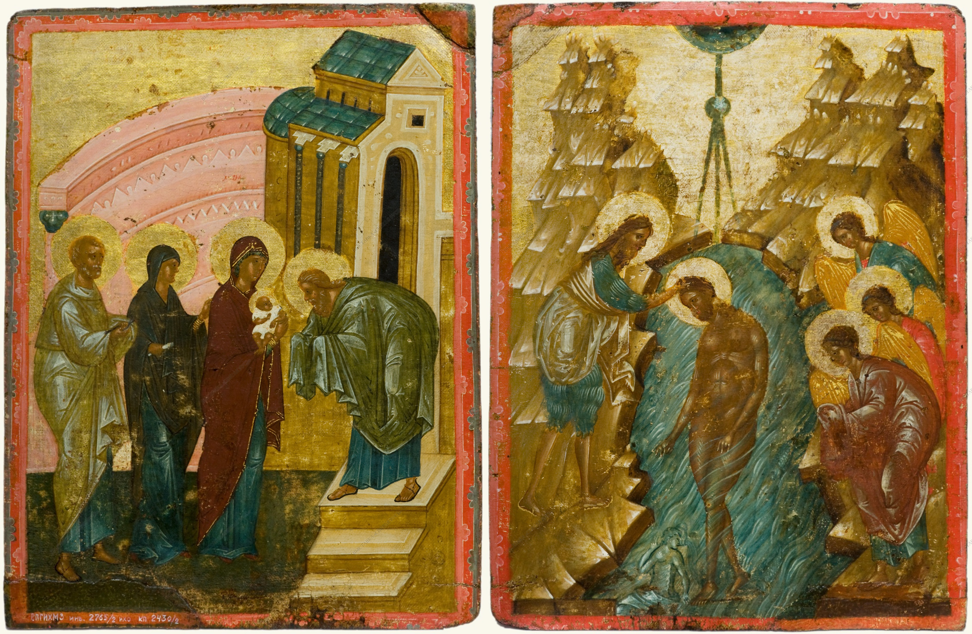 Двусторонние иконыXV векГреция Поступили в 1920 году Вклад в Троице-Сергиев монастырь келаря Вениамина Плещеева, занимавшего эту должность в 1485–1487 годах Реставрированы в 1948 году в ГЦХРМ Н.А. Барановым; в 1989–2000 годах в ГосНИИР О.В. Лелековой, Ю.А. Рузавиным, Н.Г. Брегманом, Н.П. Яблоковым; в 2007 году в СПМЗ О.Б. Куцель СПМЗ