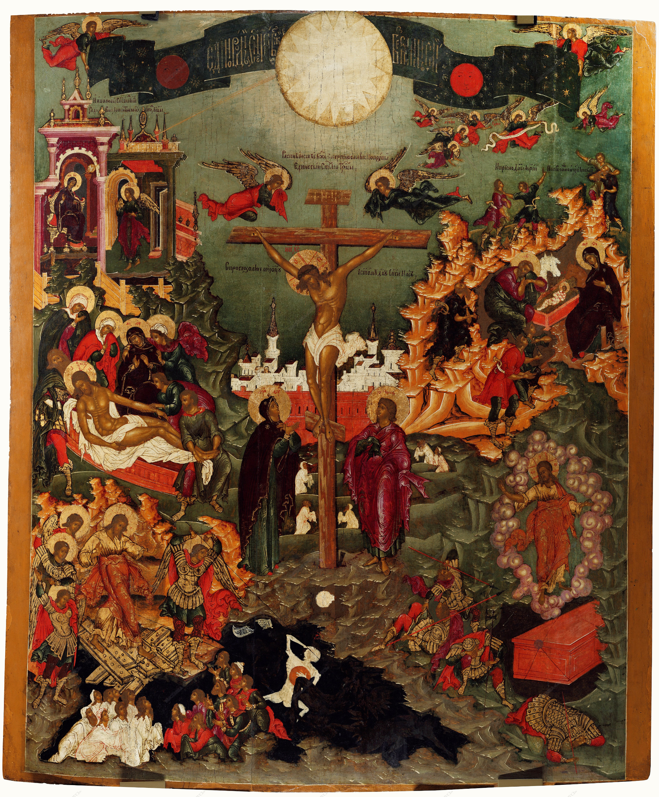 Симон Ушаков 1671 год Москва, Оружейная палата Дерево; темпера 126 х 90,2 х 3,5 Поступила в 1925 году из ГМФ В нижней части средника иконы надпись белилами: «+ΕΤΟС ΑΠΟ ΑΔΑΜ ЗΡΠ ‹7180›; || ΑΠΟ Χ[ριστο]Υ ΓΕΝΝΙСΕωС ΑΧΟΑ ‹1671› ΟΚΤω||ΜΒΡΙω 16 ΕΠΙΜΕΛΙΑ ΜΑСΤΟΡ || ΒΑCΙΛηΚU ΟΝΟΜΑΤΙ ΠηΜΙΝ ΘΕωΔΟΡ || ΠΑΡΑΝΟΜΙ СΗΜΟΝ СΙΑΚωΒ || ΕΝ ΠΟΛΗ ΜΟСΧωΒΙΑ» (лето от Адама 7180, от Рождества Христова 1671, октября 16, радение царского мастера именем Пимен Федоров, прозванием Симон Ушаков, в городе Москве); «ΕΠΙСΤΑΤΙС ΚΑΙ СΗΝΔΡΟΜΗΤΙС ΝΙΚΟΛΑΟ ΕΥСΤΑΘΙΟΥ ΝΙΚΟΛΕΤΑ» (надзиратель и плательщик Николай Евстафиев (сын) Николета); «ЗА ПОКОI СХIМНIКА || ФIЛАРЕТА СХИ(М) САВАТИА || СХI(М) СЕРГIА» Происходит из церкви Воздвижения Креста в Таврическом дворце в Санкт-Петербурге Раскрыта в 1926–1927 годах в ГРМ И.Я. Челноковым и в 1936 году Я.В. Сосиным ГРМ инв. ДРЖ-2147