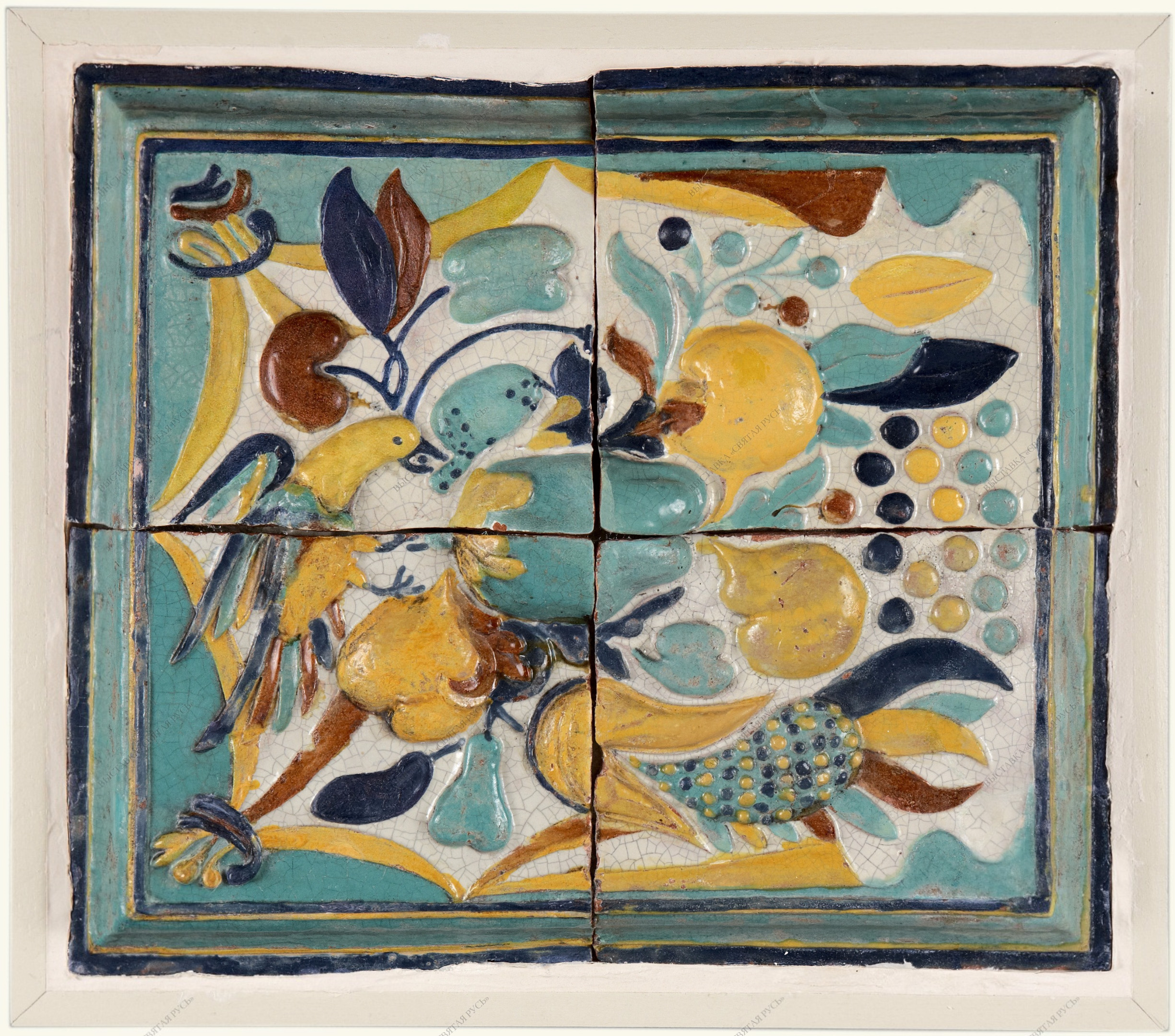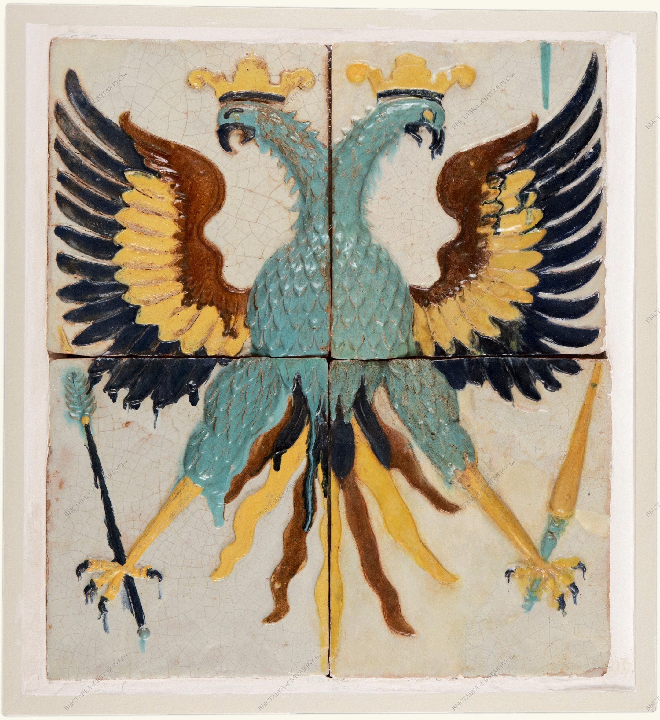 1689 год Москва Майолика (глина красная, цветные глазури); формовка, раскраска, обжиг 54,7 х 48,2 х 17 Поступило в 1932 году Происходит с колокольни церкви Космы и Дамиана в Садовниках в Москве МГОМЗ инв. КП-5842, КП-5819, КП-7973, КП-4737