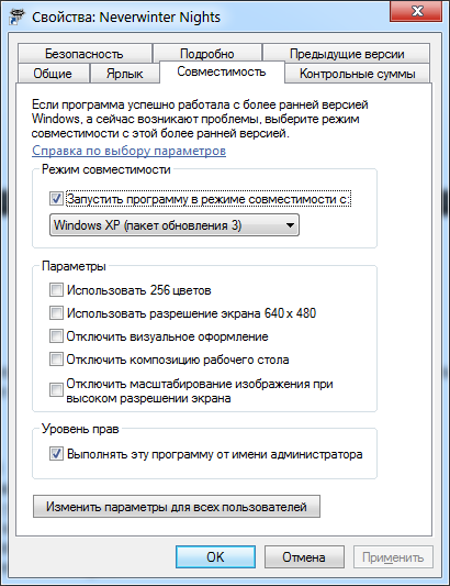 Если возникают проблемы при запуске игры Neverwinter Nigts, то запускайте её в режиме совместипости с Windows XP SP3 и от имени администратора.