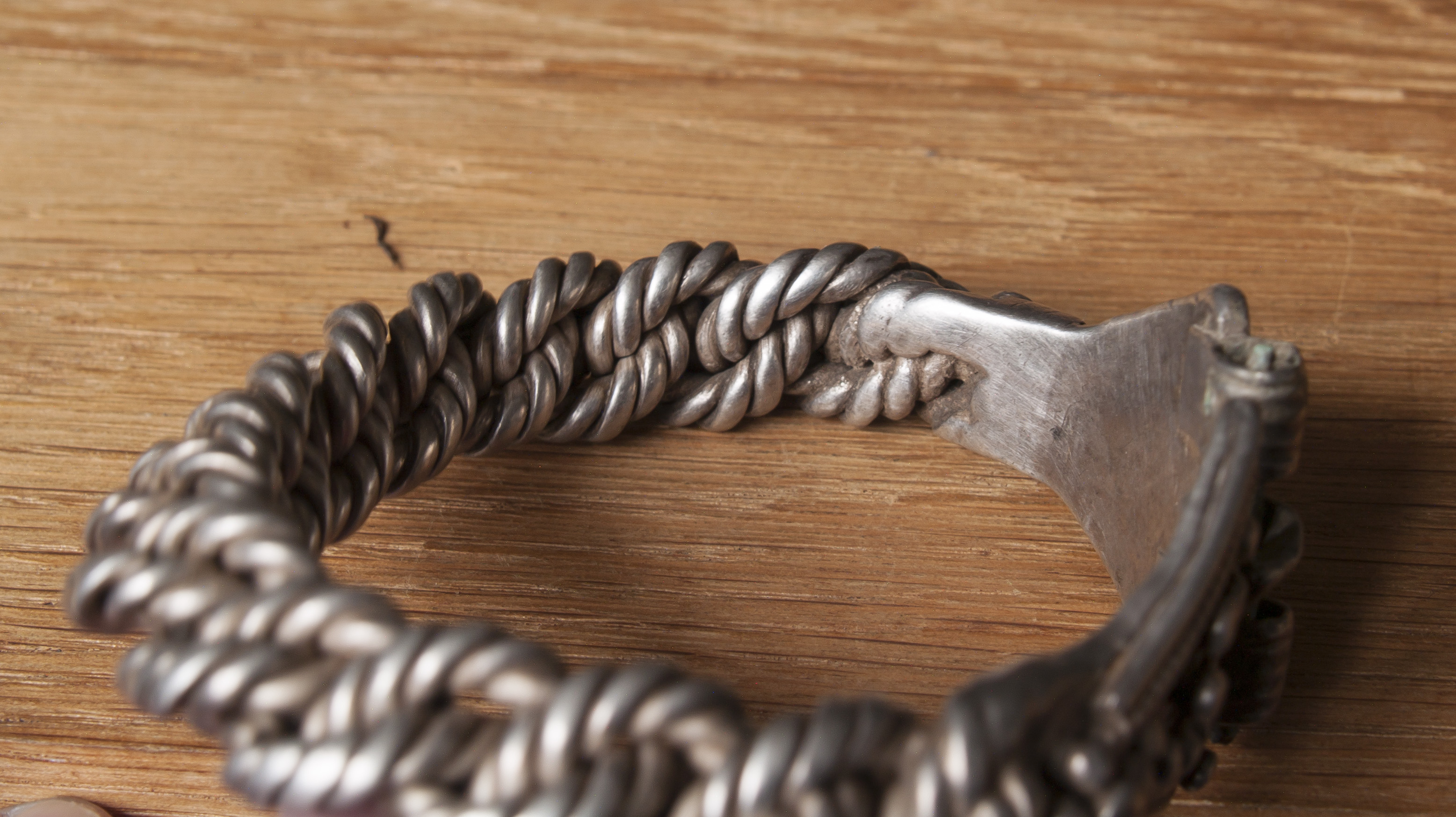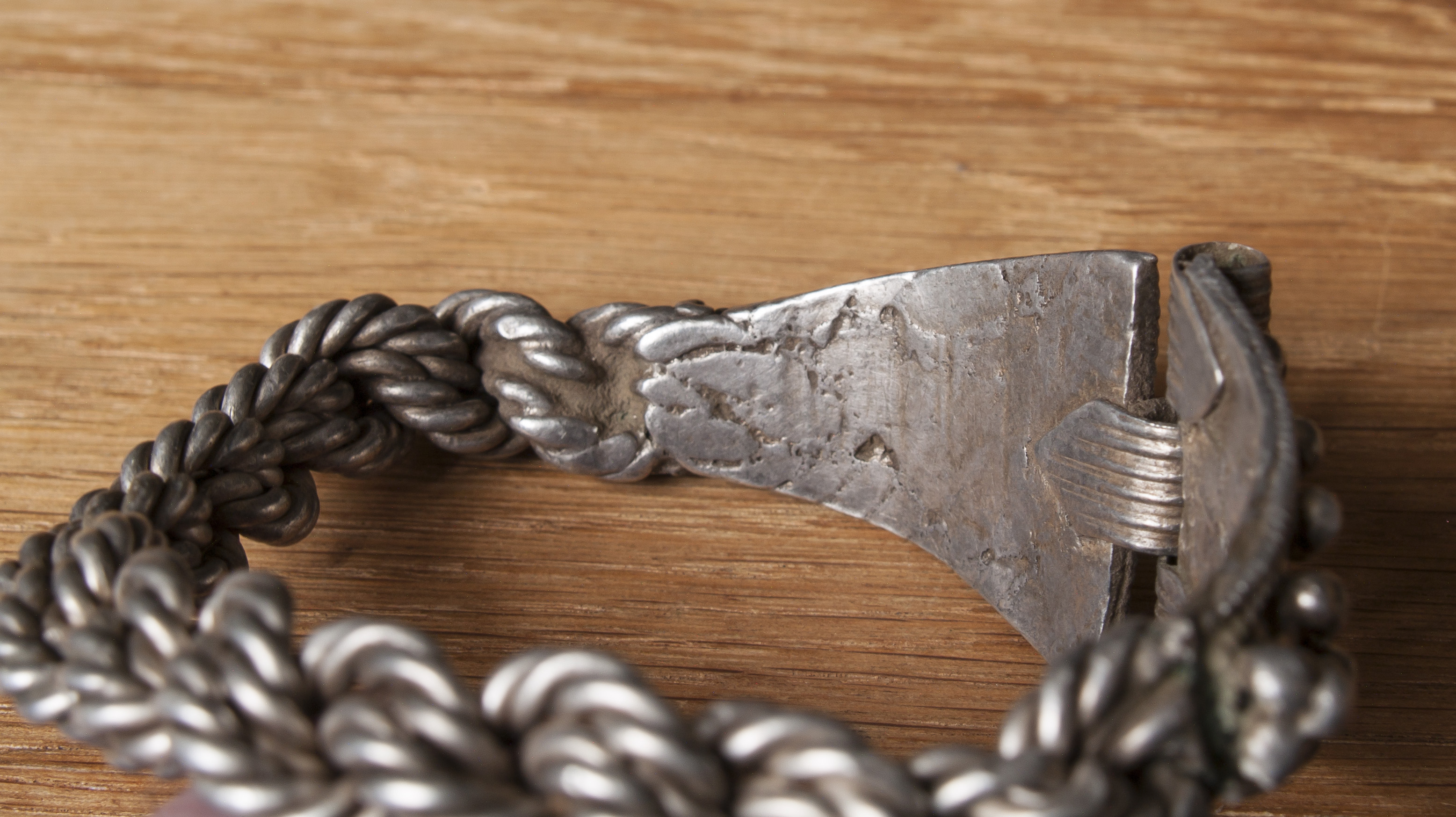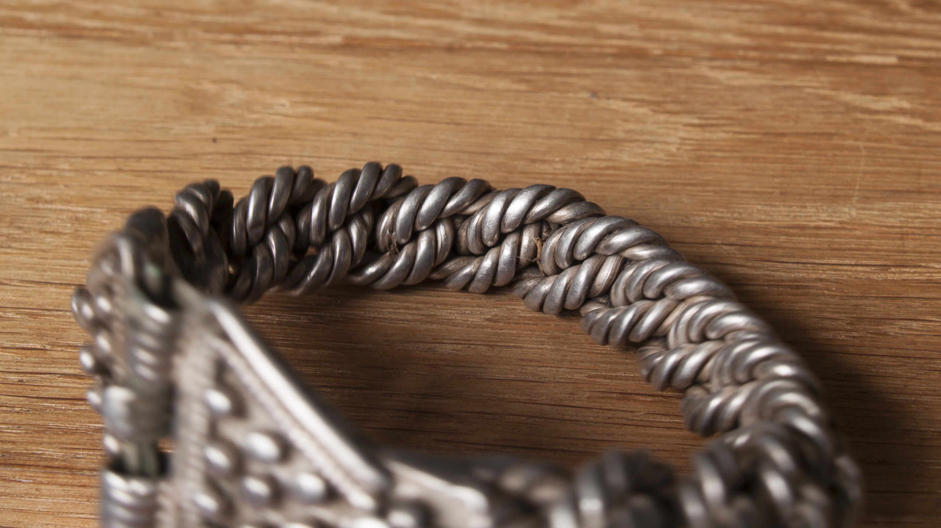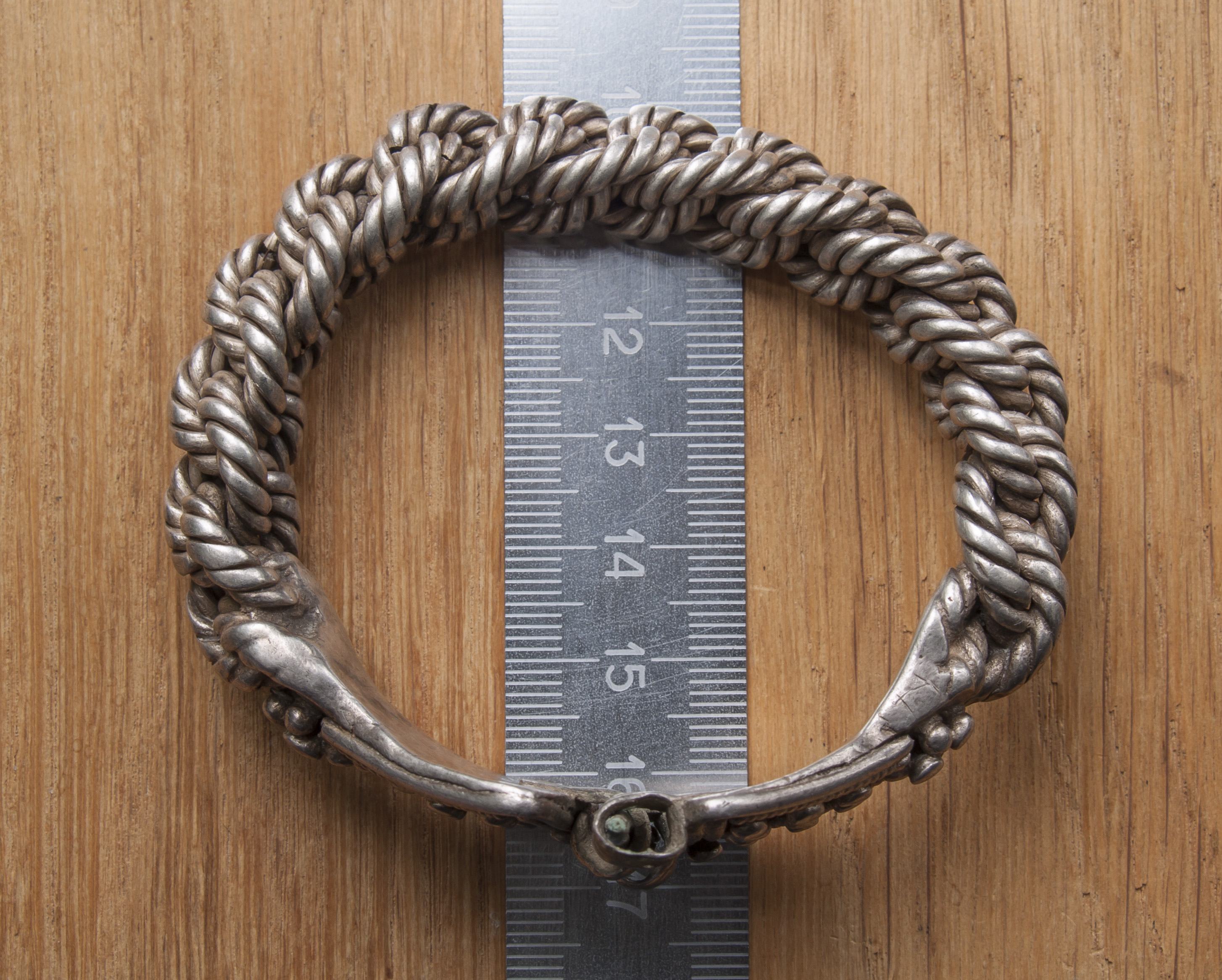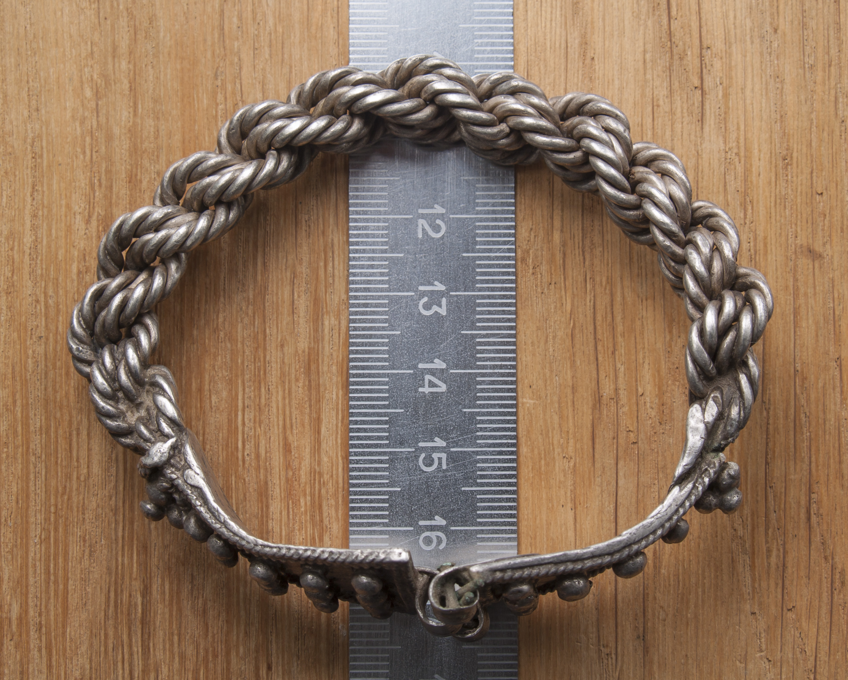Фото второго браслета. Такие браслеты по мнению swordmaster.org являются продолжением древнерусских традиций браслетов и шейных гривен с расширяющимися концами и сложноплетеннх серебряных колец на палец. К 13 веку мода на цилиндрический браслет-наруч, украшенный мелкой зернью и чернью начала угасать, а после монгольского нашествия древнерусское ювелирное искусство получило сокрушительный удар, от которого не оправилось. Однако, судя по всему, такие браслеты были в обиходе с XIII по XV век на территории Великого Княжества Литовского.