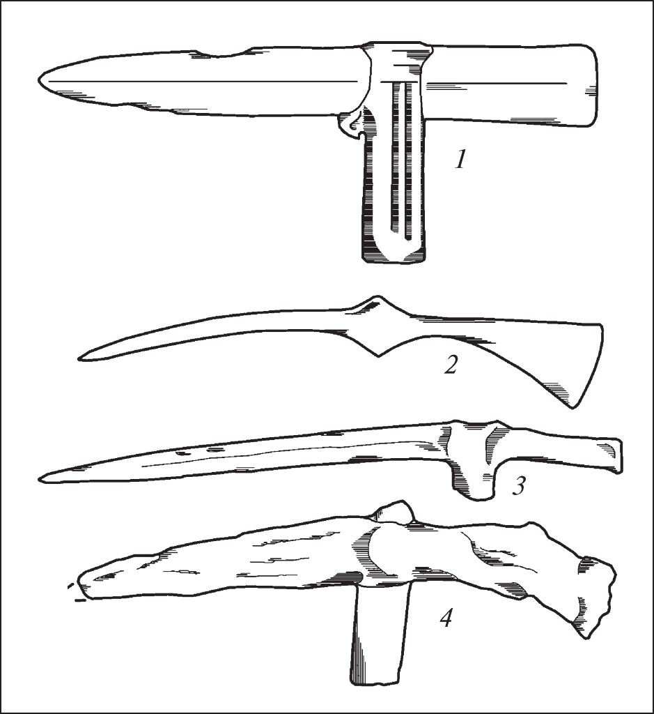 Типология ударно-рубящего оружия. Группа II – чеканы: 1 – Орехово; 2 – Трахтемировское городище; 3 – Мелитопольский курган; 4 – Первая Завадская