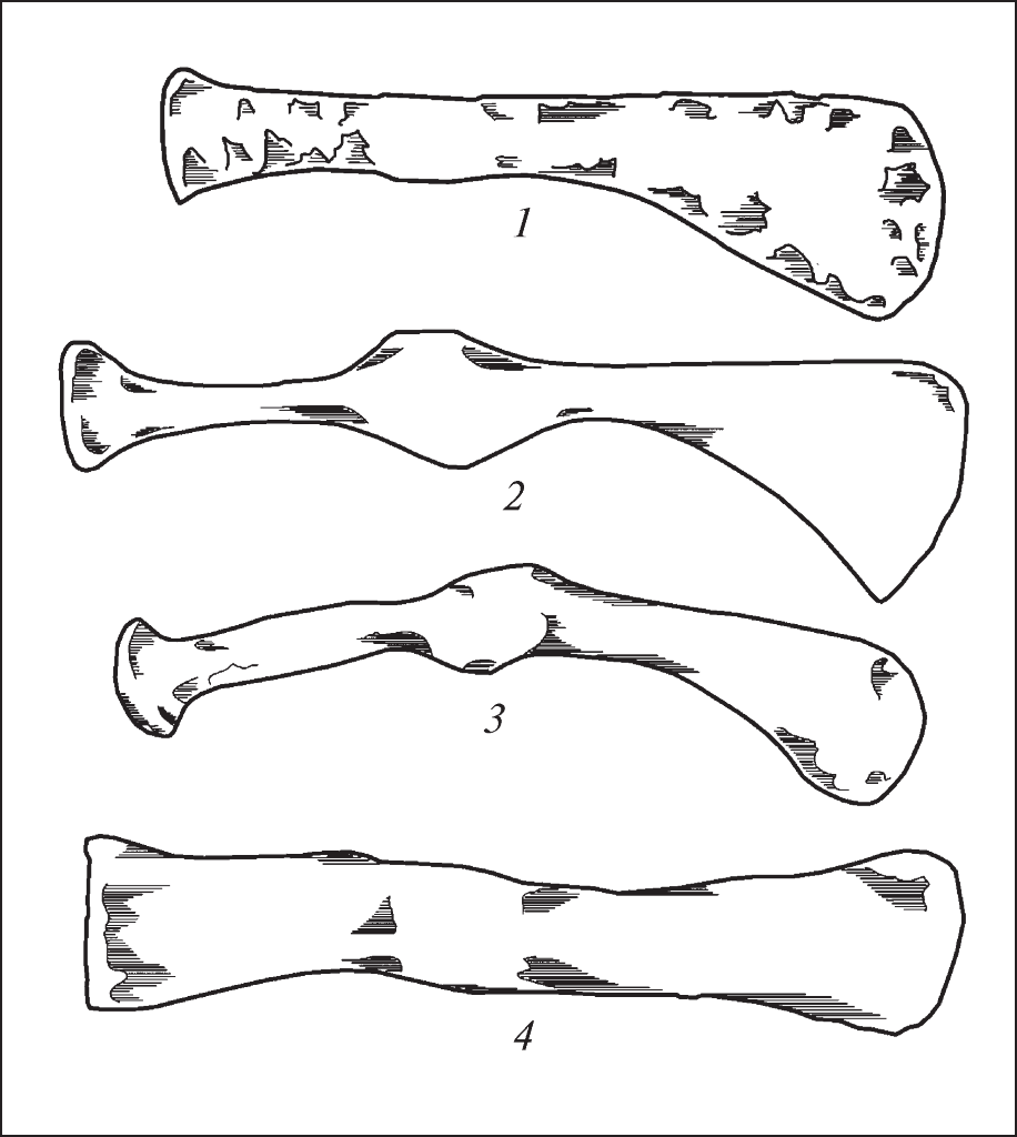 Типология ударно-рубящего оружия. Группа I - боевые топоры: 1 - Старшая Могила; 2 - Дуплинское; 3 - хут. Шумейко; 4 - Малая Офирна