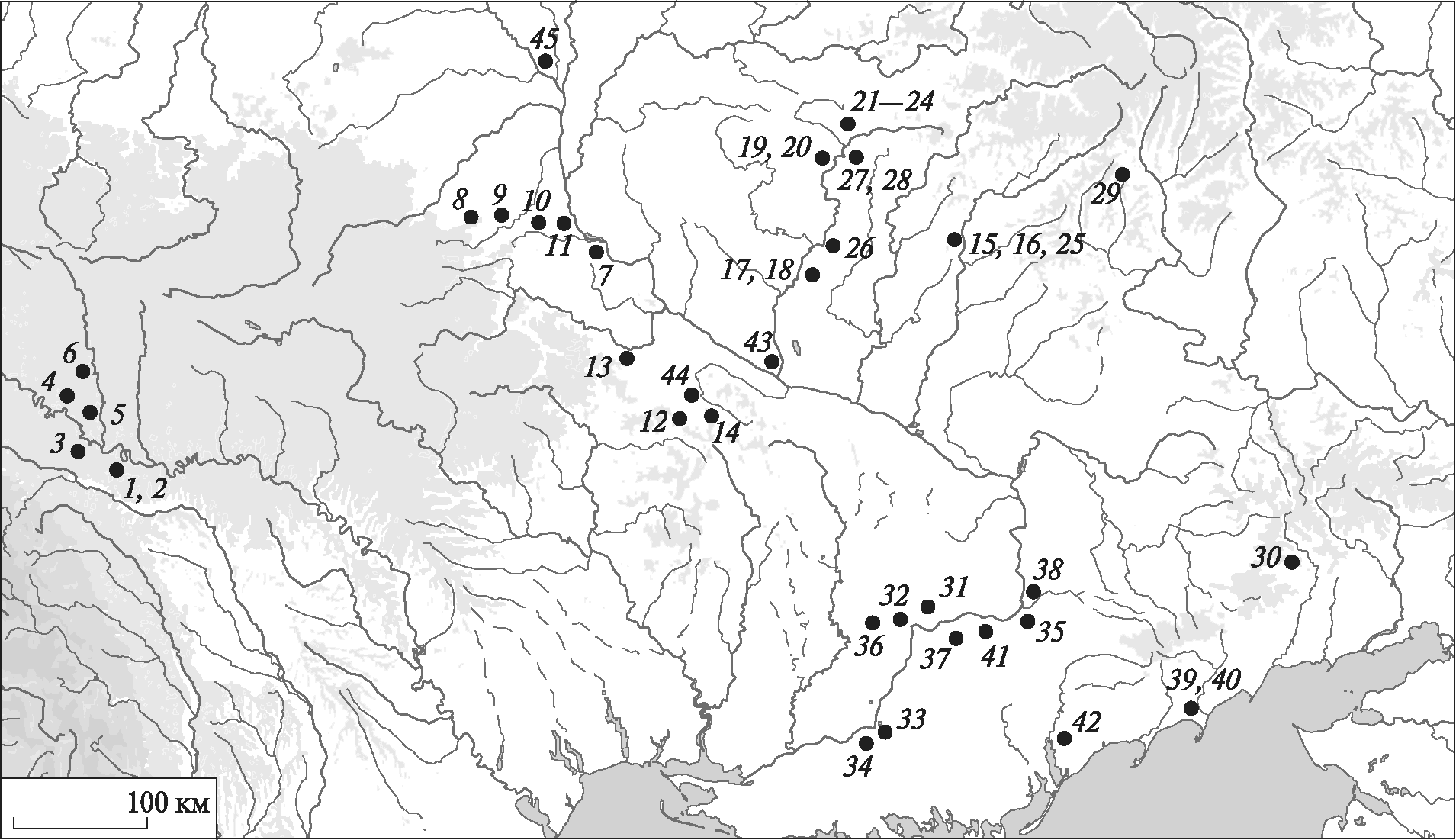 Рис. 3. Распространение ударно-рубительной оружия на территории Северного Причерноморья. Нумерация подана согласно каталога