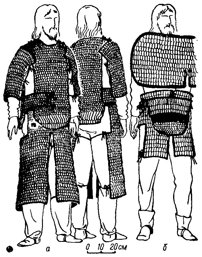 Нагрудно-наспинная часть панциря представляет собой прямоугольное полотнище с ровными боковыми краями, двумя противолежащими вырезами (большим сверху и меньшим снизу), делящееся приблизительно па две равные части. Одна из них несколько короче другой и имела сверху небольшой округленный вырез-горловину. Панцирь был скроен в виде «куртки» с разрезом на правом боку, разрезами и завязками па плечах. На левом боку находились пройма для руки и закругленный вырез па подоле для свободного движения ног, особенно при езде верхом.