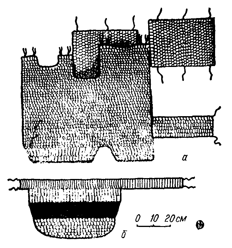 Второй комплект составляли предметы, из которых часть впервые встречается в скифской паноплии. К их числу относится почти целый малый набедренник — полоса набора длиной 109, шириной 24 см, от которой отходят две прямоугольные лопасти длиной 24, шириной 26 см. Доспех завязывался спереди, полностью прикрывая таз и ноги спереди до середины бедренной кости (рис. 2, б). Кстати, он дает нам и контрольный объем талии — около 100 см. С малым набедренником лежал еще один специфический доспех, состоявший из полосы набора из трех рядов чешуек размерами 4,5 x 2 см, причем чешуйки верхнего ряда слегка изогнуты, как у портупейных поясов3, а сам верхний ряд выступает влево на несколько сантиметров; поверх него лежал ряд чешуек тех же размеров, но не изогнутых. Вероятно, он являлся продолжением ряда изогнутых чешуи, а вместе они образовывали пояс длиной около 100 см, тогда как длина двух нижних рядов составляла около 50 см. Снизу к ним примыкала полоса набора из более мелких чешуек. Один (длинный) край ее округлен. В погребении округленный край был обращен вверх, примыкая к нижнему краю описанной полосы набора с поясом. Но вряд ли это было ее первоначальное положение: тогда как трехрядная полоса лежала лицом вверх, сегментовидная найдена изнанкой вверх. Ее размеры (ширина — 11, длина — 48 см) говорят о том, что она составляла нижнюю часть доспеха вместе с трехрядной полосой. Видимо, между нижним краем этой полосы и верхним краем сегментовидной имелся зазор из кожаной основы доспеха шириной около 10 см. В погребении нижняя часть доспеха была отогнута изнанкой наружу. Полностью доспех состоял из набрюшника, скомбинированного с поясом, завязывавшемся на правом боку; спереди ширина его достигала 58, а высота около 35 см; прикрывался живот от талии до его нижней части. Кожаный зазор и набор из мелких чешуек нижней части, округлый абрис которой подчеркивал линию низа живота, обеспечивали максимальную подвижность туловища именно в тазобедренной части, что необходимо при езде верхом без стремени. Набрюшник дополнял малый набедренник и носился, скорее всего, поверх него (рис. 2, б).