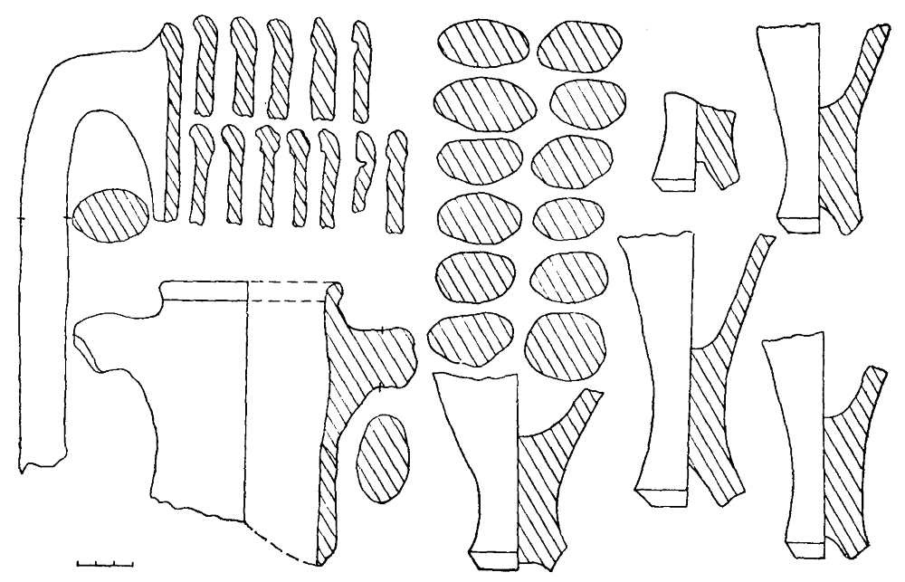 21. Четыре железных цилиндрических втока от копий и дротиков: два целых (длина 6,2 и 8 см при диаметре 1,7 и 2 см) и два обломанных (сохранившаяся длина 9,7 и 5 см при диаметре 1,9 и 1,4 см) (рис. 12, 2, 6-8).