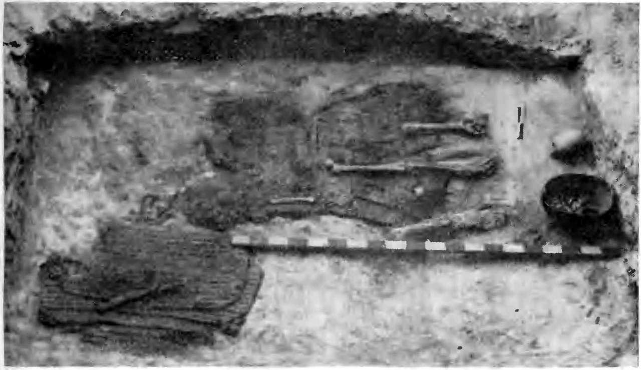 Погребенную сопровождали: напутственная пища (задняя часть лошади или быка) с ножом (1), лежавшая на истлевшем деревянном блюде, окованном по краю железной полоской; зеркало (2); фрагмент каифара (3); пряслице (4); железный предмет (5).