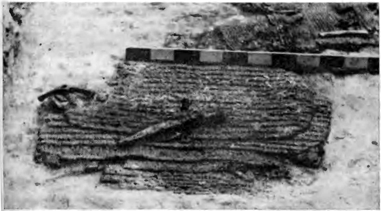 Остался невыясненным характер основы щита. Связь пластин в наборе щита нроизводнлась, скорее всего, с помощью ремней6, так как следы проволоки отсутствуют. Характер связи пластин, размеры н вес шита требовали использования твердой деревянной основы.