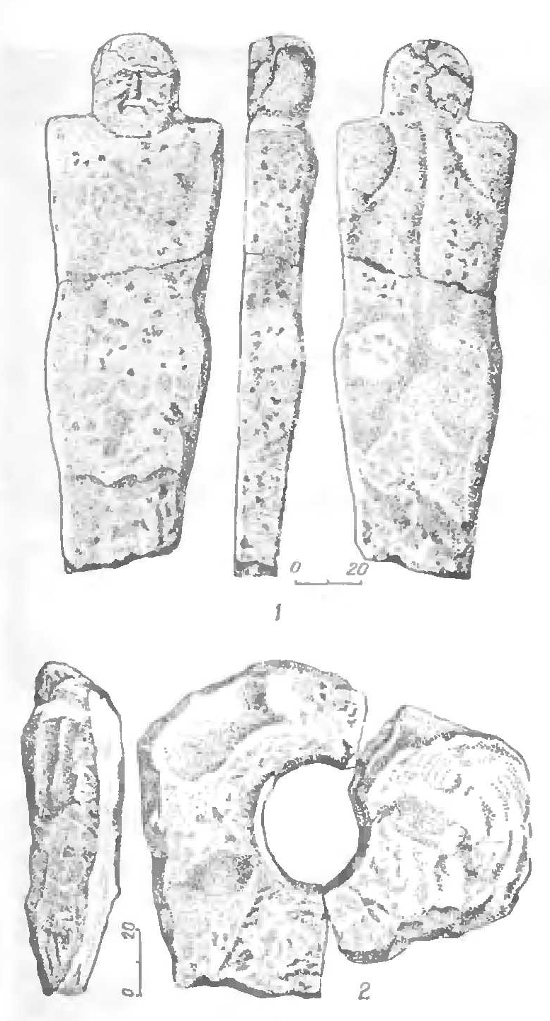 Рис. 7. Антропоморфная стола (1) и плита постамент (2).  Рис. 8. Находки из погребения № 1.