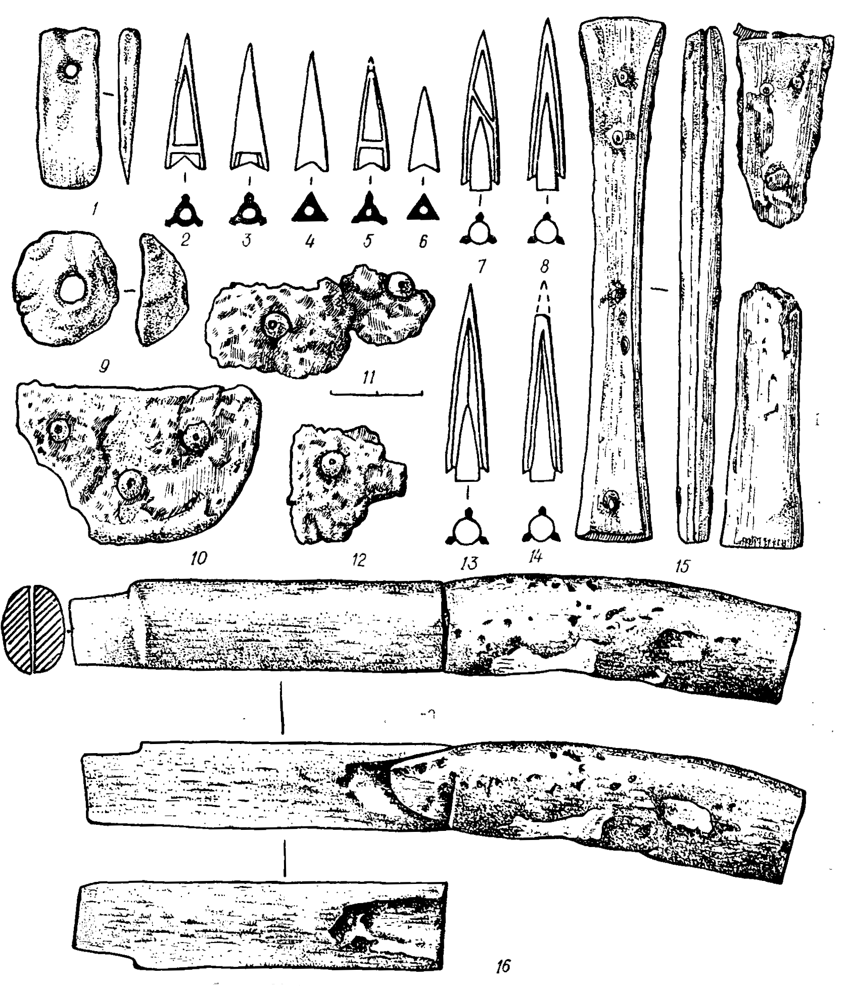 3. Бронзовые втульчатые наконечники стрел (18 экз.); трехлопастные с выступающей втулкой, ложком до острия — 11 экз., из них шесть наконечников во всех ложках имеют тамгообразный знак — рельефную косую черту. Длина 3,1-3,9 см (рис. 8, 7, 8, 13, 14); трехгранные со скрытой втулкой, свисающими остриями граней — 7 экз., из них три наконечника имеют гладкие грани, два — с небольшим П-образпым ложком в основании, два — с неглубоким ложком до острия и горизонтальной перегородчатой чертой в основами. Длина 1,9-3 см (рис. 8, 2-6).