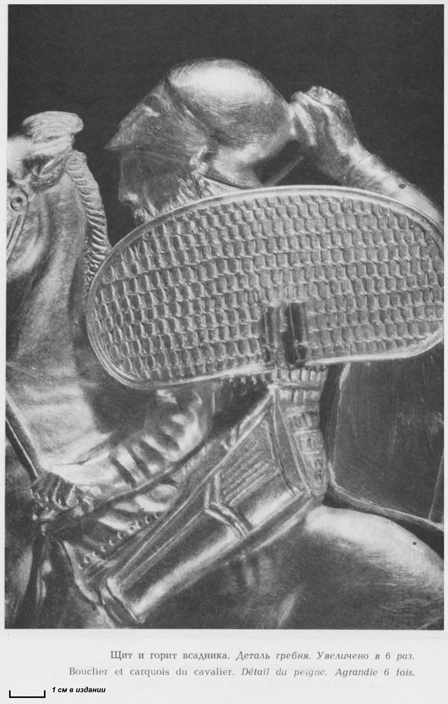 Щит из Красного Подола во многом сходен со щитом всадника на Солохском гребне. Незначительные различия прослеживаются лишь в форме. Всаднический5 щит такого типа мог быть достаточно распространенным. Возможно, что щит из Золотого кургана относился к этому же типу. Не вызывает сомнений, что этот вид щита был хорошо известей греческому мастеру-торевту, автору Солохского гребня. Верно уловив общий контур и некоторые детали, мастер совершенно произвольна соотнес их на изображении и домыслил способ крепления щита (рис. 17). Прежде всего, учитывая длину щита (около 1 м), а значит, и большой вес, размещение параллельных втулок посередине, с чисто технической точки зрения способ крепления его на железных крюках на поясе за спиной не возможен без дополнительных креплений Для обеспечения устойчивого положения щита и свободы действия воина ? бою необходимы были дополпительньн крепления, по крайней мере еще в двух точках, например с помощью наплечных ремней. Следует отметить, что в рассматриваемом комплексе отсутству ет что-либо похожее на крюки. Красно-подольский щит, в отличие от изобра женного на Солохском гребне, изгибается по горизонтали в сторону, противоположную вырезу и втулкам, что указывает на его практическое использованне вверх ногами. При закреплении этого щита в положении, изображенном на Солохском гребне, центр тяжести значительно смещался от точки крепления и равновесие нарушалось еще больше.