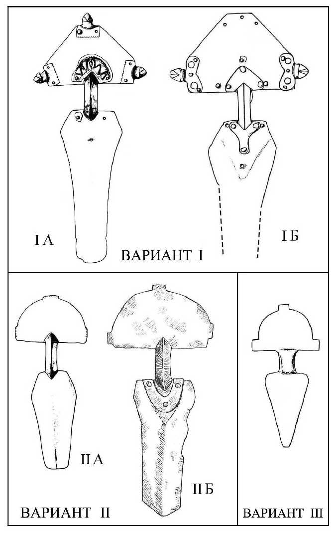Что касается двупластинчатых фибул без накладок (с выступами на головке – вариант II по А.И. Айбабину), то и эту разновидность также можно разделить на две группы, различия между которыми выражаются не только в размерах (рис. 1). К группе А мы относим маленькие изделия, длиной менее 14 см, имеющие ножку обычной ромбовидной формы (в отличие от маленьких фибул с треугольной ножкой, которые следует выделить в особый вариант – вариант III). Группу Б составляют крупные экземпляры длиной от 14 до 18 см, как правило, имеющие медный укрепляющий каркас на обороте и часто – подобия накладок, подражающие или имитирующие настоящие декоративные накладки, как например, на украшениях из погребений Суук-Су-169 (рис. 1: II-Б) и Лучистое-10-14 (Айбабин, 1994. Рис. 16). Три этих признака – большие размеры, каркас и имитация накладок – носят, на наш взгляд, гибридный характер, отражающий влияние украшений варианта I, то есть фибул с накладками.